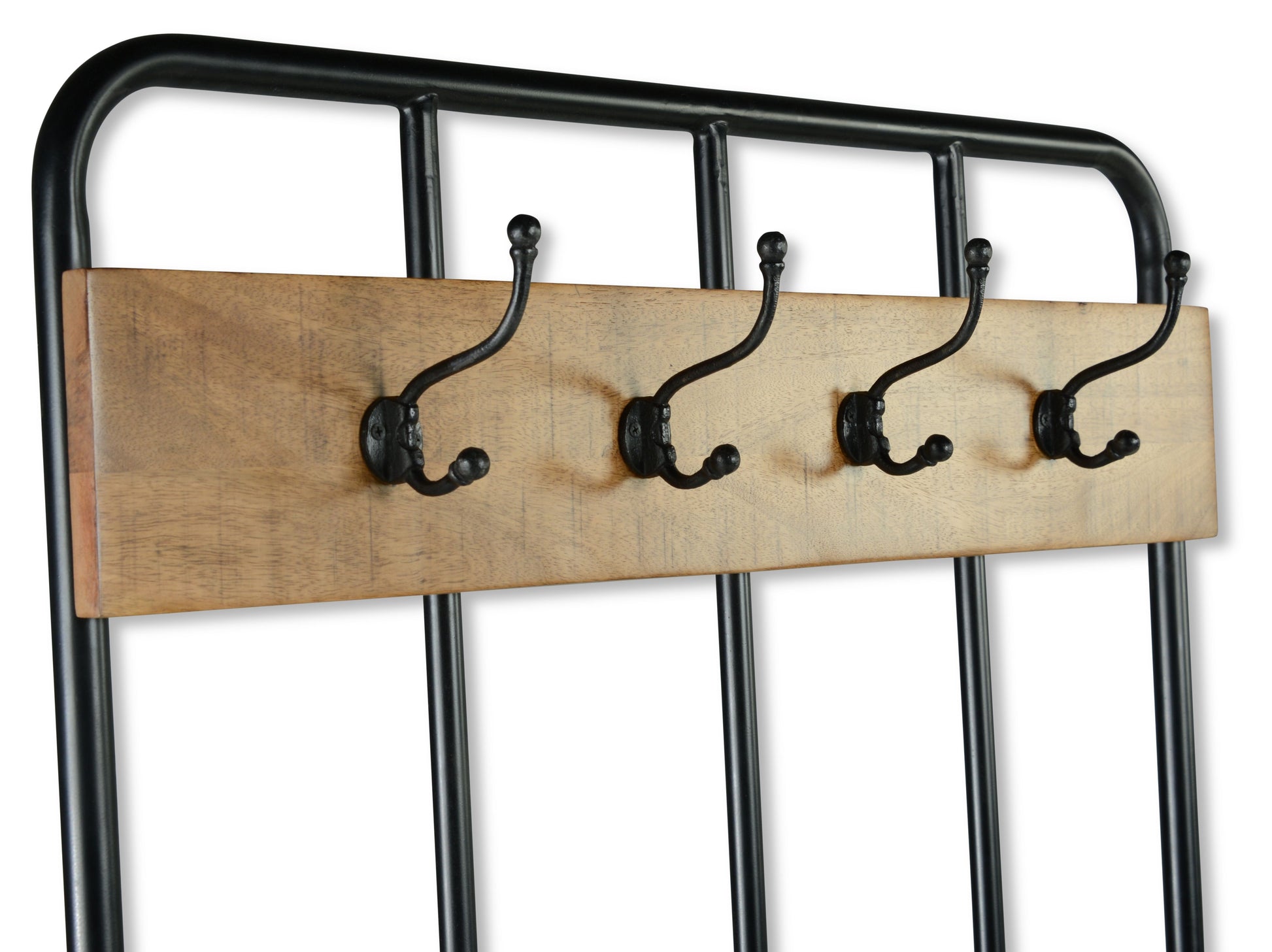 An organizing Hall Rack to store all your outside items quickly and conveniently. Constructed of mango wood and sturdy black iron, the Camion offers four hanging hooks for coats and two large shelves for boots, sweaters, or other bulky items. Clean lines and classic style make this unit great for traditional, farmhouse or transitional interiors. A must-have accessory especially during the winter months.