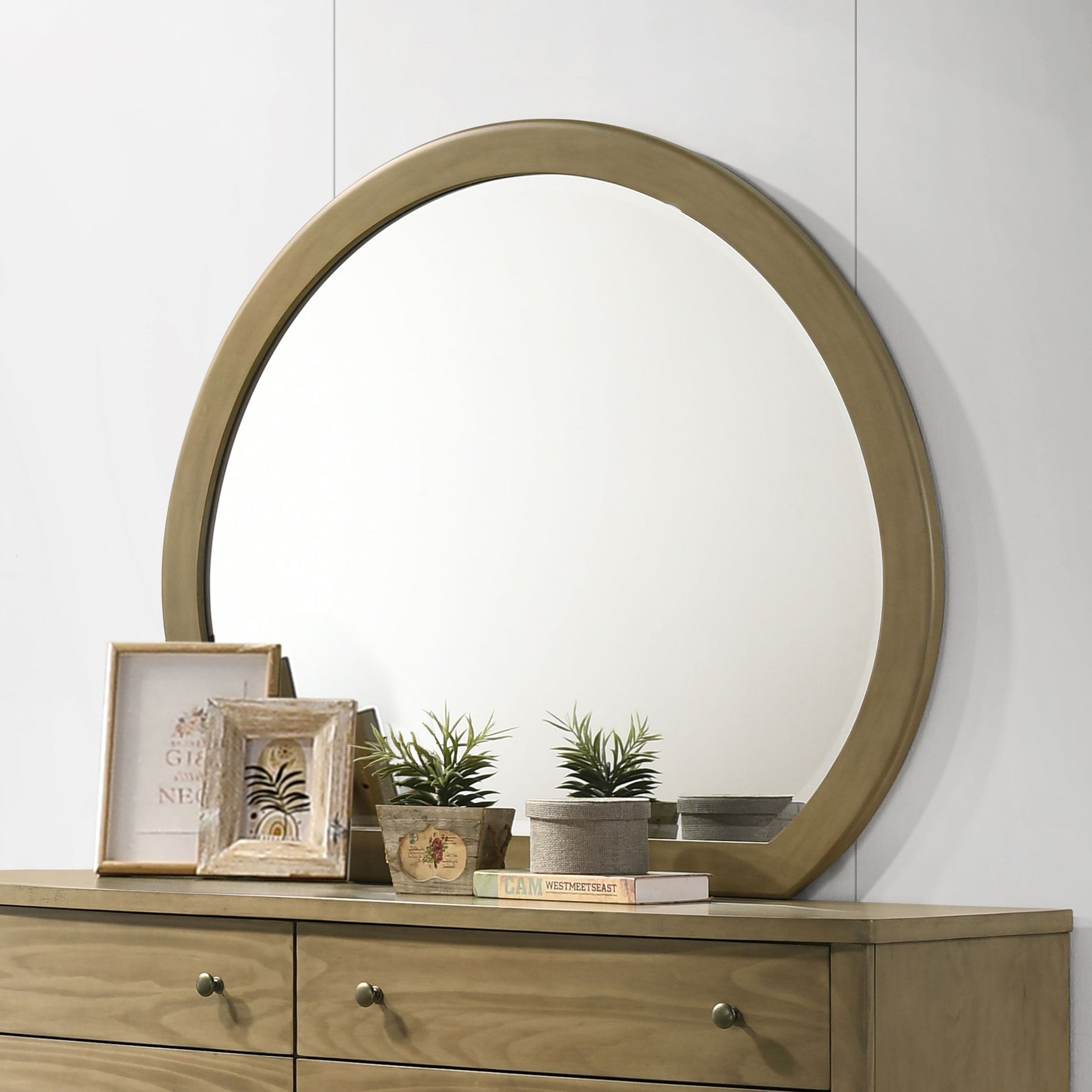 Complete your bedroom decor with this stylish dresser mirror, a perfect blend of classic and modern design elements. The mirror features a natural pine finish that complements the solid pine wood construction of its matching dresser. Its round shape adds a unique and elegant touch, enhancing the visual appeal of any room. The mirror's smooth surface offers excellent reflectivity, brightening your space and adding depth.