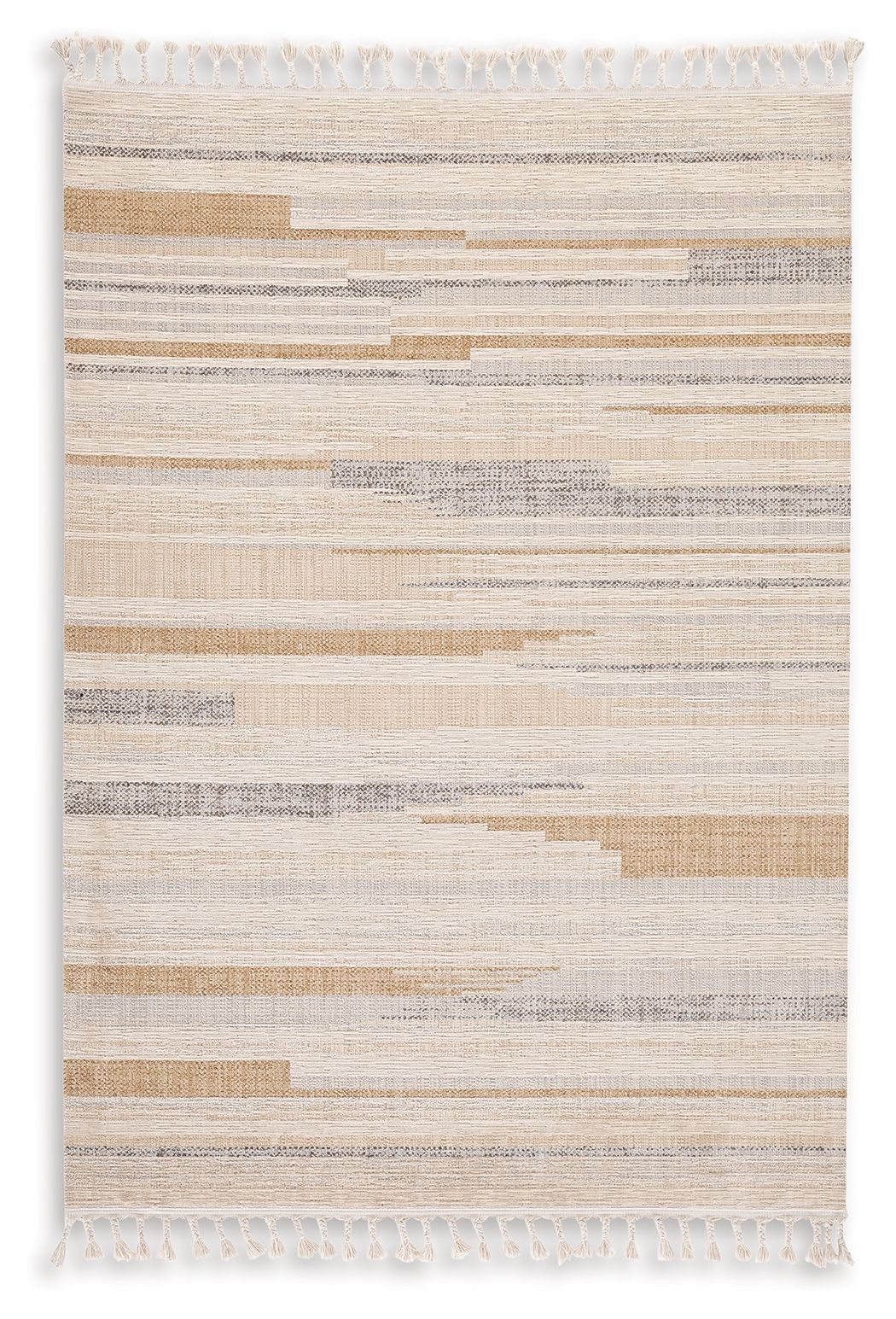 Linear imagery and neutral hues in this area rug evoke a casual-chic vibe just perfect for modern, contemporary interiors. Soft comfort underfoot delights the senses and the finished tassel edges add just what you need for a subtle focal point wherever it’s displayed.