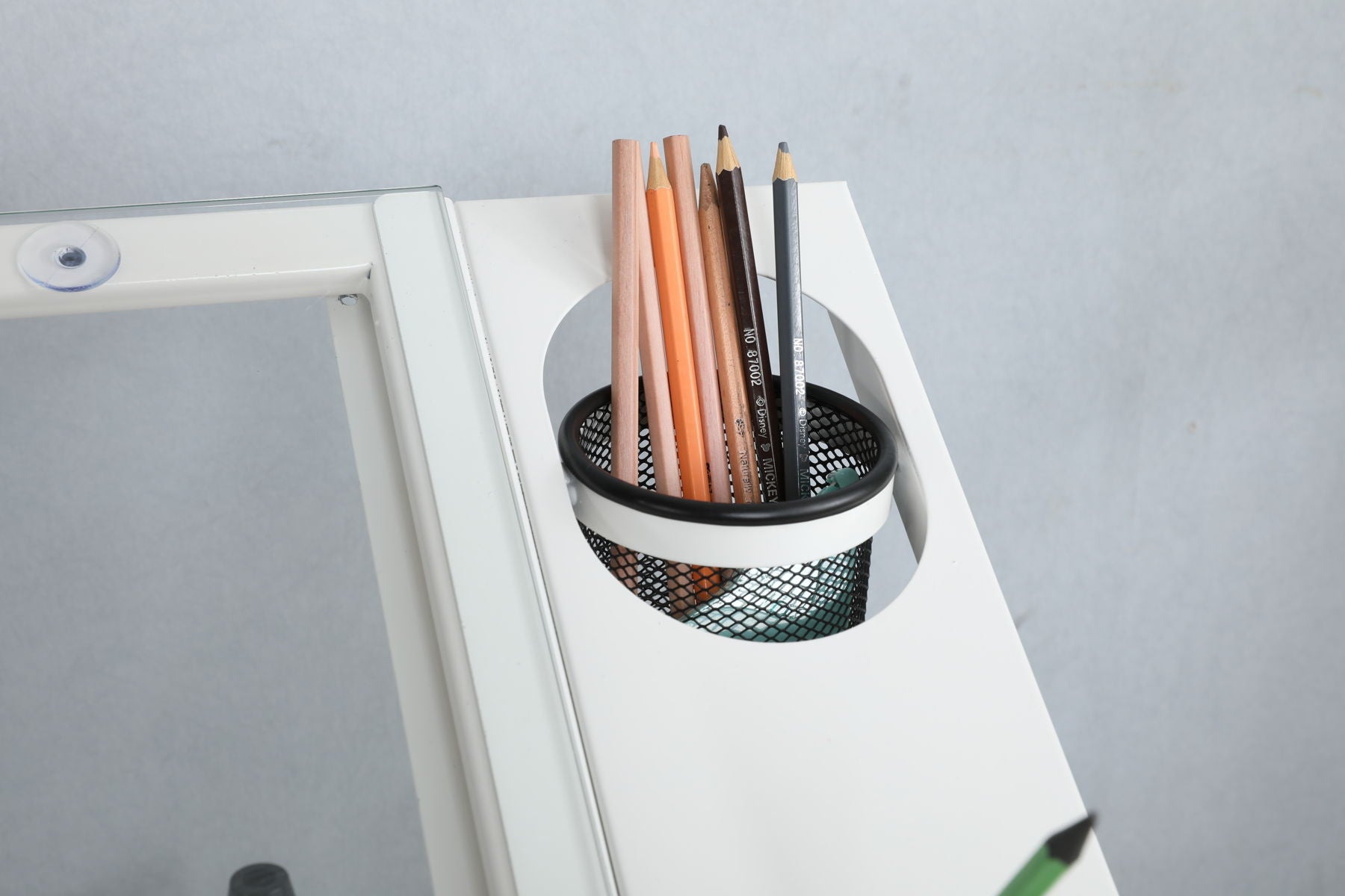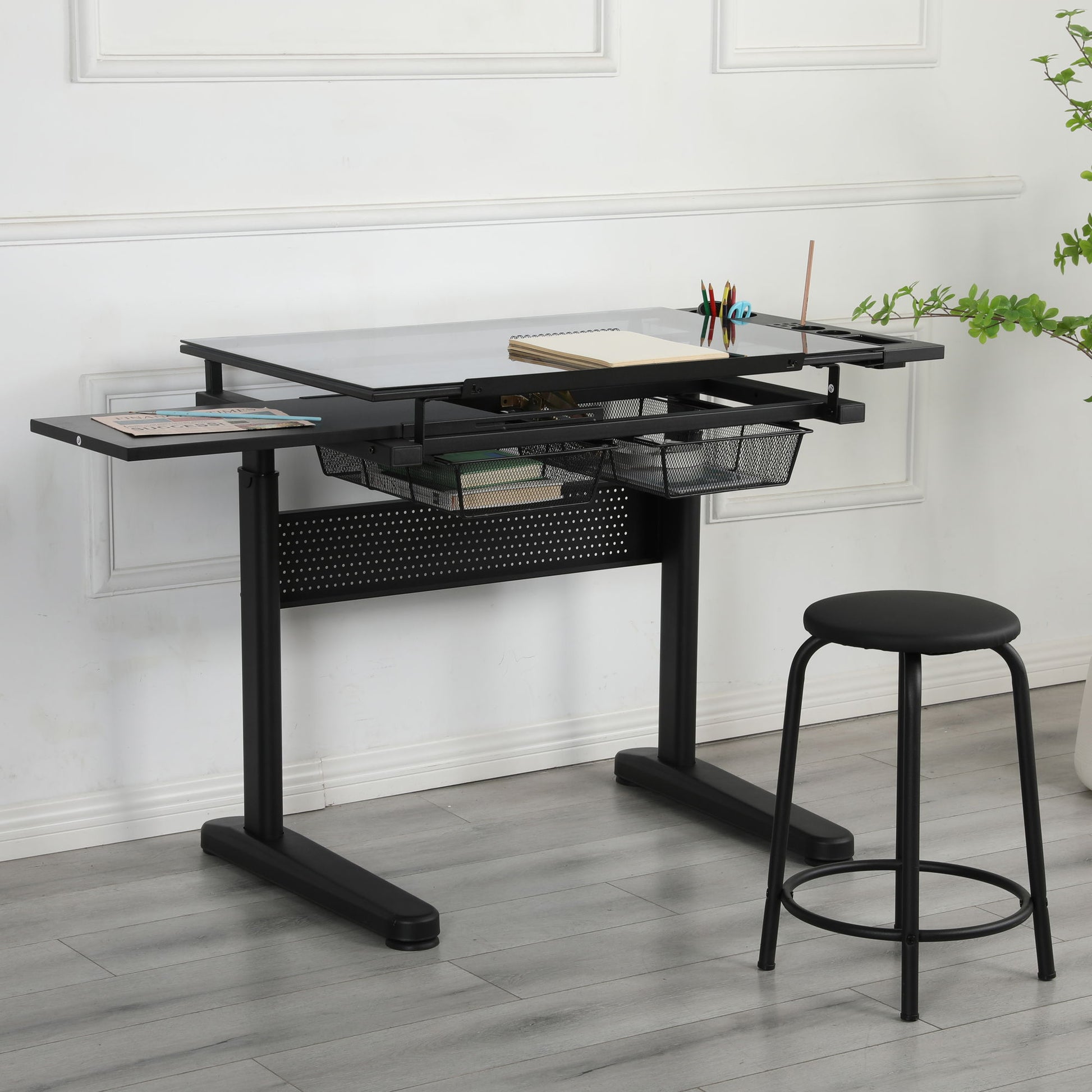 Convenient Height Adjustment System: Hand-operated device adjusts table height from 75-120cm. Tiltable Tempered Glass Desktop: 5mm thick glass top tilts up to 75 for versatility. Ample Storage Space: Features two large metal drawers and side storage strips. Extended Desktop: Pull-out E0 grade MDF material desktop for extra storage. Adjustable Table Legs: Equipped with adjustable angles for uneven floors, includes stools.