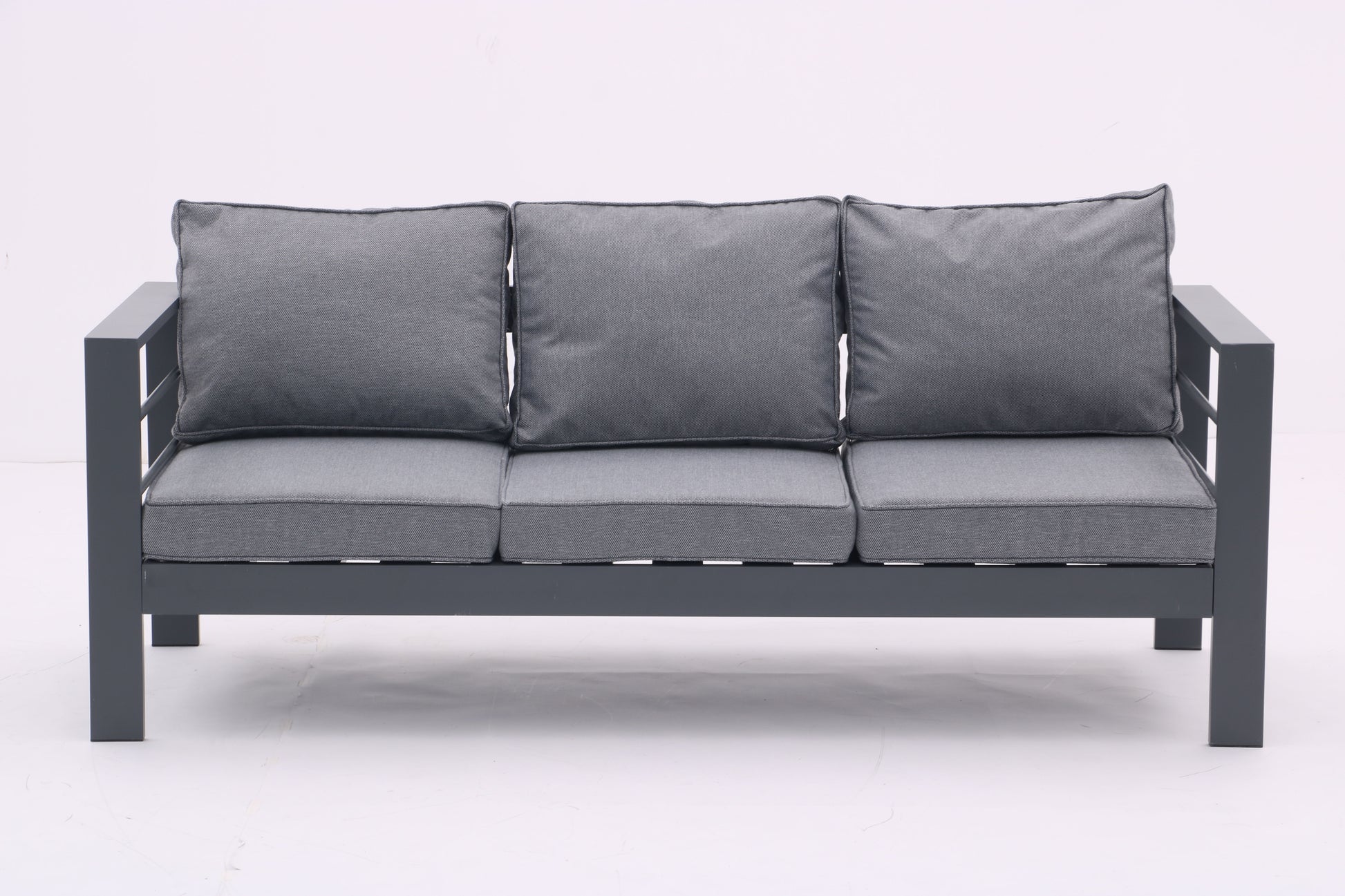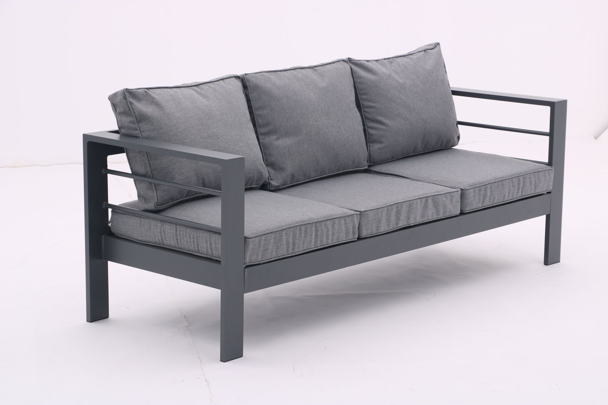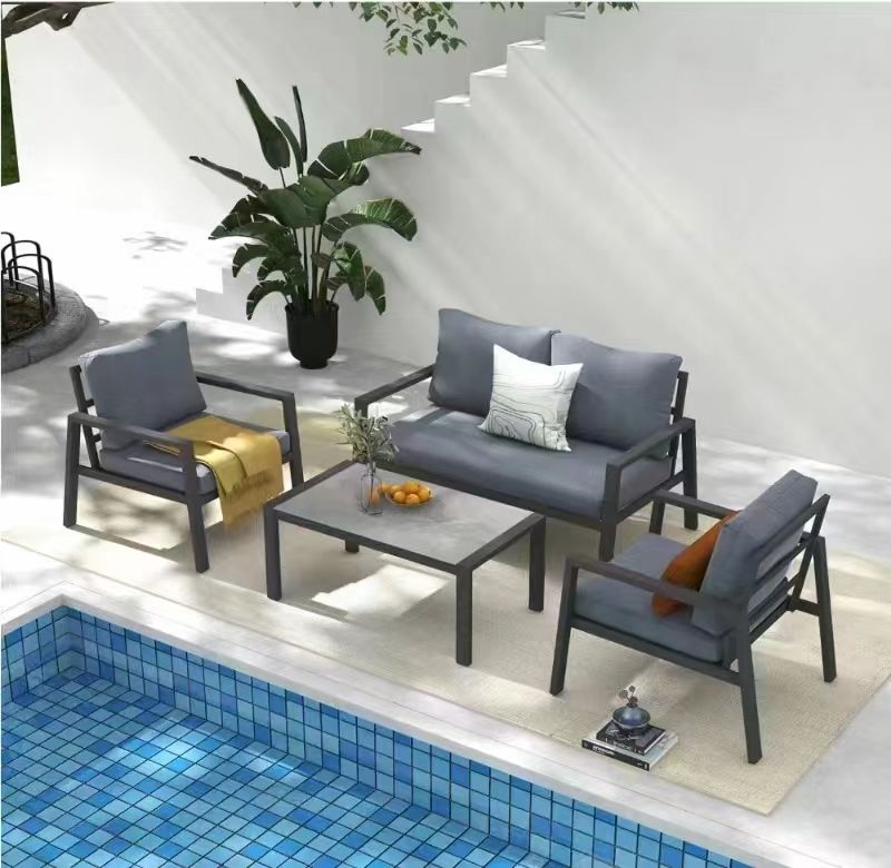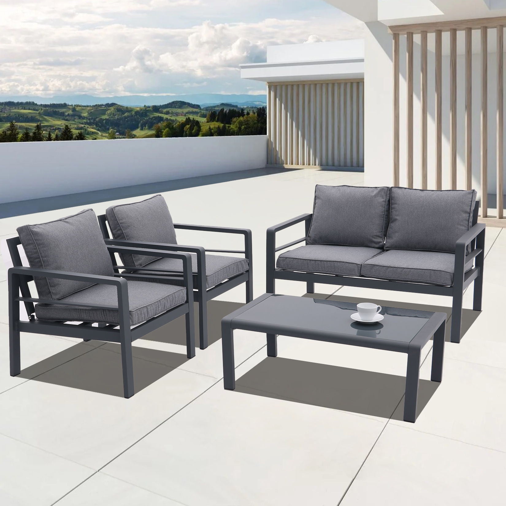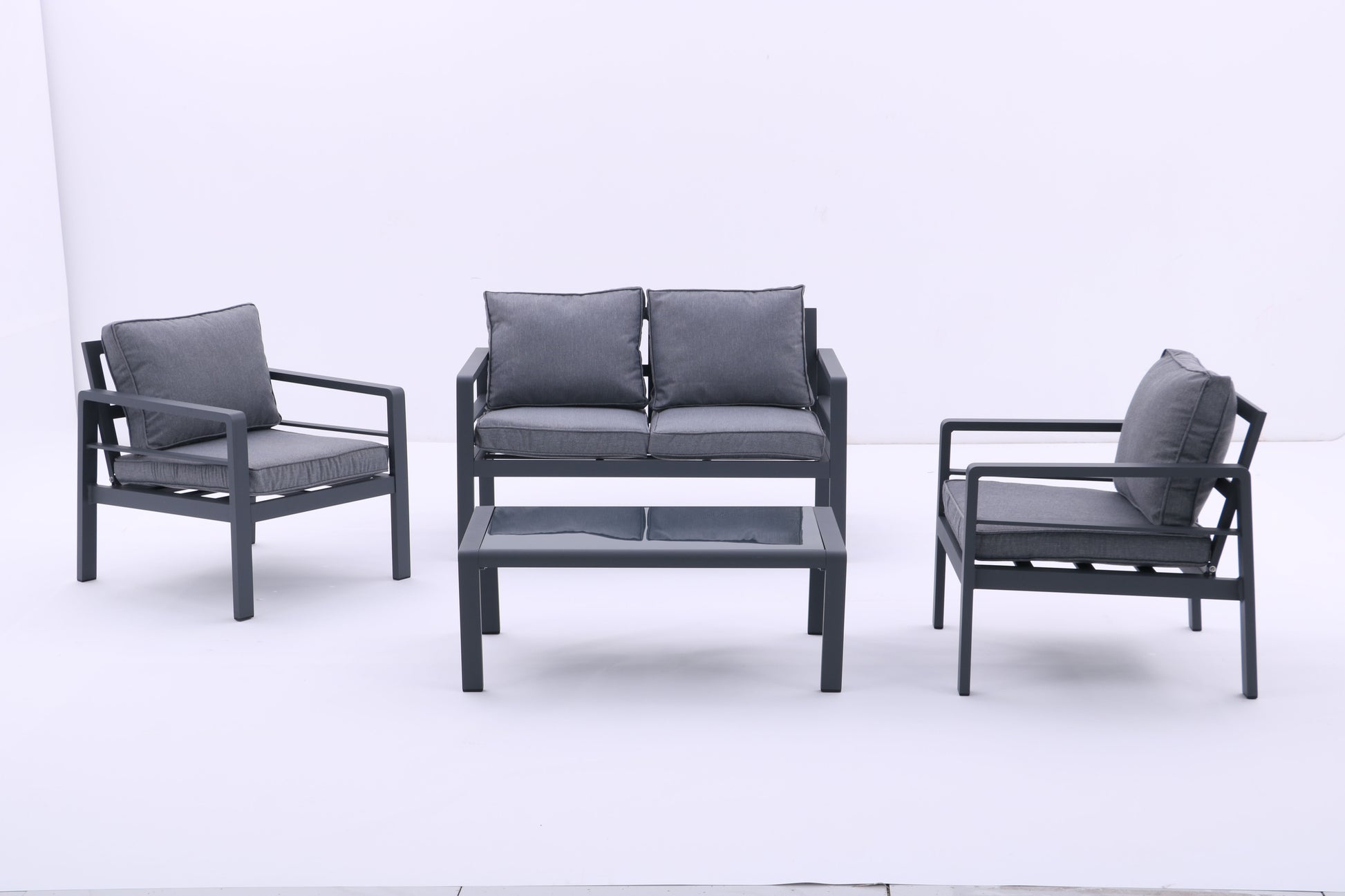Chic Minimalistic Design: This 4-piece aluminum outdoor conversation set features clean-cut lines and a minimalistic look that complements any garden landscaping. Durable and Sturdy: Made with smooth aluminum frames, this set is lightweight yet strong, featuring fireproof, waterproof, and formaldehyde-free materials for long-lasting durability. Comfort and Convenience: Padded cushions and backrest pillows filled with high-resilience sponge provide maximum comfort, while the tempered glass-top table offers ample space for drinks, snacks, and decorations. Easy Maintenance: The aluminum parts are easy to clean, cushion covers are removable and machine washable, and the tabletop can be readily cleaned with a shine. Simple Assembly: The set includes necessary tools and hardware for easy assembly according to the provided instructions.