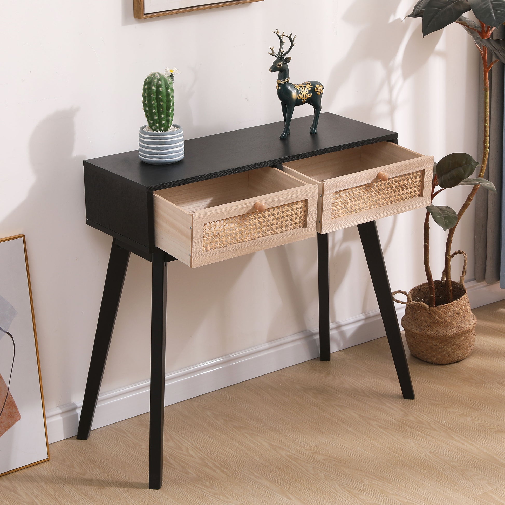 Side Table With Two Real Rattan Drawers, Solid Wood Table Legs, Can Be Used In The Dining Room, Living Room, Bedroom, Entrance - Natural / Black