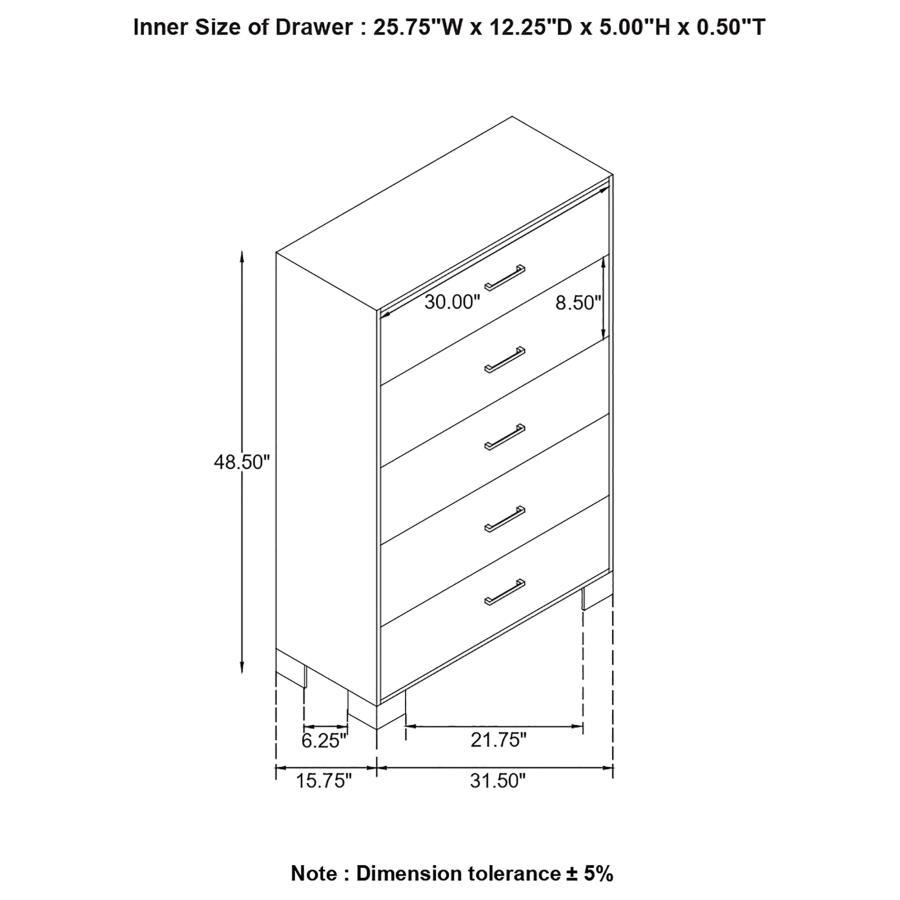 Turning a modern guest or master suite into a forested retreat, this tastefully designed chest adds to the overall essence of a classic space. Notable gradations stand out in the rustic pine finish of this five-drawer chest. Strive for a cabin motif in this contemporary chest with dark bronze matte metal hardware and linear styling. Finished drawer boxes with front and rear English dovetail construction and center drawer glides ensure smooth operation, as drawer space is plentiful in creating room for essentials. This inspiring chest transforms a conventional space into a woodsy cabin setting.