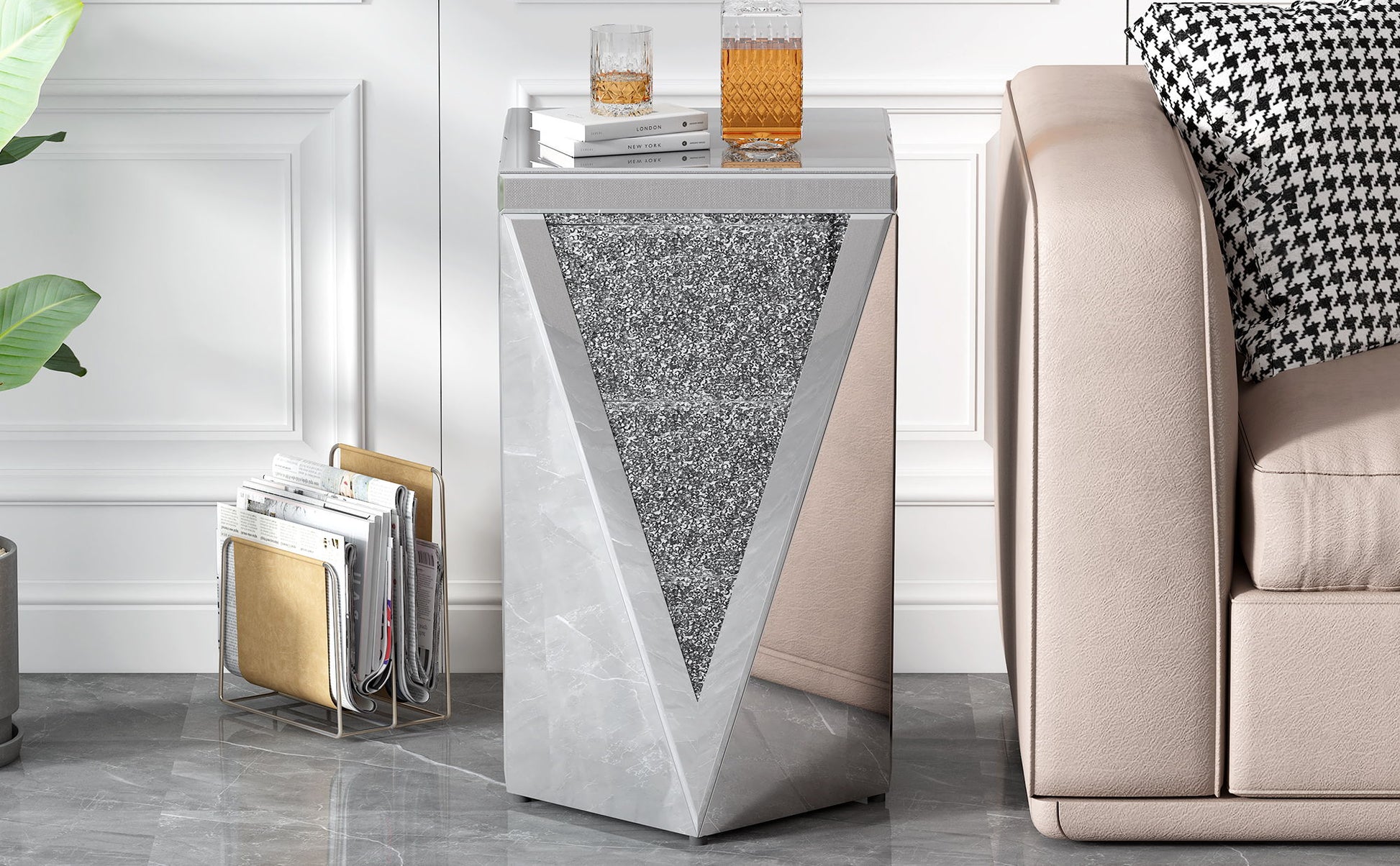 Square Mirrored End Table, Modern Side Table With Crushed Diamond For Living Room - Silver