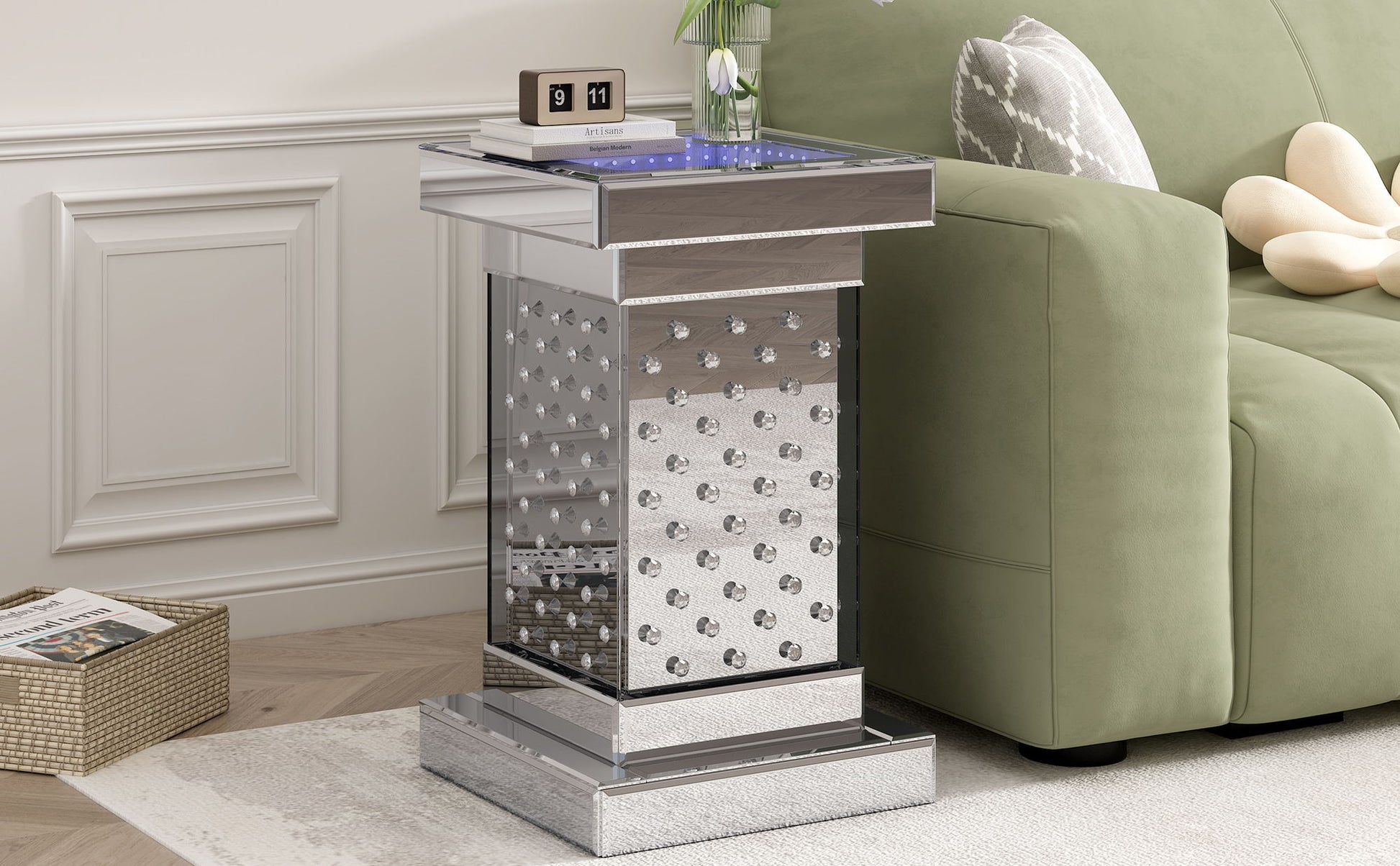 Elegant Design: Clad in high-quality transparent tempered glass and mirrored glass, this end table reflects its surroundings, creating a sense of depth and space. LED Lighting: Features built-in LED lights with eight different colors and adjustable brightness, controlled via remote, for customizable ambiance. Crystal Accents: Adorned with meticulously placed crystal inlay accents that add a touch of opulence and sparkle in the light. Sturdy Construction: Crafted with a high-quality MDF inner frame, ensuring durability and the ability to support various items. No Assembly Required: Comes fully assembled and can be easily moved, making it versatile for placement beside a sofa, bed, or in a hallway.