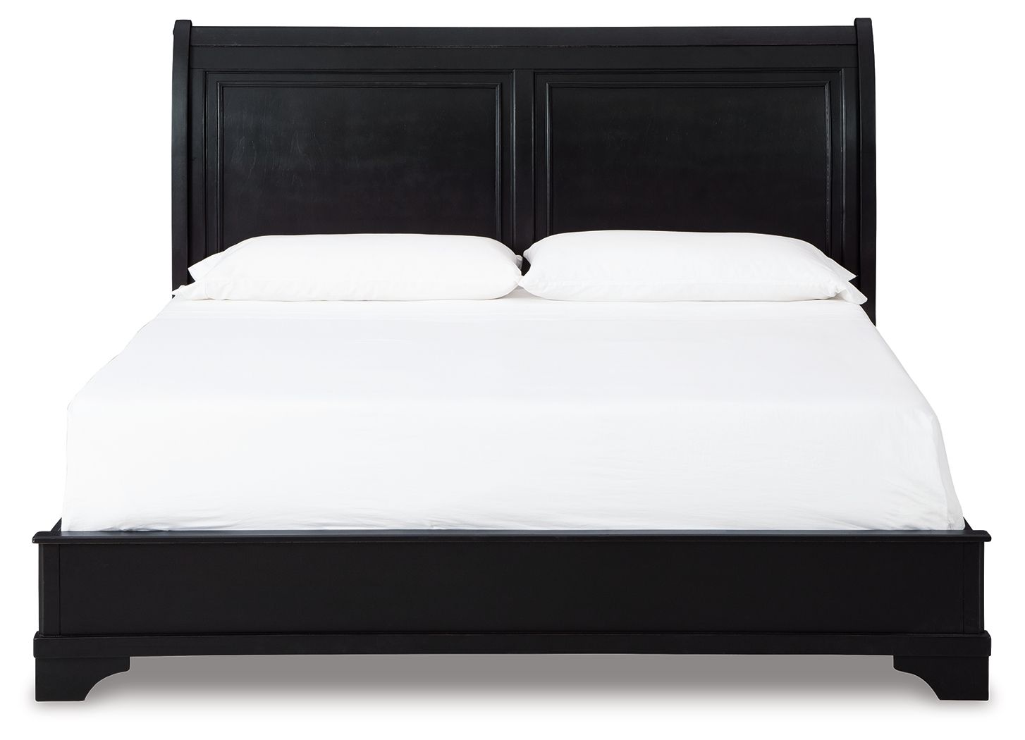 This sleigh bed has a timeless look and traditional design that dresses up your bedroom. Its black finish adds a casual aesthetic, while the sleigh headboard with double-framed panels is offset by a low-profile footboard. Timeless traditional design. Made with hardwood solids, MDF substrate and select hardwood veneer. Finished with a stain for a trend-rite casual aesthetic. Drawers feature clear sealed interiors, dovetail construction and metal ball bearing side glides. Framed drawer fronts with round metal knobs finished in a dark bronze coloration. Bed features a sleigh headboard with double framed panels and choice of a low profile footboard or storage footboard.
