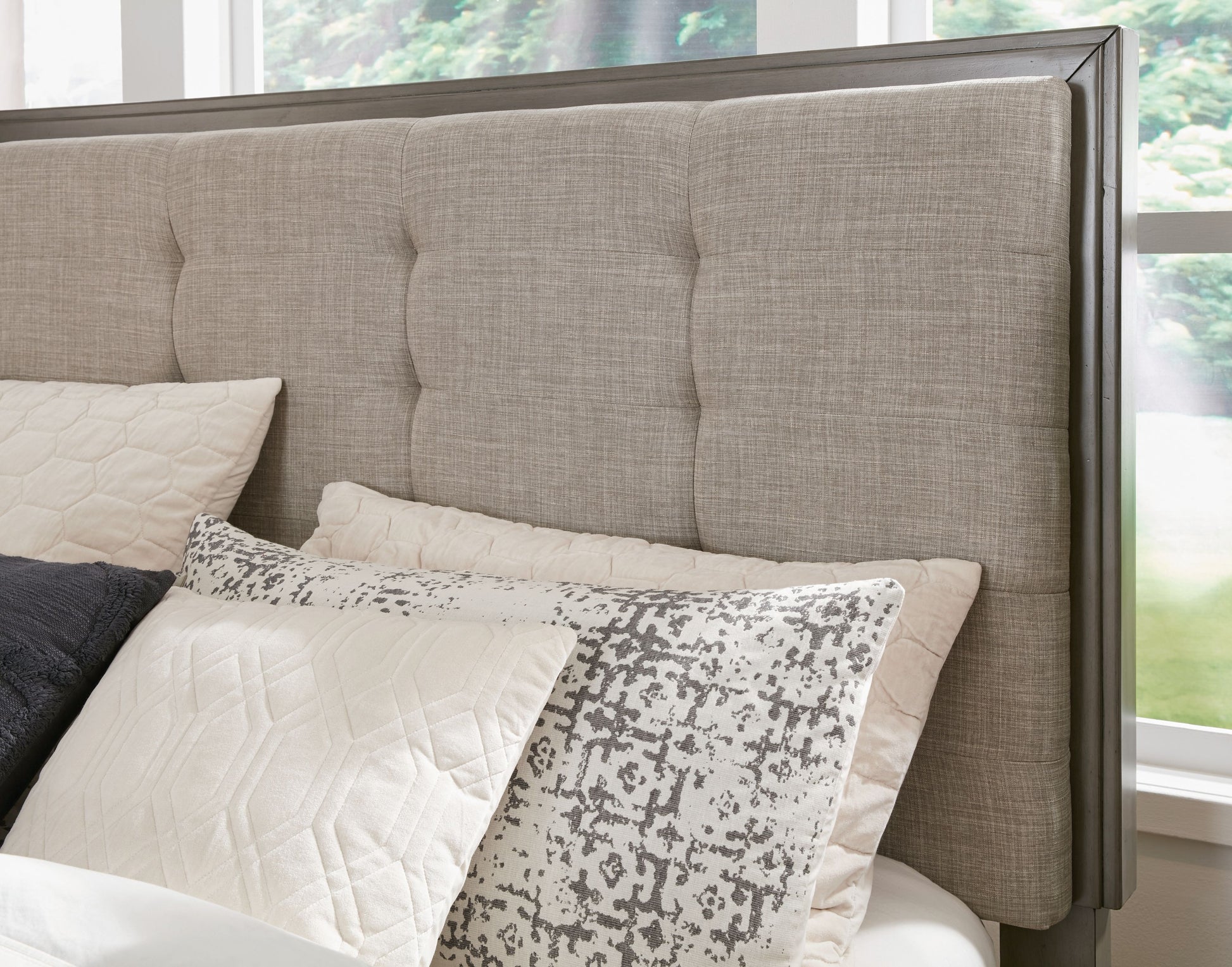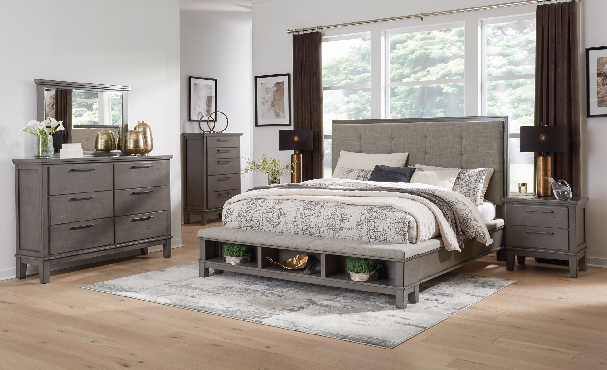 Loaded with structured style and a touch of edgy flair, this queen upholstered storage bed suits those with casually cool attitudes. Dressed in an antiqued gray finish, its thick padded headboard and light gray upholstery keep the simple design fresh. The footboard sports three cubbies and an upholstered bench for an instantly classic storage solution. Casual lifestyle design. Made with Acacia solids and veneer with engineered wood substrate. Sturdy case silhouettes have thick profiled tops and hefty tapered feet with a casual antique gray washed finish. Fully finished, dovetail drawer box construction with metal ball bearing side glides and metal bar pulls. The bed features thick padded headboard with cushioned side rails and integrated storage footboard bench upholstered in a light gray woven polyester fabric.