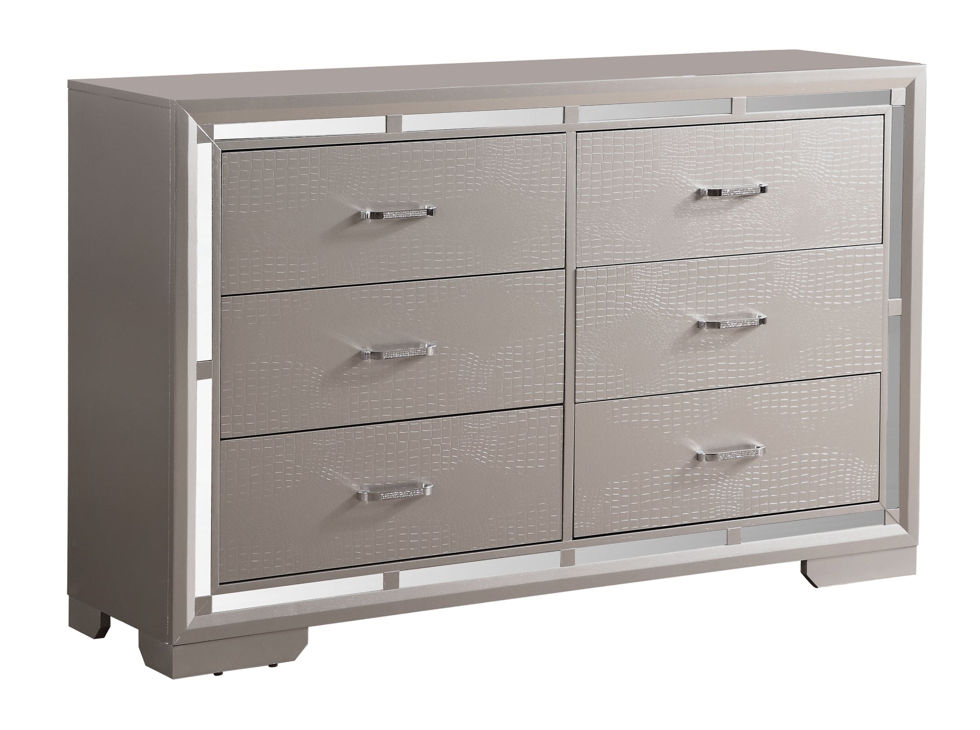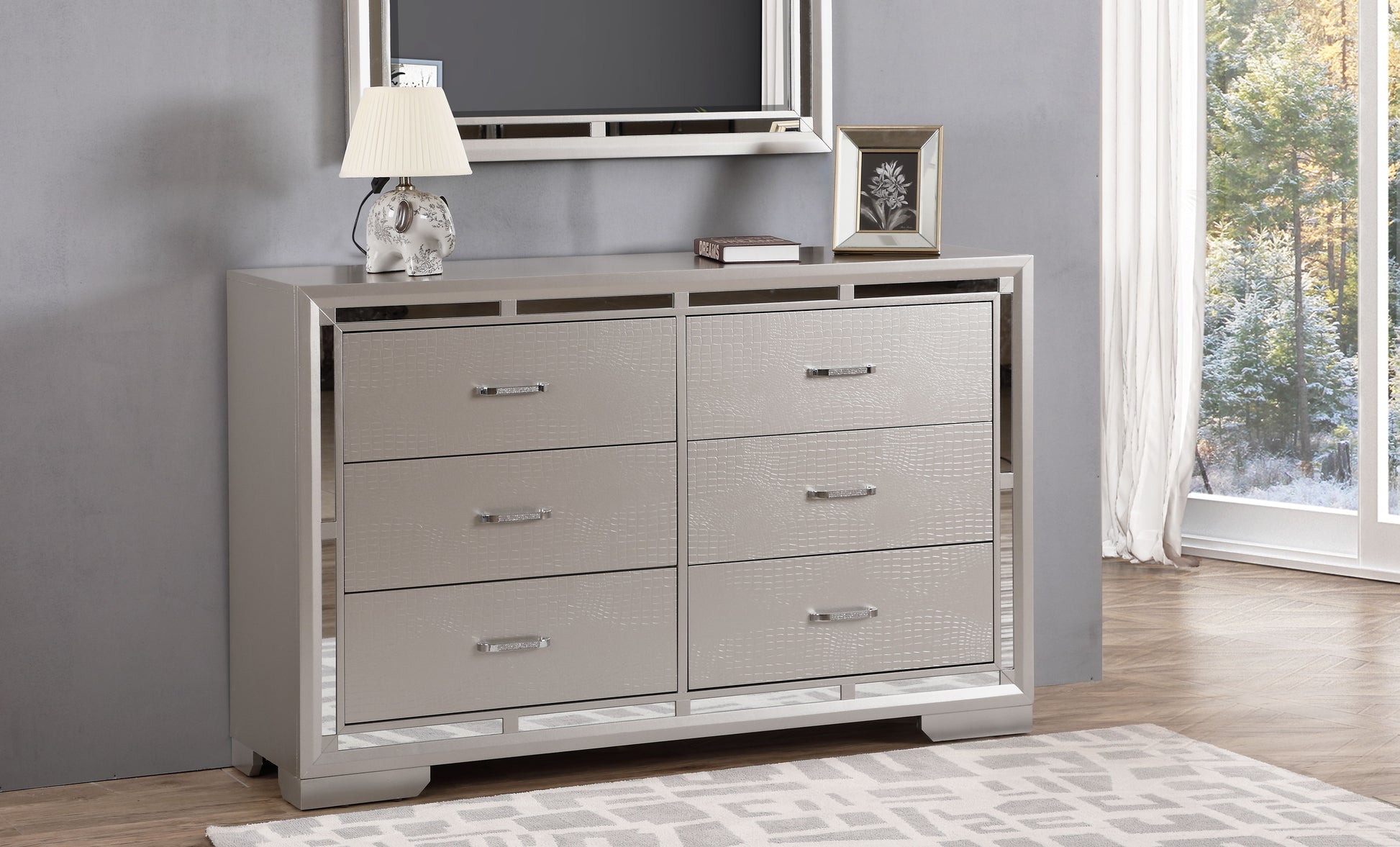 - Jeweled Chrome Hardware, Mirror Accents and Croc Finish are Featured on this Classic Glam Look