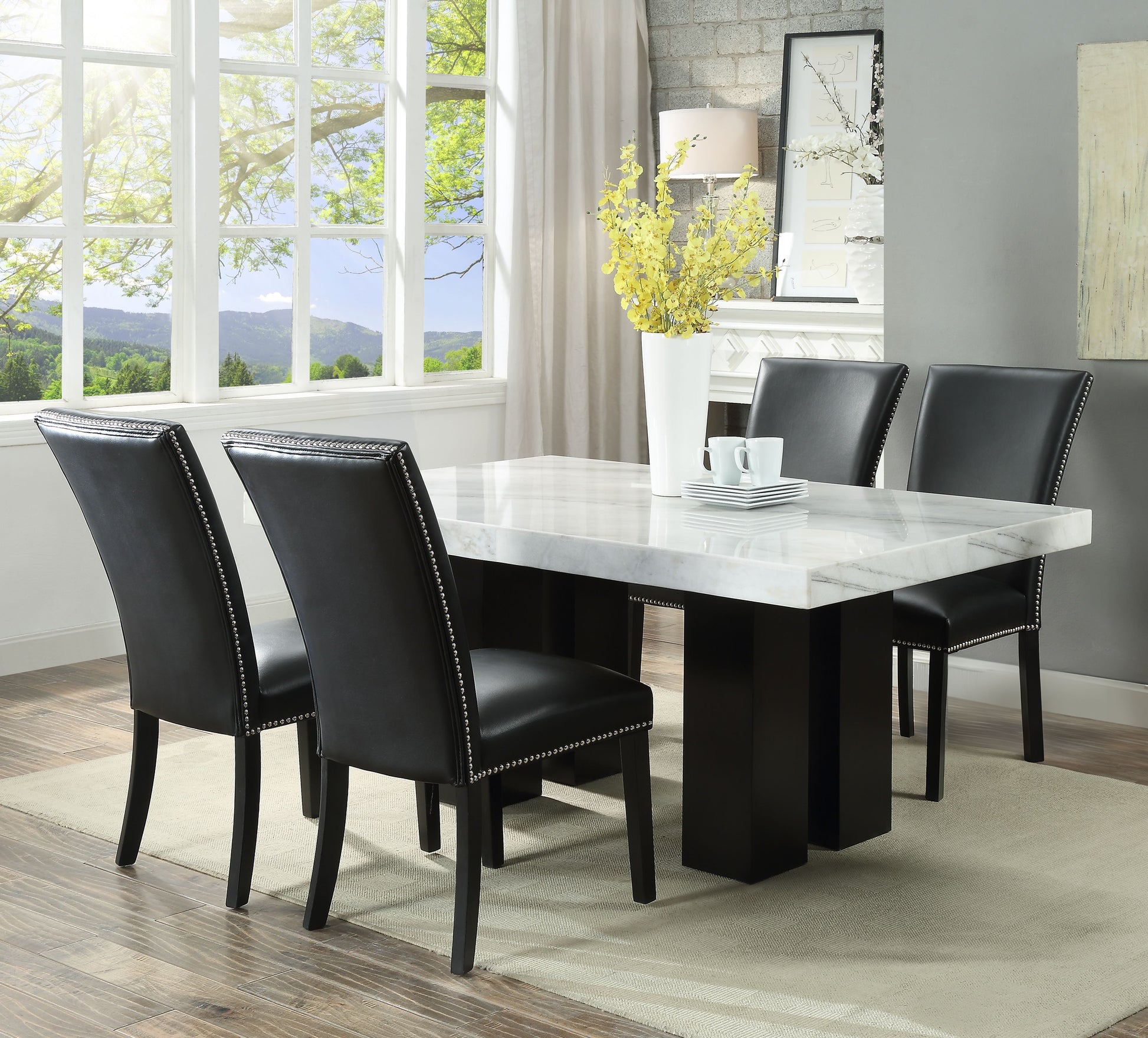 The Camila dining set, a modern twist on elegant evenings, invites you to linger in both comfort and style. A symphony of marble, its delicate streaks like whispered secrets, graces your table. Sleek vegan leather chairs, adorned with rebelliously glinting nailheads, embrace you in plush comfort. The 70-inch table whispers intimacy, fostering easy conversation and laughter-filled moments. And those chairs? Pure, unadulterated comfort, where lingering becomes a pleasure, not a chore. Modern, chic, and undeniably alluring, where comfort meets sophistication, Camila creates an experience both unforgettable and inviting.