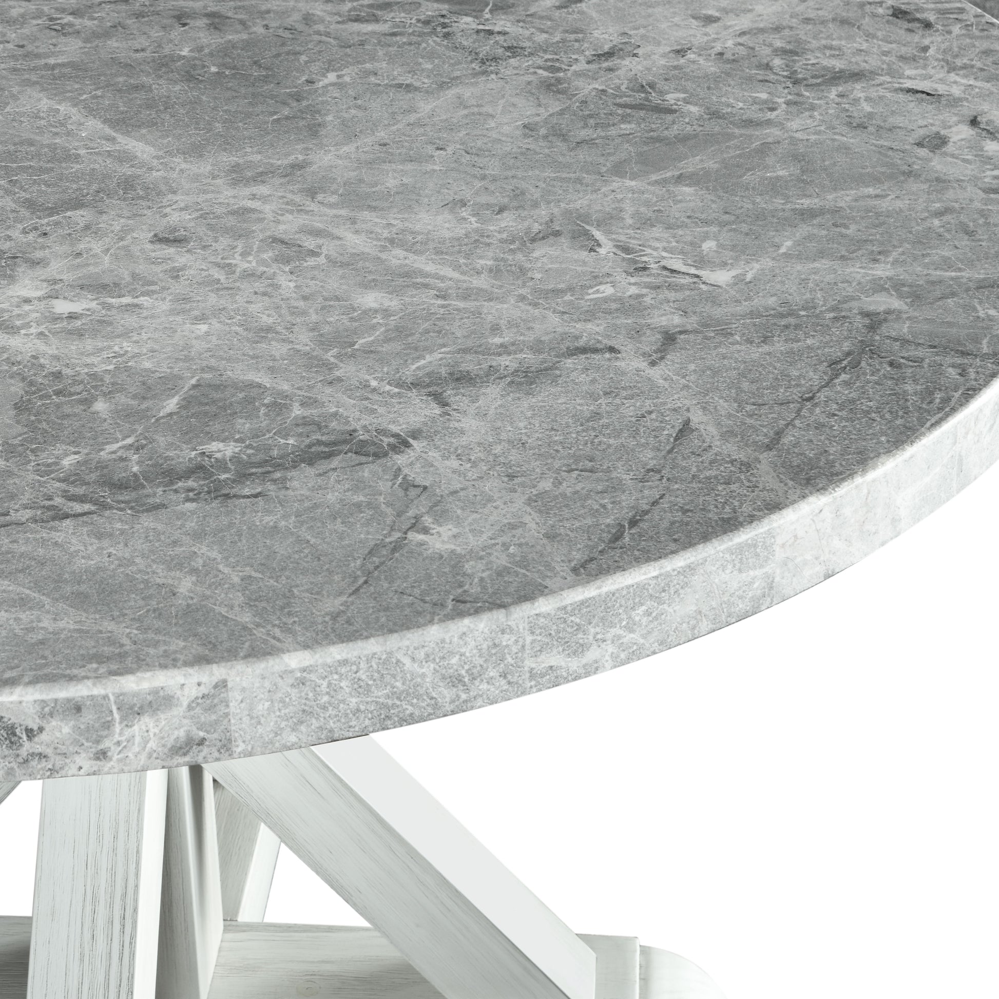 A 52-inch round table with a refined rustic style that combines the polish and beauty of a gray marble top with the rustic complement of a white timber-beam trestle base to form the centerpiece of this charming dining room set. White veining in the gray marble table top blends beautifully with the white finished table base and chairs for a harmonious design that seats up to four. The white and gray microfiber chair matches the set in an easy-care and comfortable seat. The casually elegant style of the table will fit beautifully in farmhouse, cottage, ranch or traditional settings and can be paired with the optional Canova Server for a full dining set.