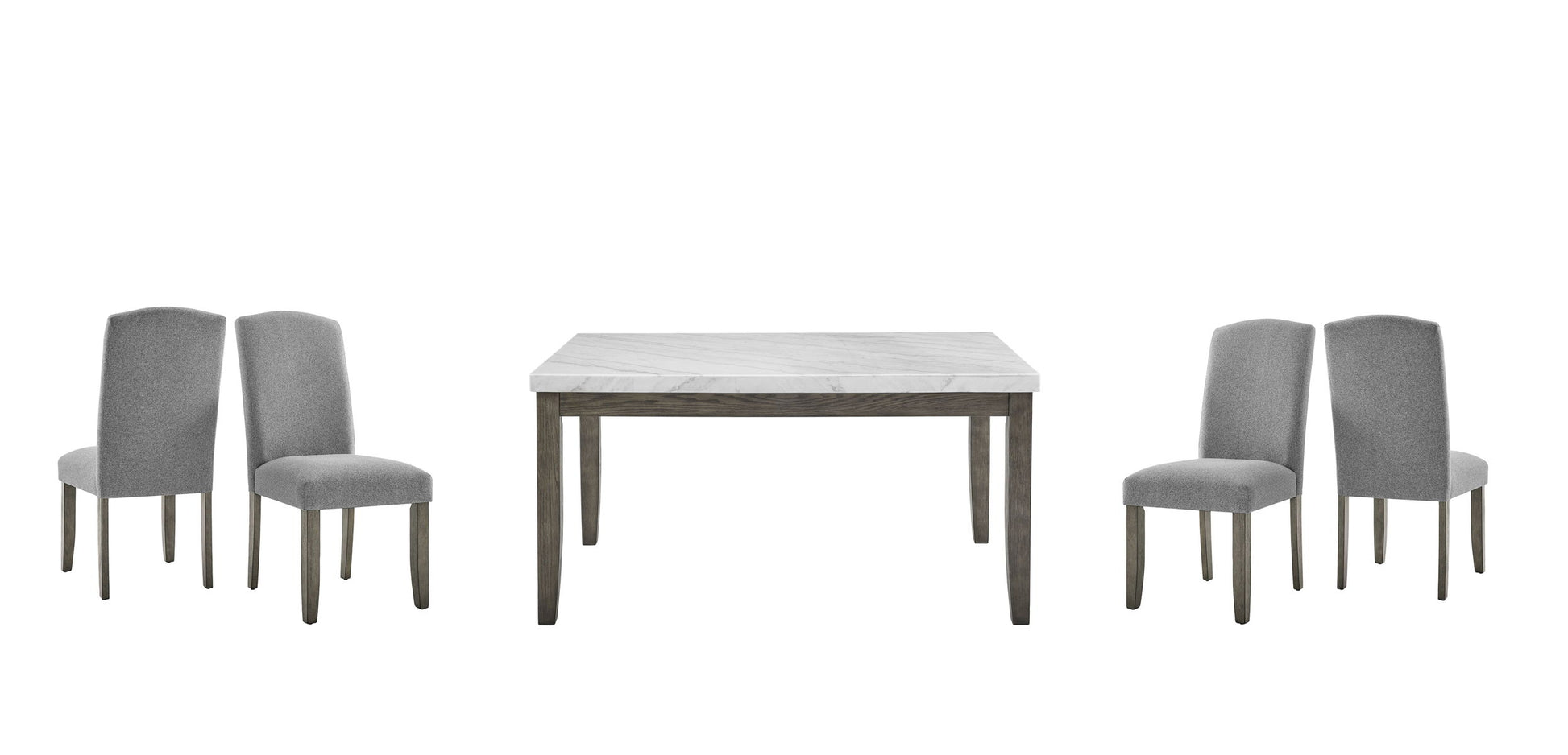 Beautiful transitional styling in a white marble dining set, Emily offers fashion-neutral styling that adds casual elegance to any dining area. A visually seamless natural marble top blends effortlessly with the mossy finish on the grey upholstered Side Chair to create a subtle contrast that adds that just the right dash of design to this stunning dining set. Bring grace and looks to your everyday dining with the Emily dining set.