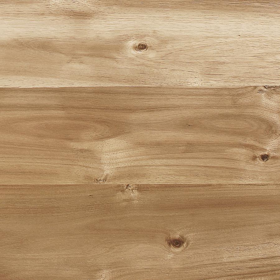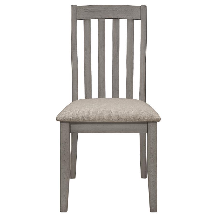 Place this modern farmhouse style dining set in a home for a more elegant look.Complete with a long table and four chairs, this dining set comes in a two-tone finish of a coastal and natural acacia wood finish.Each of the four chairs offer a curved slat style backrest and a padded seat, wrapped in a grey linen-like upholstery.The table adds a striking, contemporary vibe with its flared legs outward beveled edges.Invite the family to enjoy a casual meal and catch up with each other's lives.