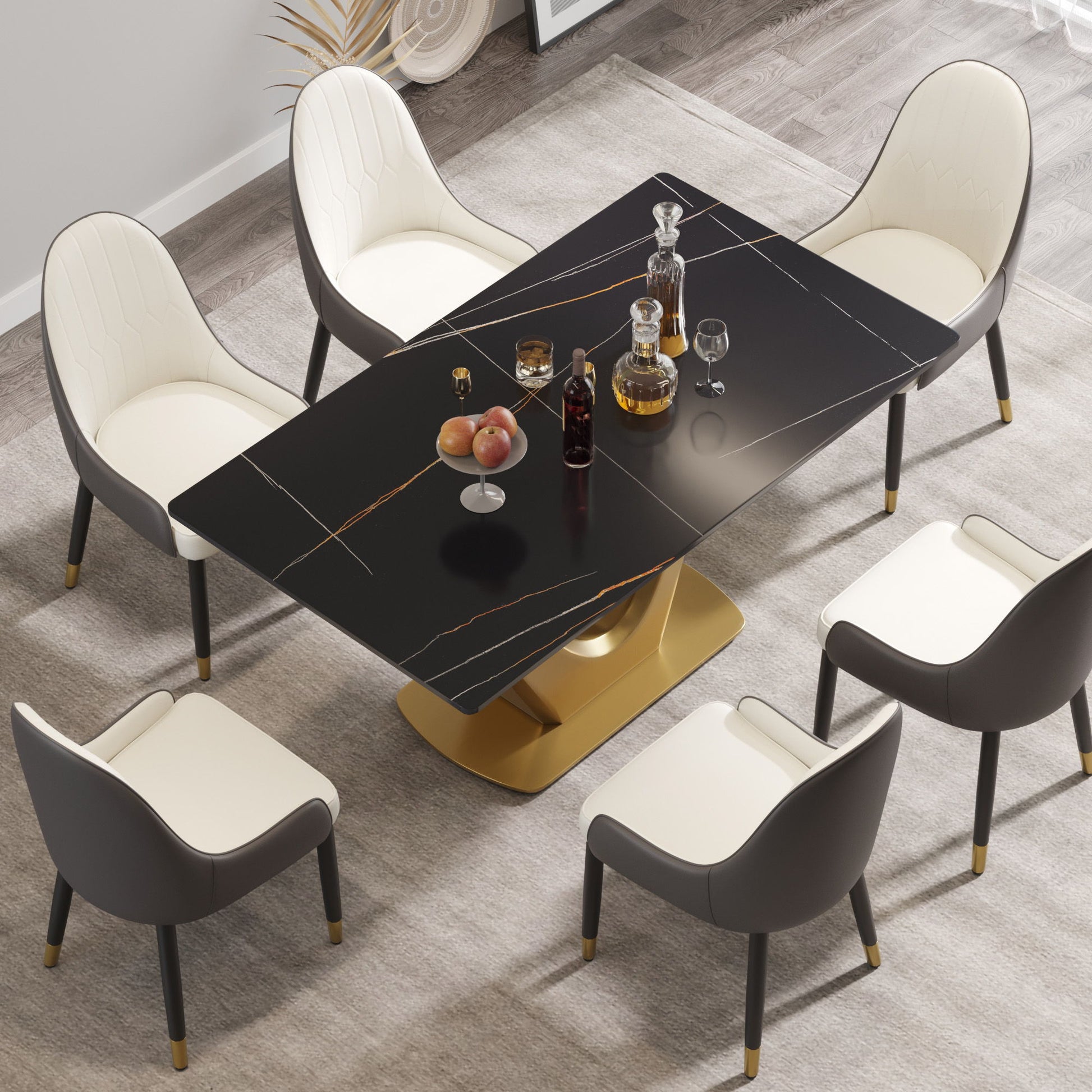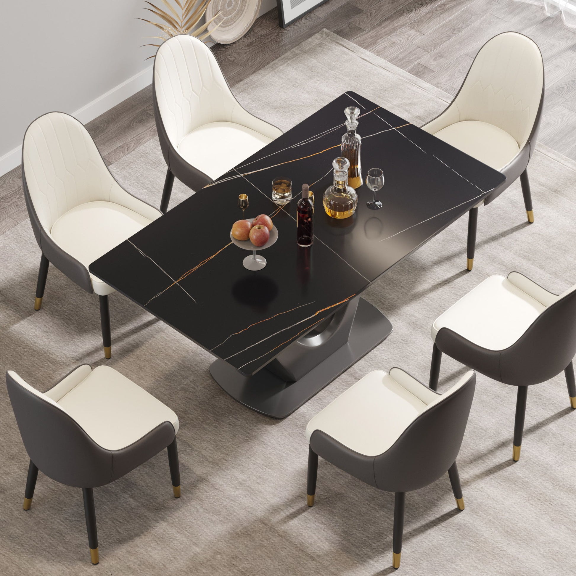 Exquisite Craftsmanship: Made of artificial stone with intricate craftsmanship, this dining table exudes a noble and beautiful aesthetic. Spacious Design: With a 63-inch long panel, this table offers ample dining space for 6-8 people, perfect for family gatherings. Rugged & Durable: The 12mm thick sintered stone tabletop is heat and pressure resistant, preventing burns, stains, and scratches for long-lasting use. Stable Base: Featuring a V-shaped base design, this table not only looks elegant but also enhances stability for an enjoyable dining experience. Easy Maintenance: The anti-fouling surface is easy to clean, with low water permeability making it resistant to oil and liquid spills.