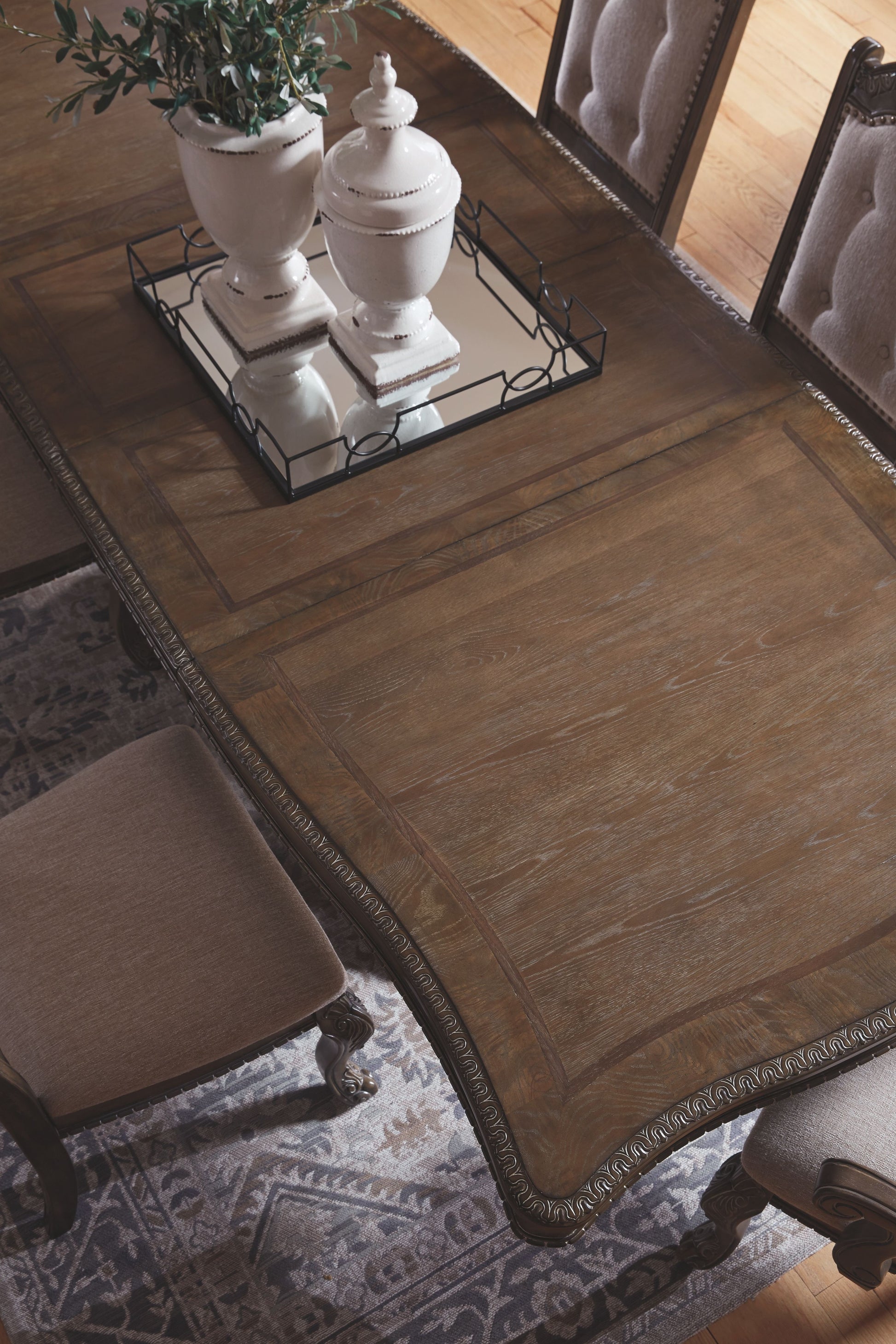 This dining room table’s uniquely luxurious interpretation of traditional style says it all. Beautifully ornate elements include multiple inlaid borders, softly rounded corners and scrolled acanthus accents. Exquisitely detailed and treated to a multi-hued finish, it’s clearly a labor of love. The double pedestal base and extension tabletop expand to serve your seating needs exceptionally well.