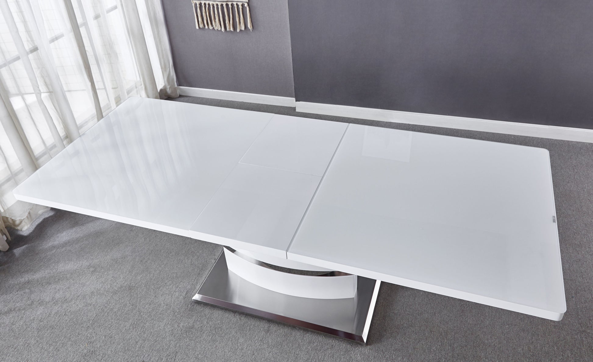 - Modern and stylish design - Crafted from resilient MDF with a brilliant white high gloss finish, this contemporary dining table features a wide pedestal leg with chrome strips and a brushed metal base for a stunning look.