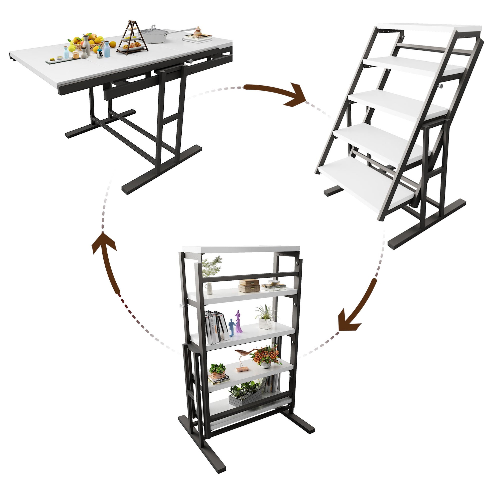 Solid Mahogany Wood Multifunction Convertible Dining Table, Free Switch Space Saving Table Shelf For Home And Studio - White