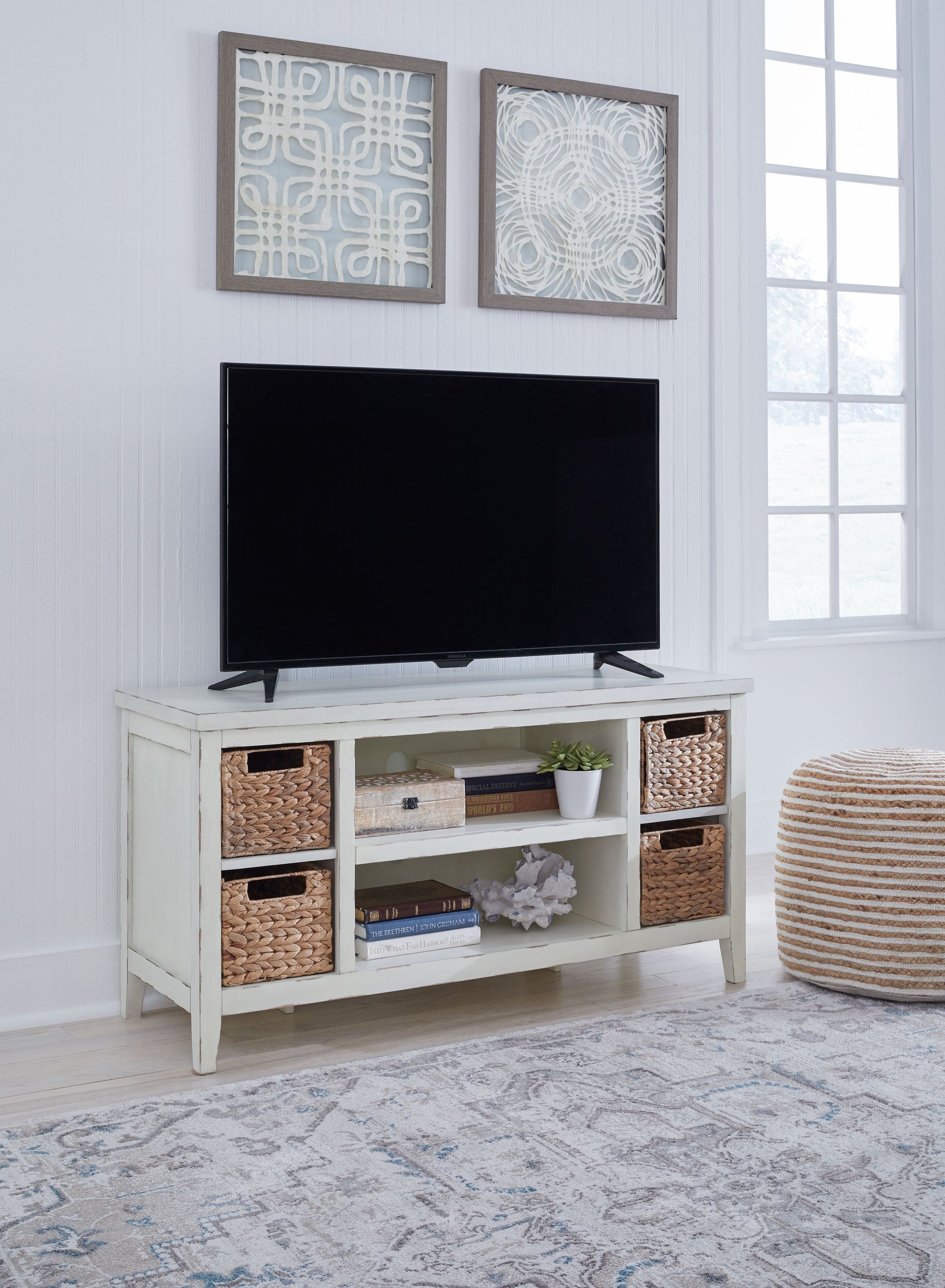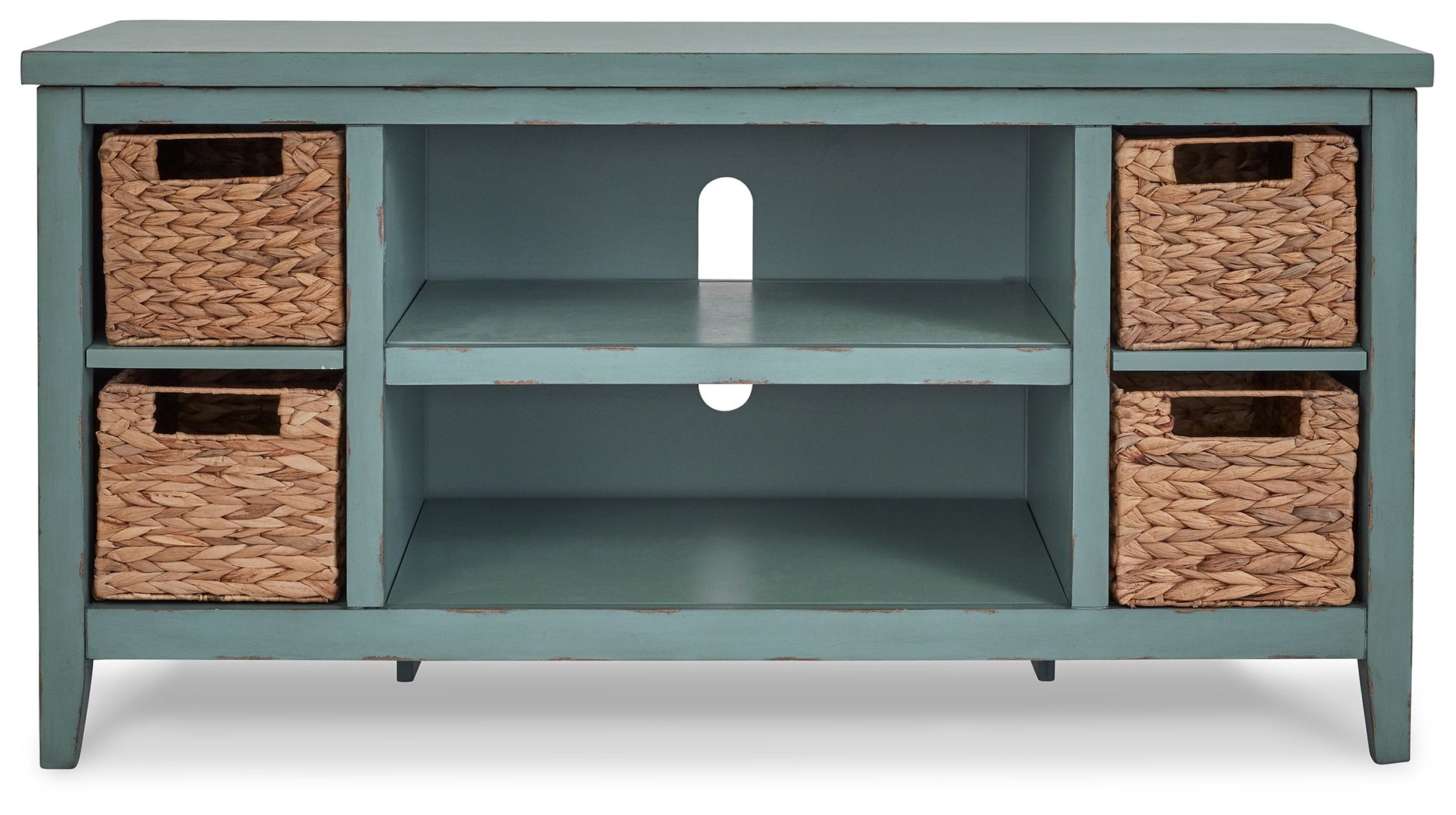 Bring the vintage casual vibe you love to the living room with this TV stand. A stylish storage solution. This charming piece completes your entertainment area with ease. Open shelves and the included handwoven baskets provide an effortlessly beautiful look with endless possibilities.