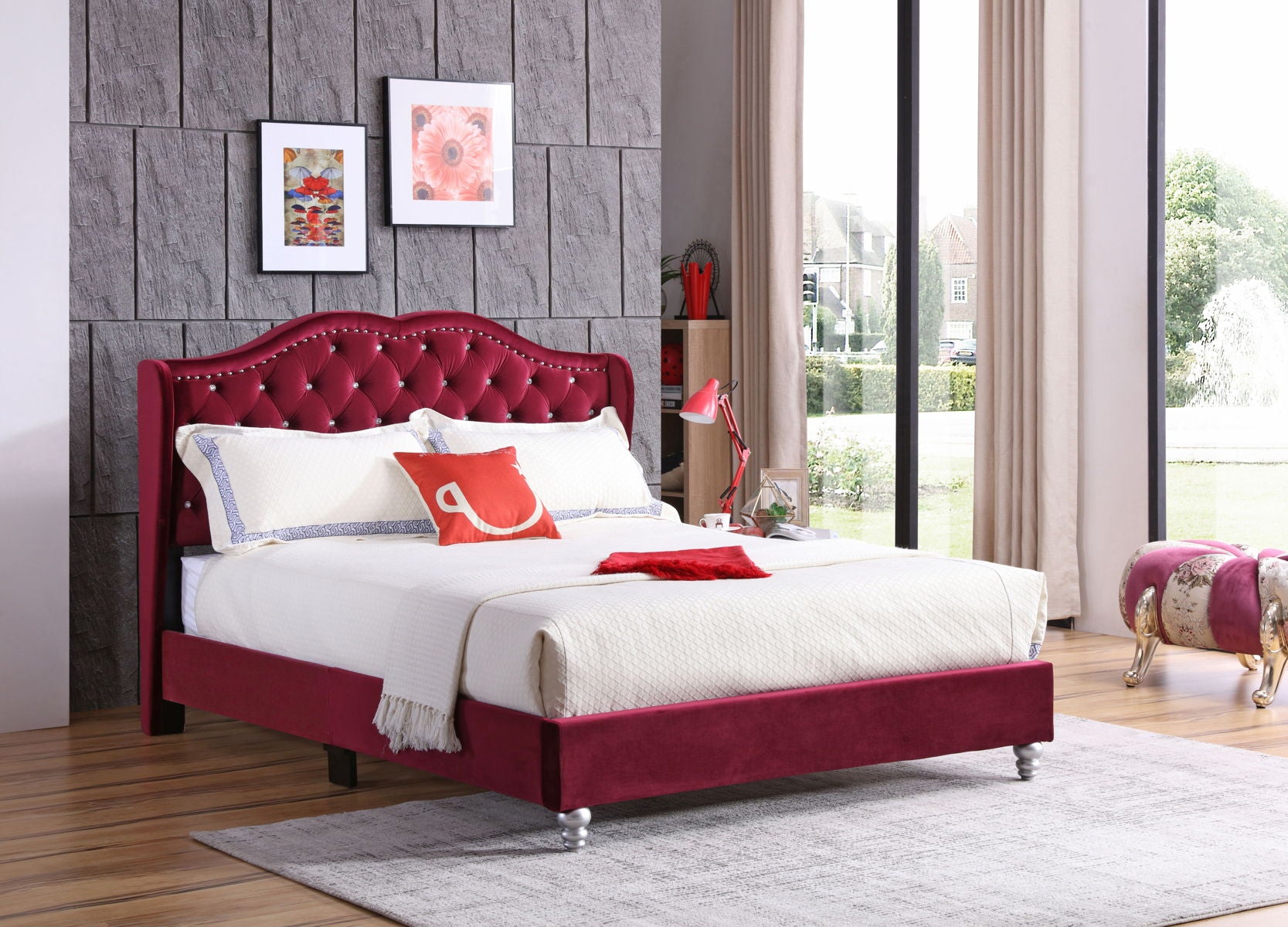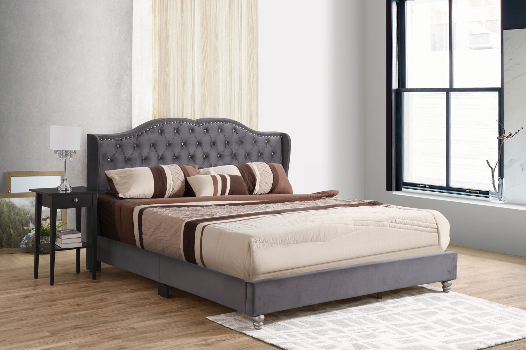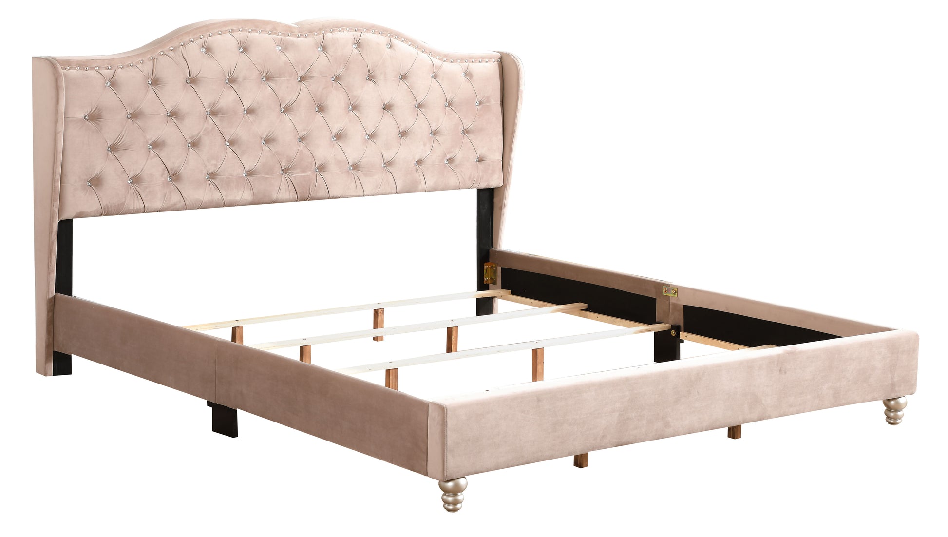 Upholstered in a sleek and modern look. Button Tufting: Features "jewel" like button tufting for added comfort and style. Sturdy Wood Legs: Equipped with wood legs for durability and aesthetic appeal. Supportive Design: Requires a foundationю Color Options: Available in a variety of colors to suit different preferences and room aesthetics.
