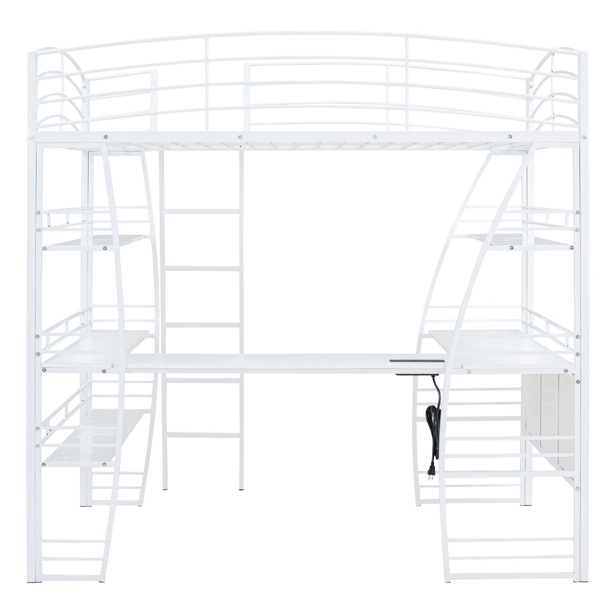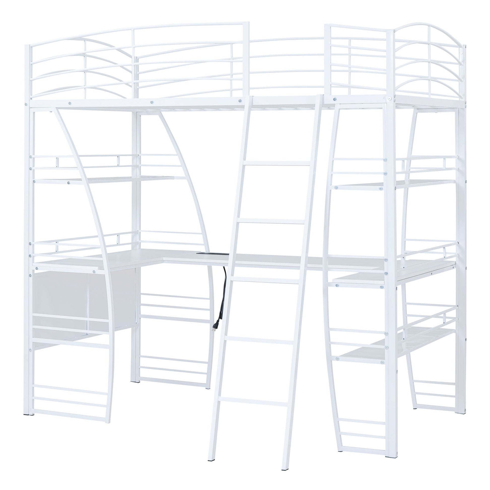 Full Size Loft Bed With 4 Layers Of Shelves And L-Shaped Desk, Stylish Metal Frame Bed With A Set Of Sockets, USB Ports And And Wireless Charging - White