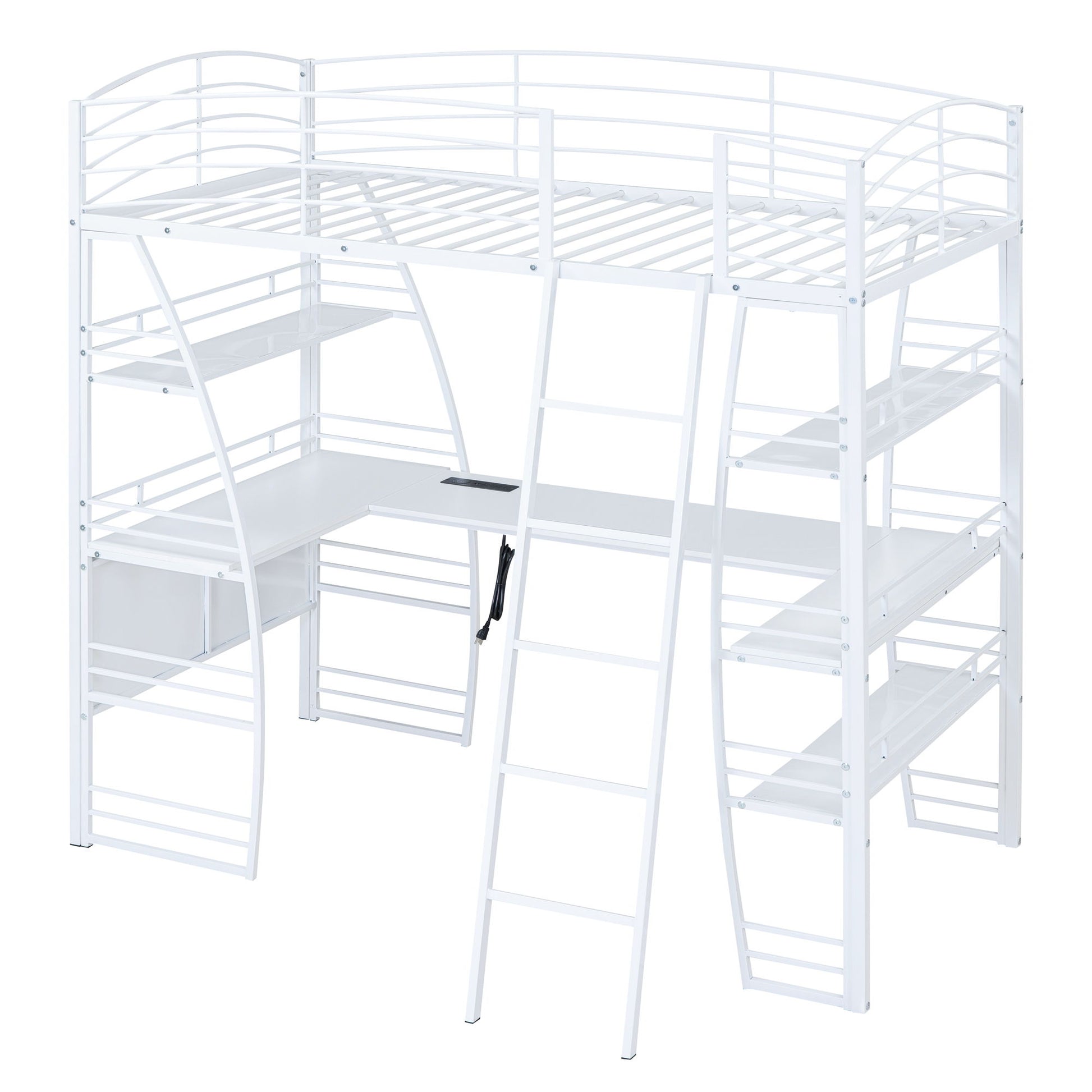 Twin Size Loft Bed With 4 Layers Of Shelves And L-Shaped Desk, Stylish Metal Frame Bed With A Set Of Sockets, USB Ports And And Wireless Charging - White