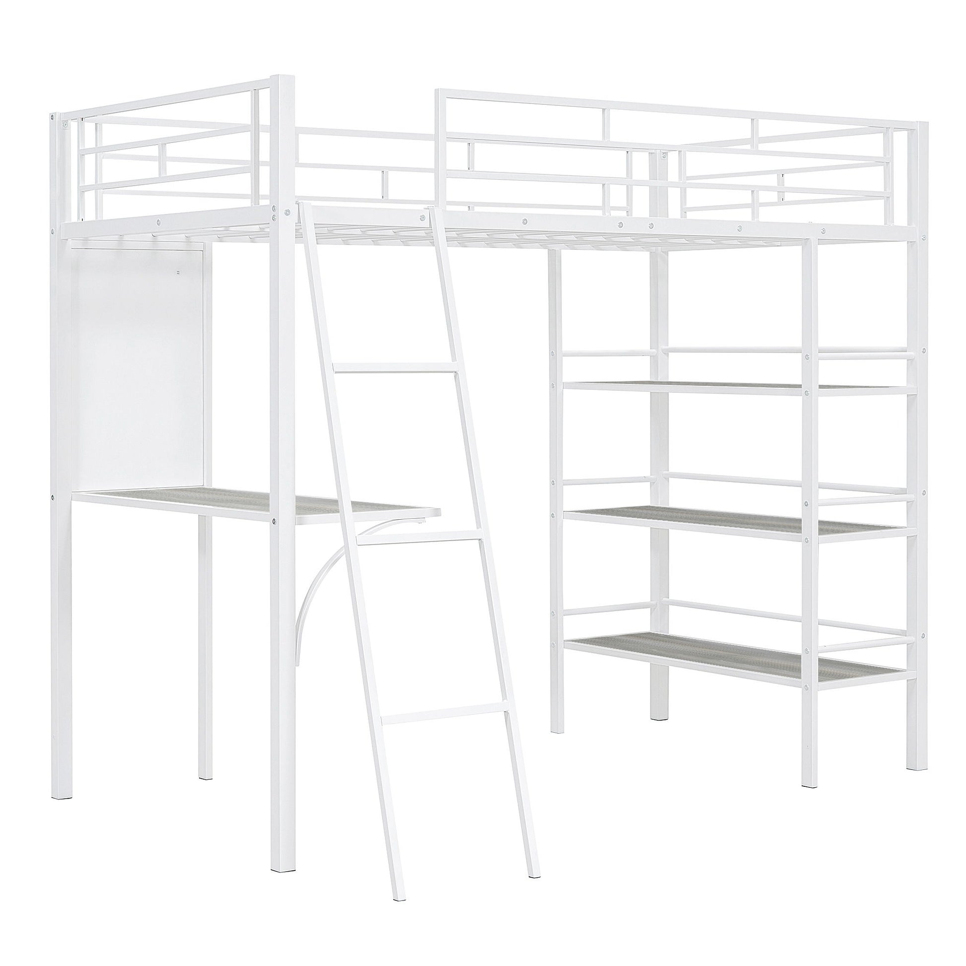 Crafted of metal in a clean painted finish, this metal loft bed strikes a clean-lined silhouette with slatted guardrails. The 3-layer open shelves offer ample space to display whatever you want. Equipped with a large desk and whiteboard underneath, this bed provides a comfortable place to work, read, and enjoy yourself. This loft bed will be a beautiful and practical piece in your bedroom.   Contemporary Build: The contemporary bunk bed is a modern classic, featuring a streamlined metal frame complemented by an eye-catching chrome finish. It will match well with your home décor. Maximized Space: The loft bed includes 3-layer open shelves for storing items like lamps, books, toys, and more. The shelves are conveniently located next to the desk, making it easy to access anything you need. Versatility Galore: Equipped with a large desk and whiteboard underneath, this bed offers you a comfortable place to work, read, and enjoy yourself. With your great imagination, this bed can be both beautiful and practical. Easy Assembly: This metal loft bed is delivered in two packages, along with the installation manual and a full set of hardware necessary to guide you through the assembly process.