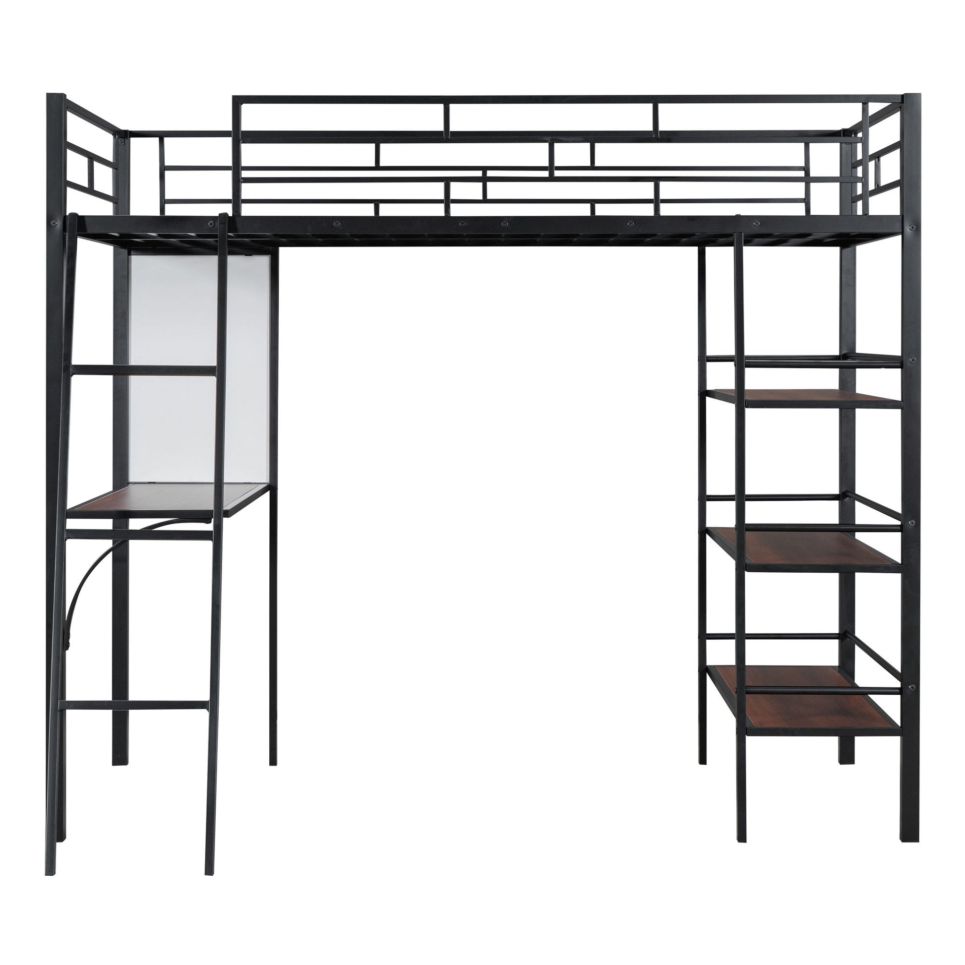 Twin Size Loft Metal Bed With 3 Layers Of Shelves And Desk, Stylish Metal Frame Bed With Whiteboard - Black