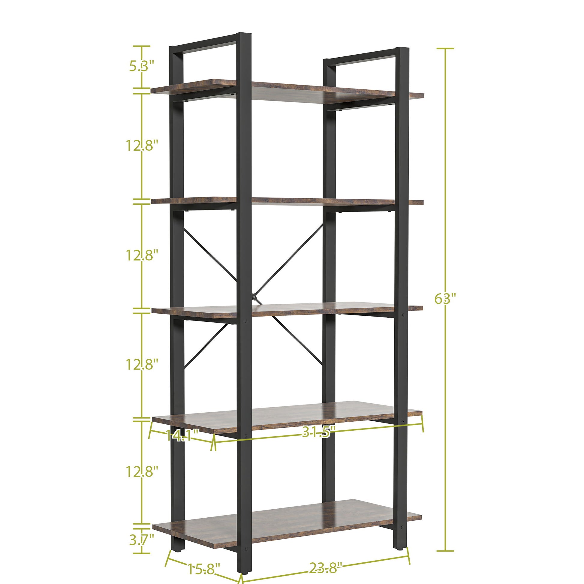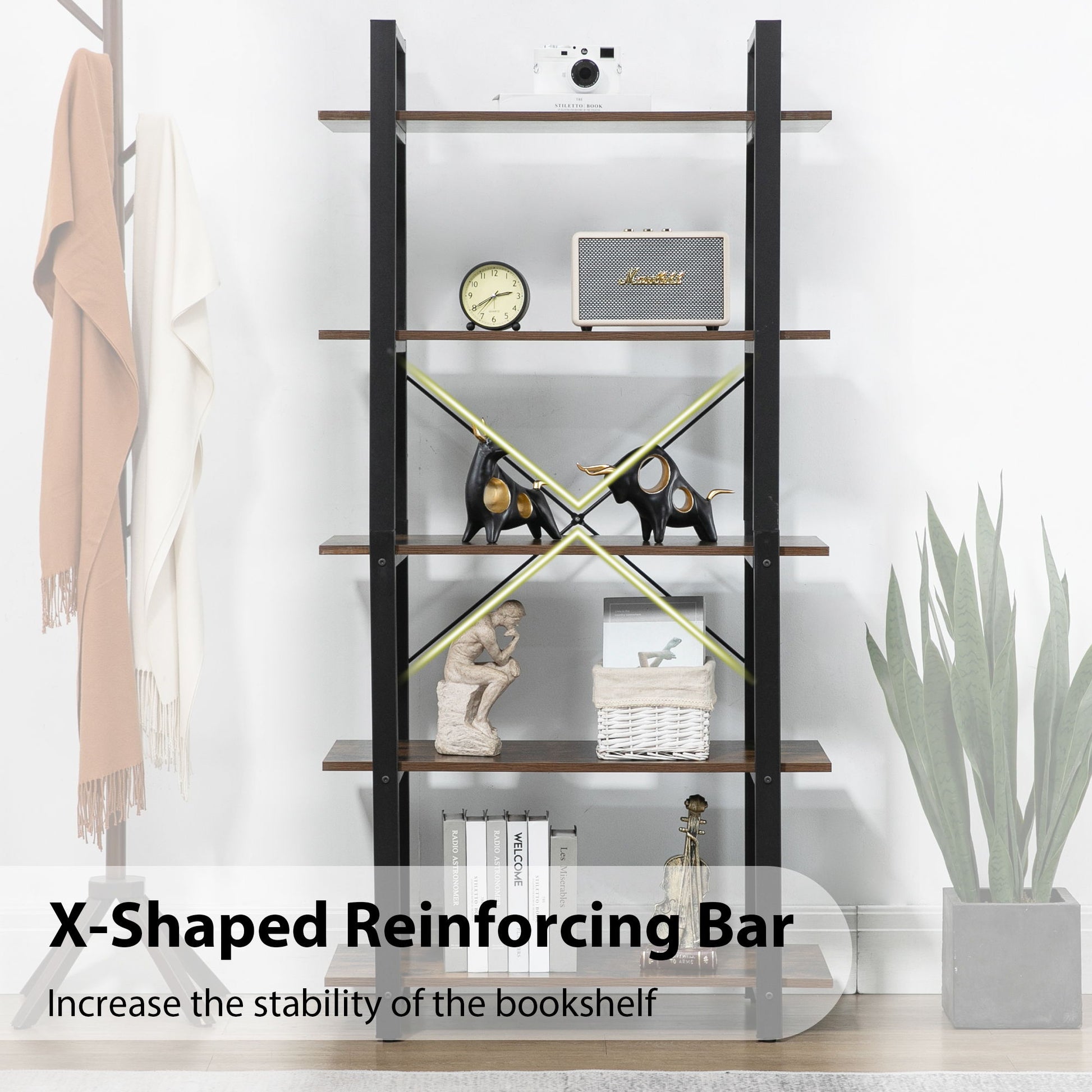 5 Shelf Vintage Industrial Rustic Bookshelf, 5 Tier Wood And Metal Bookcase, Open Etagere Book Shelf, Farmhouse Wooden Bookshelves - Vintage Brown