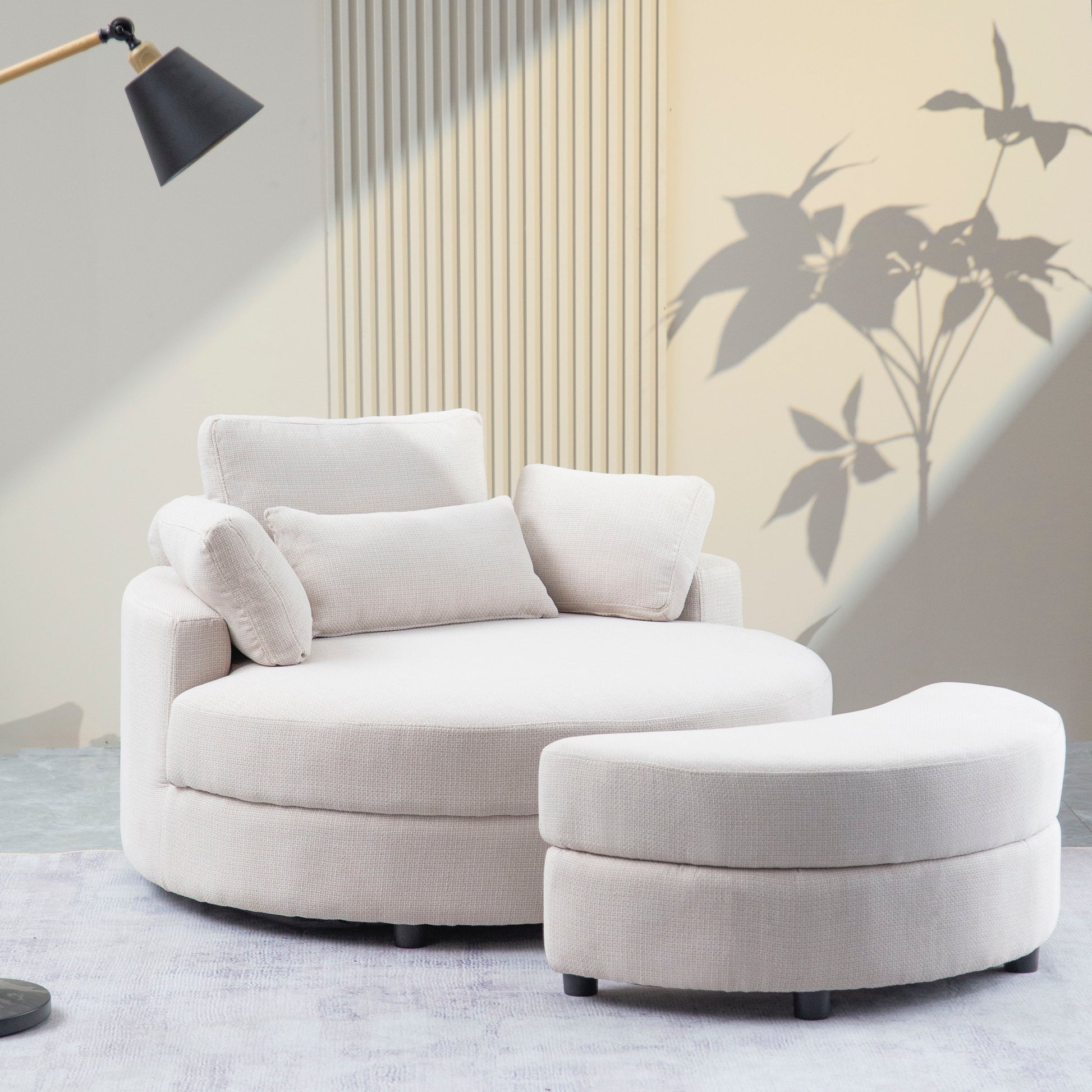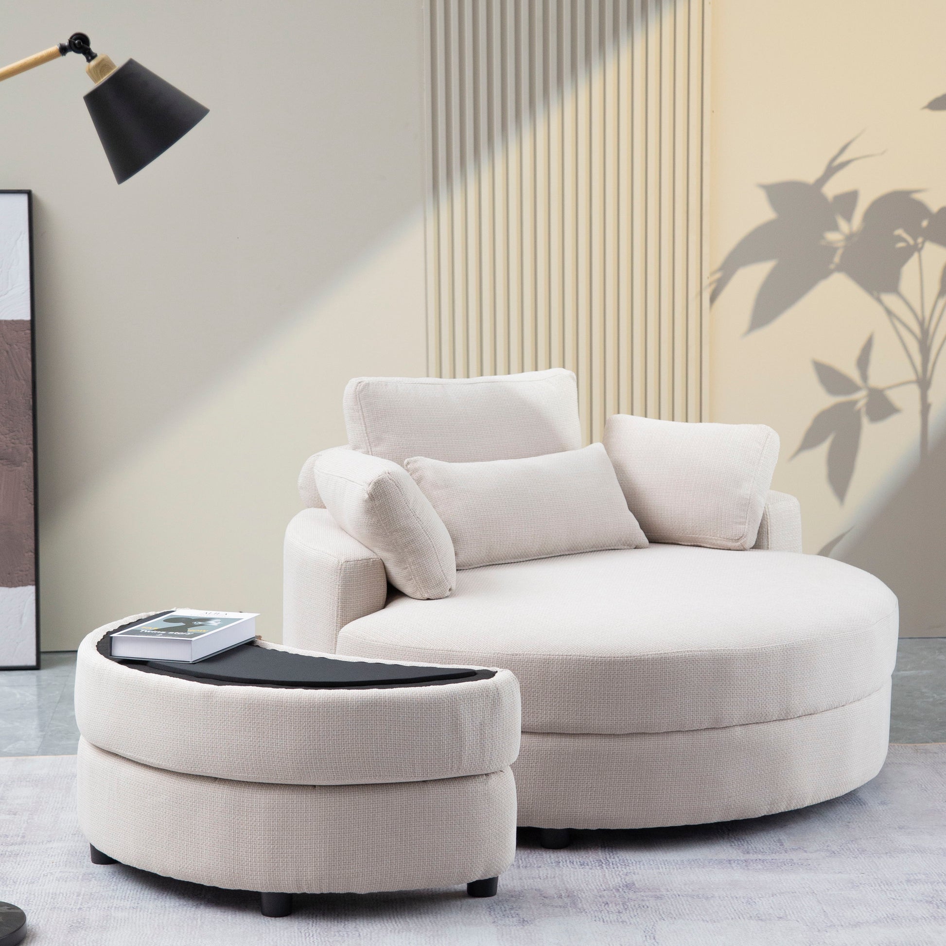 Large Round Chair With Storage Linen Fabric For Living Room Hotel With Cushions - Beige