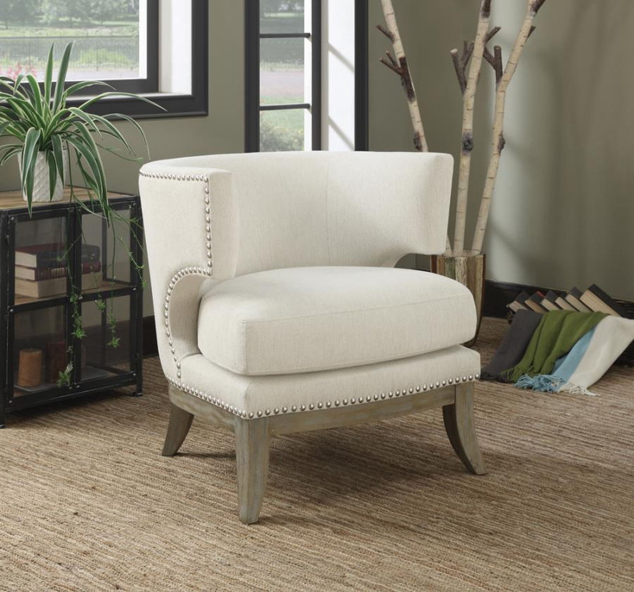 This distinctive accent armchair is designed to stand out in any room of the home. It's built with a barrel back and high armrests that look impressive. Stylishly decorated with nailhead trim along the frame and side cutout beneath the armrests.