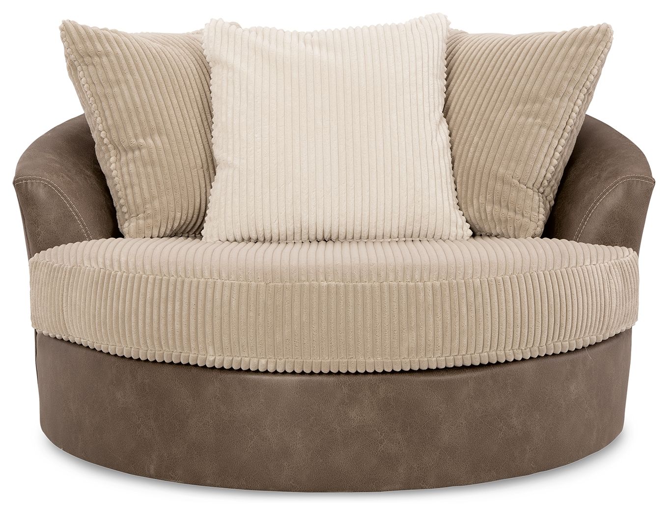 Sink into extraordinary comfort on this oversized swivel accent chair. Bigger and deeper, the cozy corduroy cushion complements rich brown faux leather that is comfortable and visually appealing. Go ahead, sit back and unwind. There's room for cuddling or stretching out solo with room to spare. The neutral hues blend easily into your decor for a head-turning addition to your home.