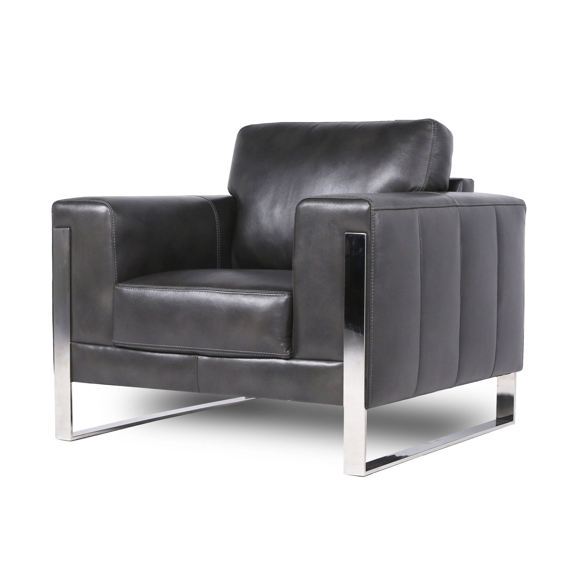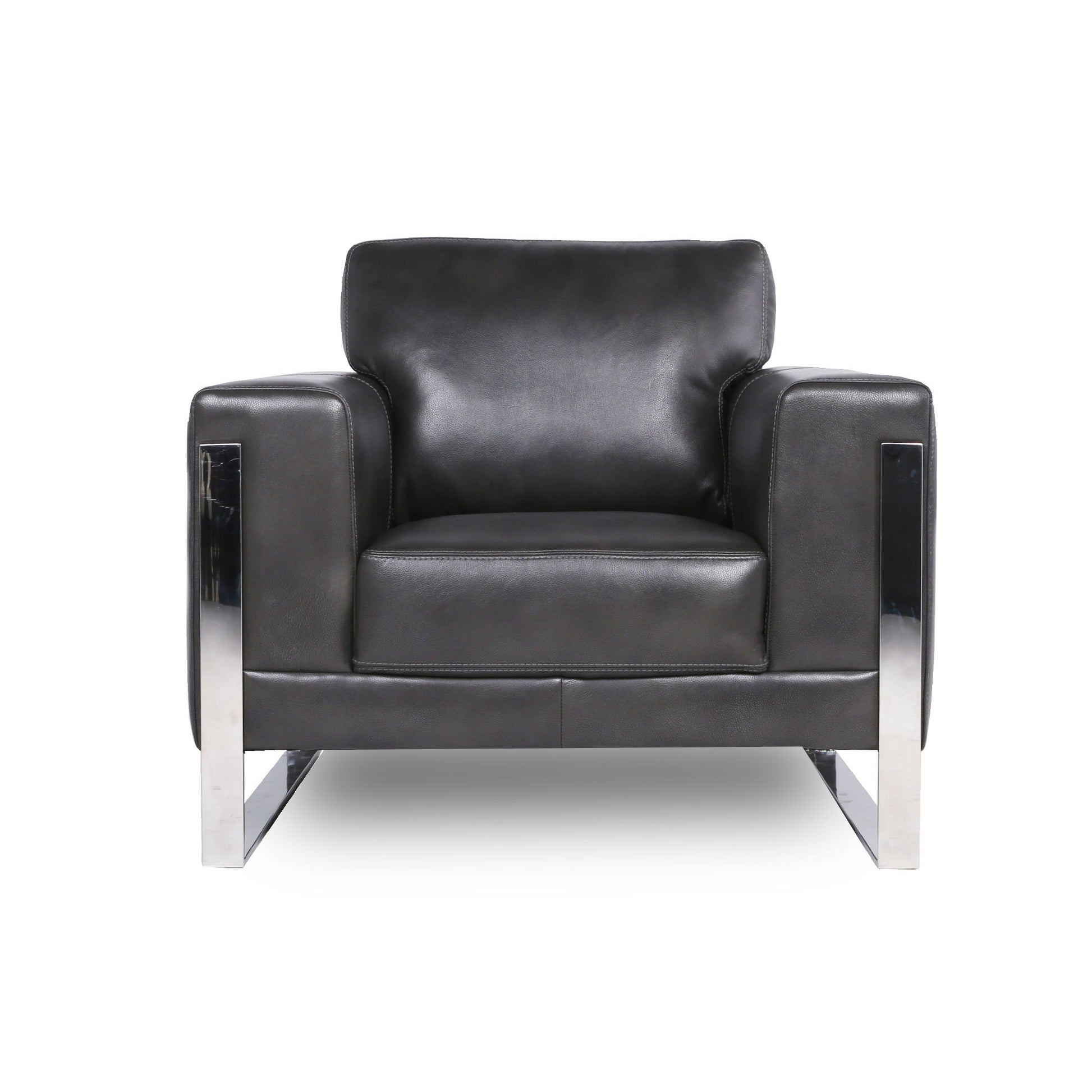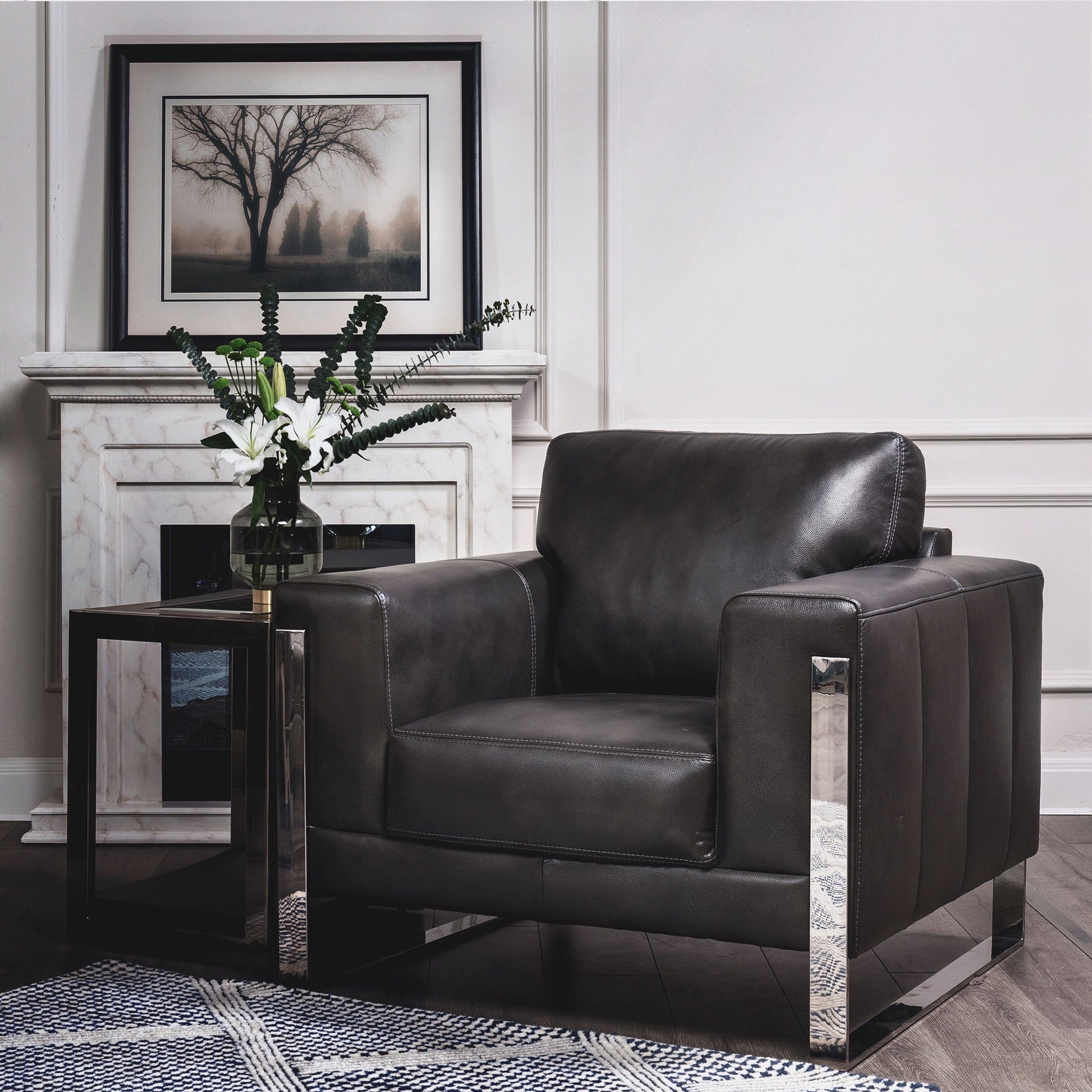 This leather chair makes a stunning contemporary statement in your living room. Large scale track arms accented with channeling and clean lined chrome metal accent legs that flow into the front of the arm and add to the overall appeal and modern styling of the chair. It is both comfortable and stylish while scaled to fit in multiple living spaces, including those with smaller footprints. Impeccable tailoring adds a stunning visual to any room or home.