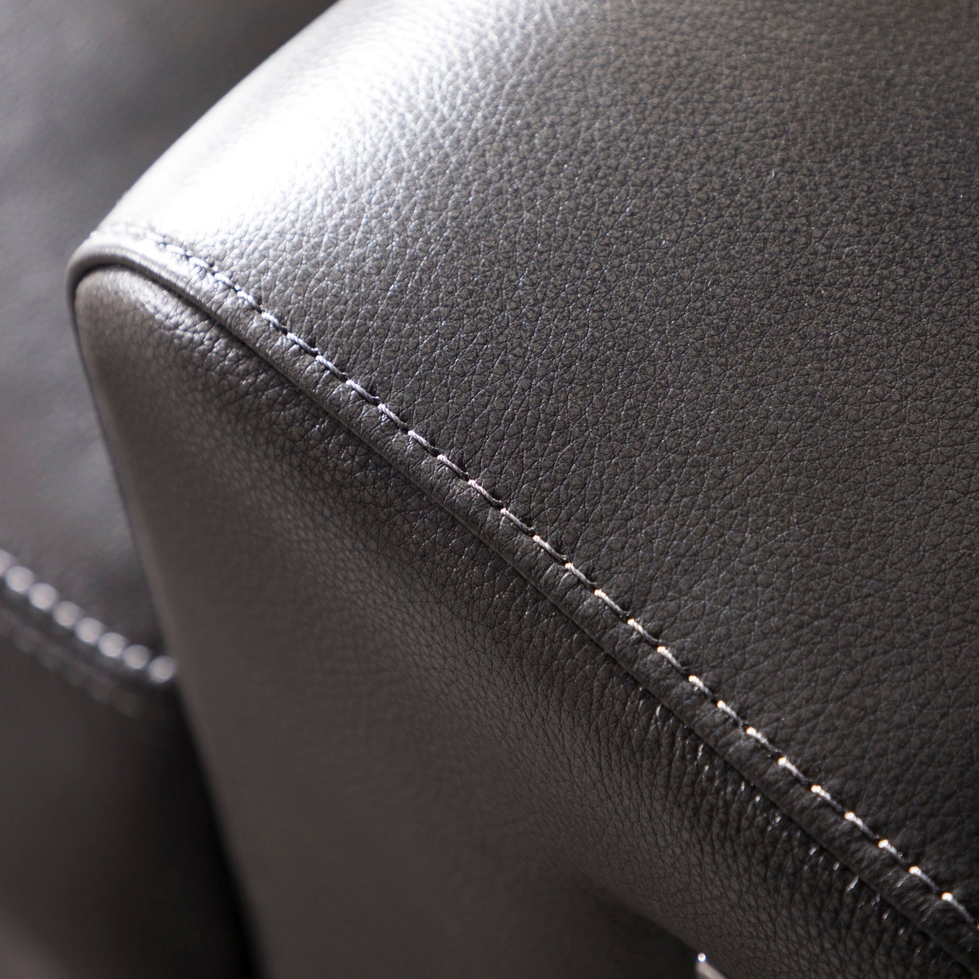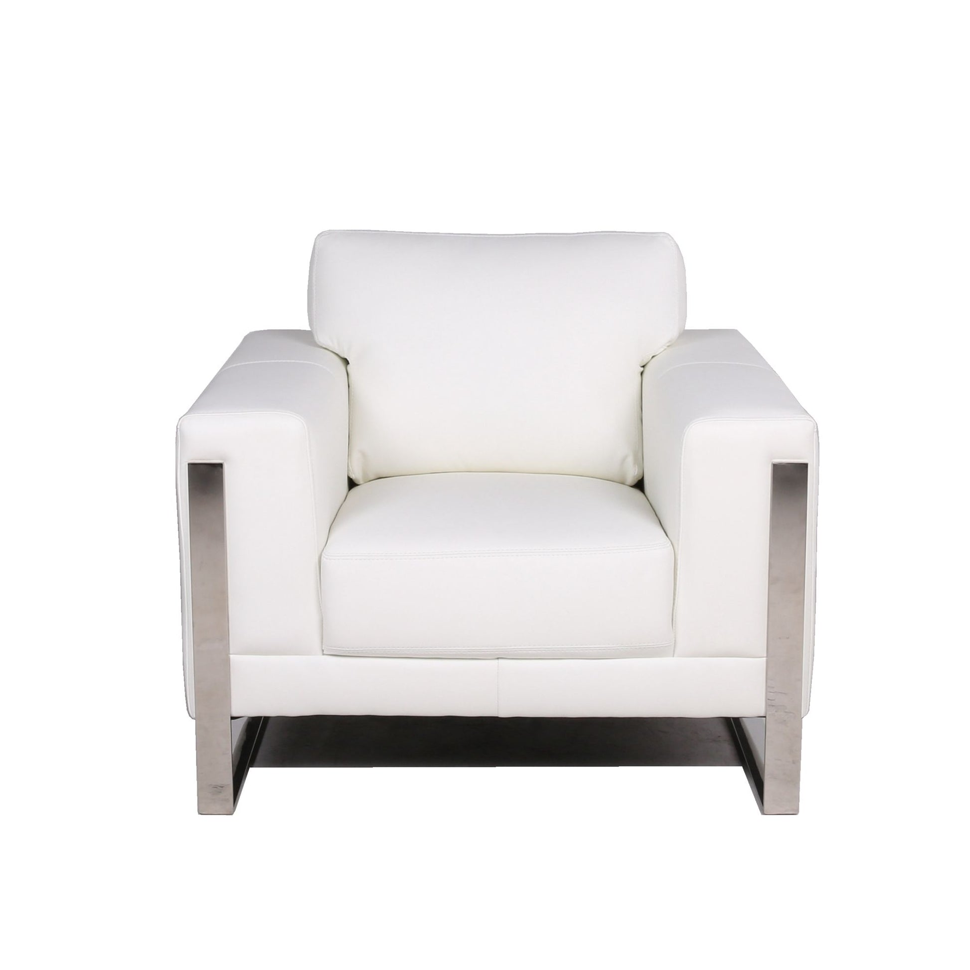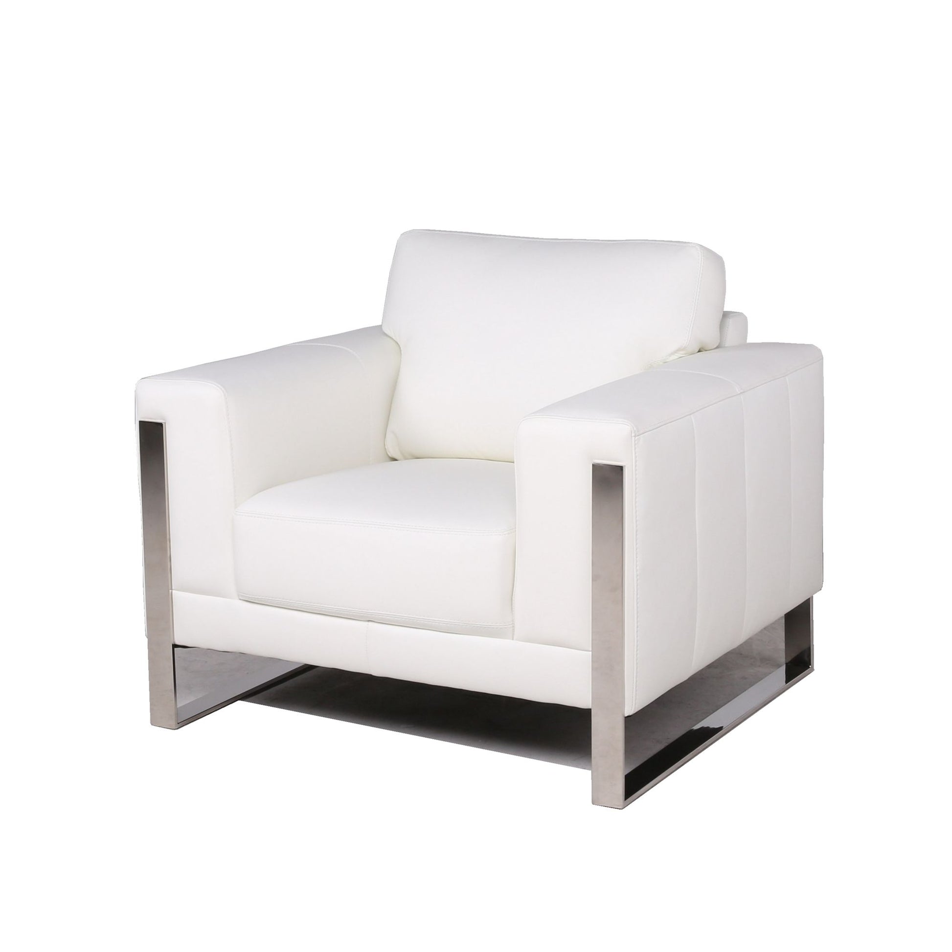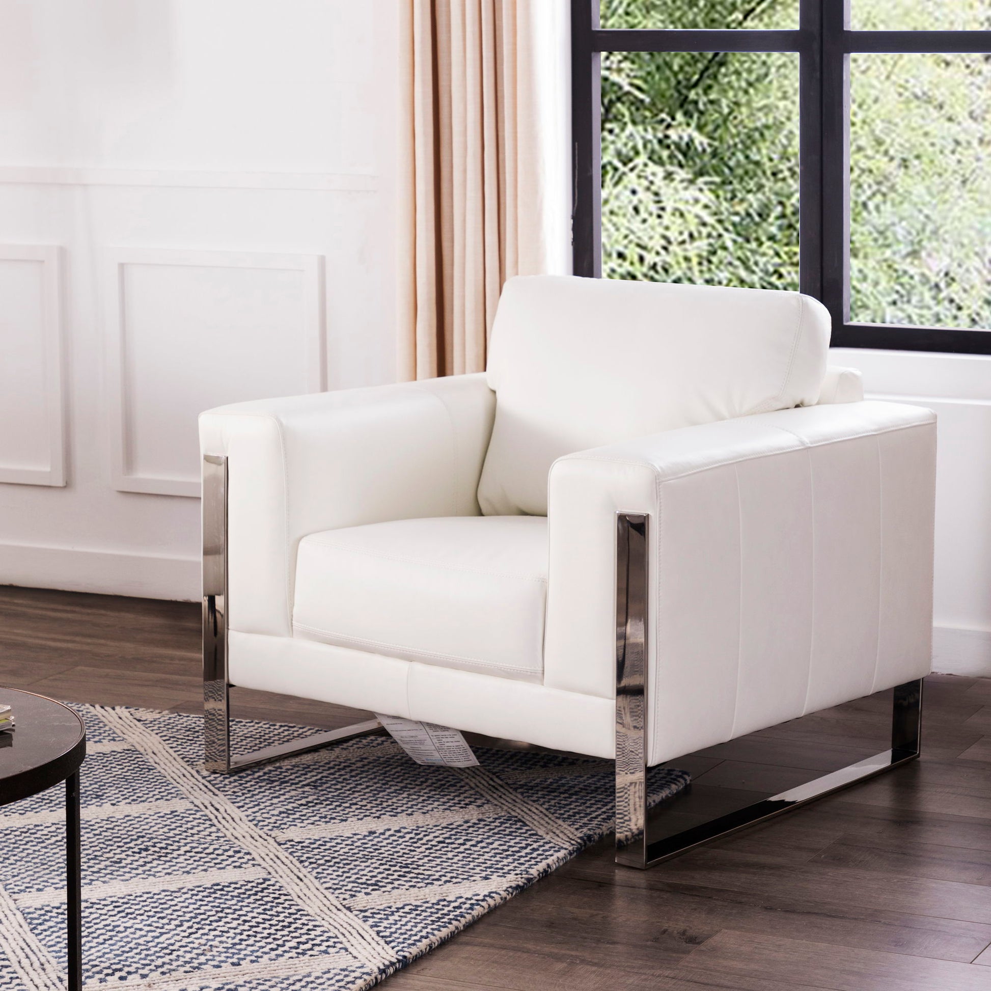 This leather chair makes a stunning contemporary statement in your living room. Large scale track arms accented with channeling and clean lined chrome metal accent legs that flow into the front of the arm and add to the overall appeal and modern styling of the chair. It is both comfortable and stylish while scaled to fit in multiple living spaces, including those with smaller footprints. Impeccable tailoring adds a stunning visual to any room or home.