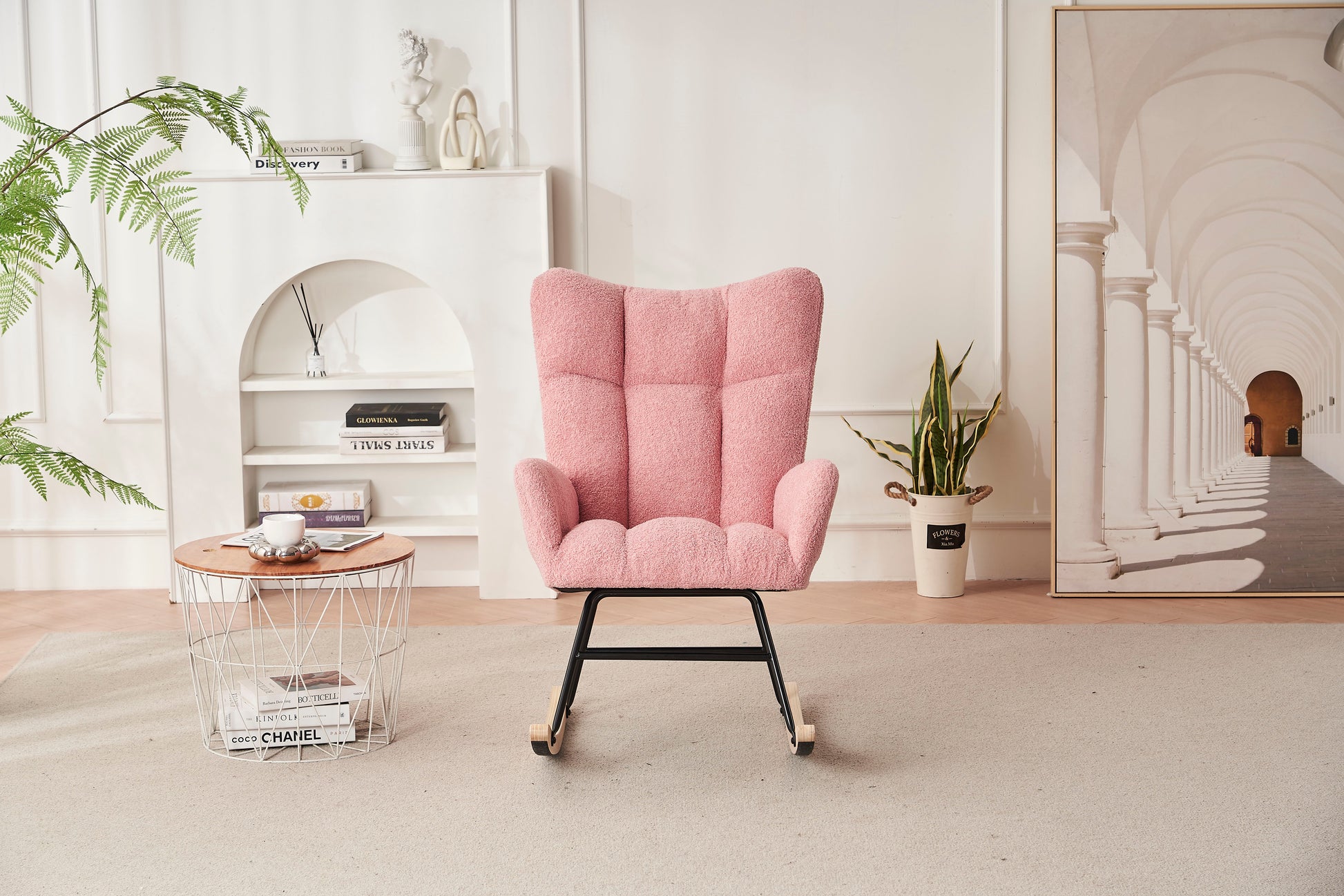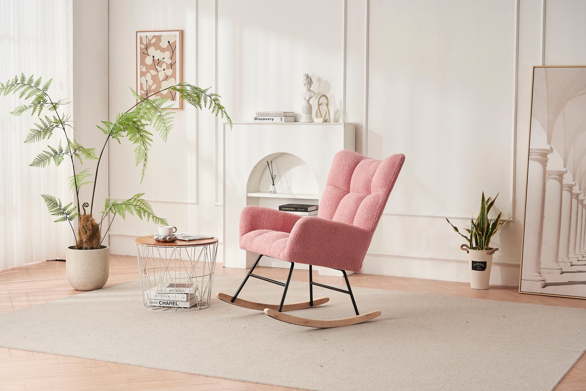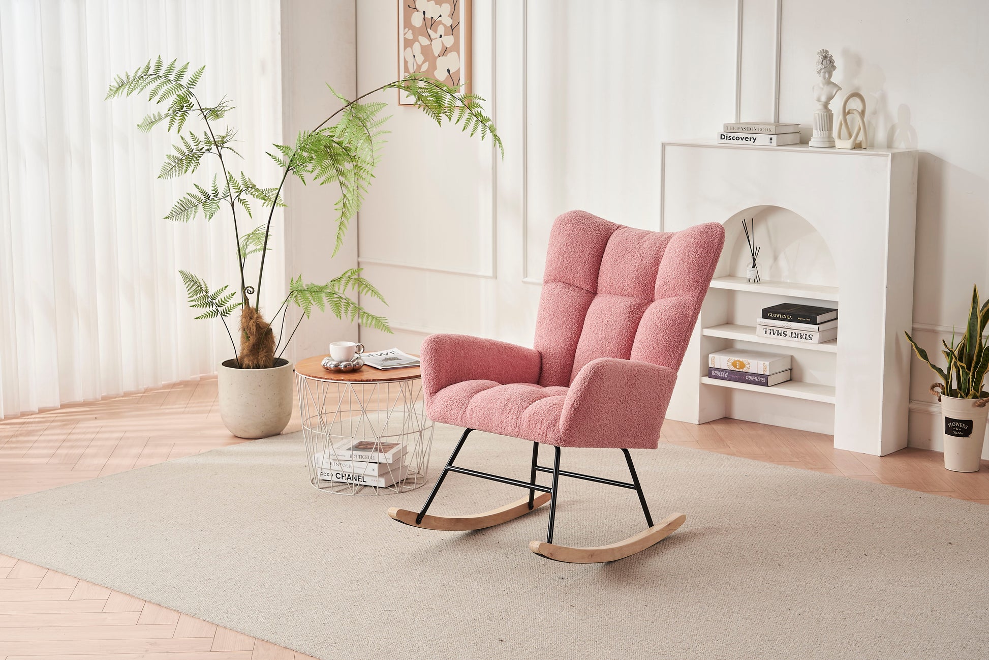 Rocking Chair Nursery, Solid Wood Legs Reading Chair Withteddy Fabric Upholstered, Nap Armchair For Living Rooms, Bedrooms, Offices, Best Gift - Pink