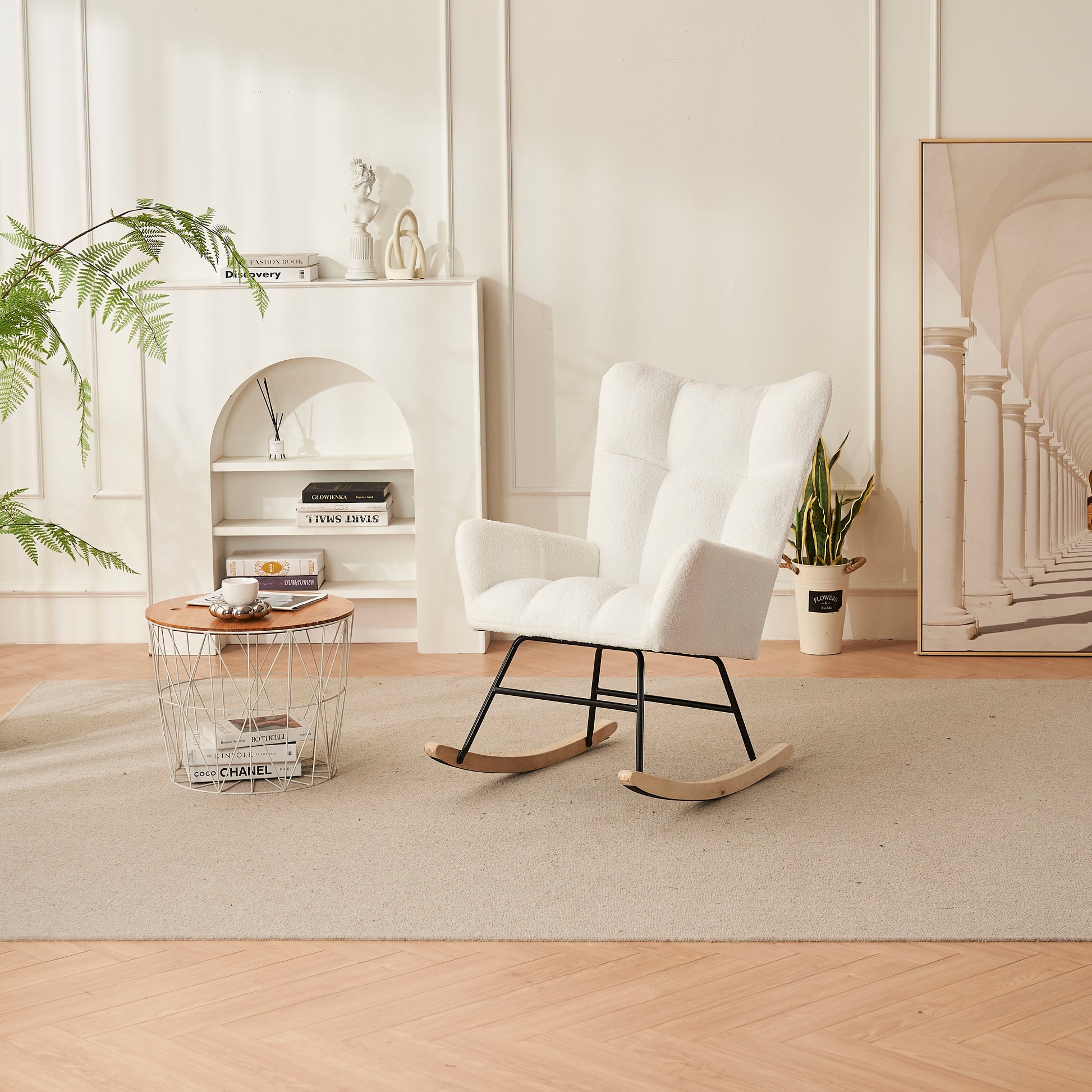 37.7" Rocking Chair Nursery, Solid Wood Legs Reading Chair With Teddy Fabric Upholstered, Nap Armchair For Living Rooms, Bedrooms, Offices, Best Gift - White
