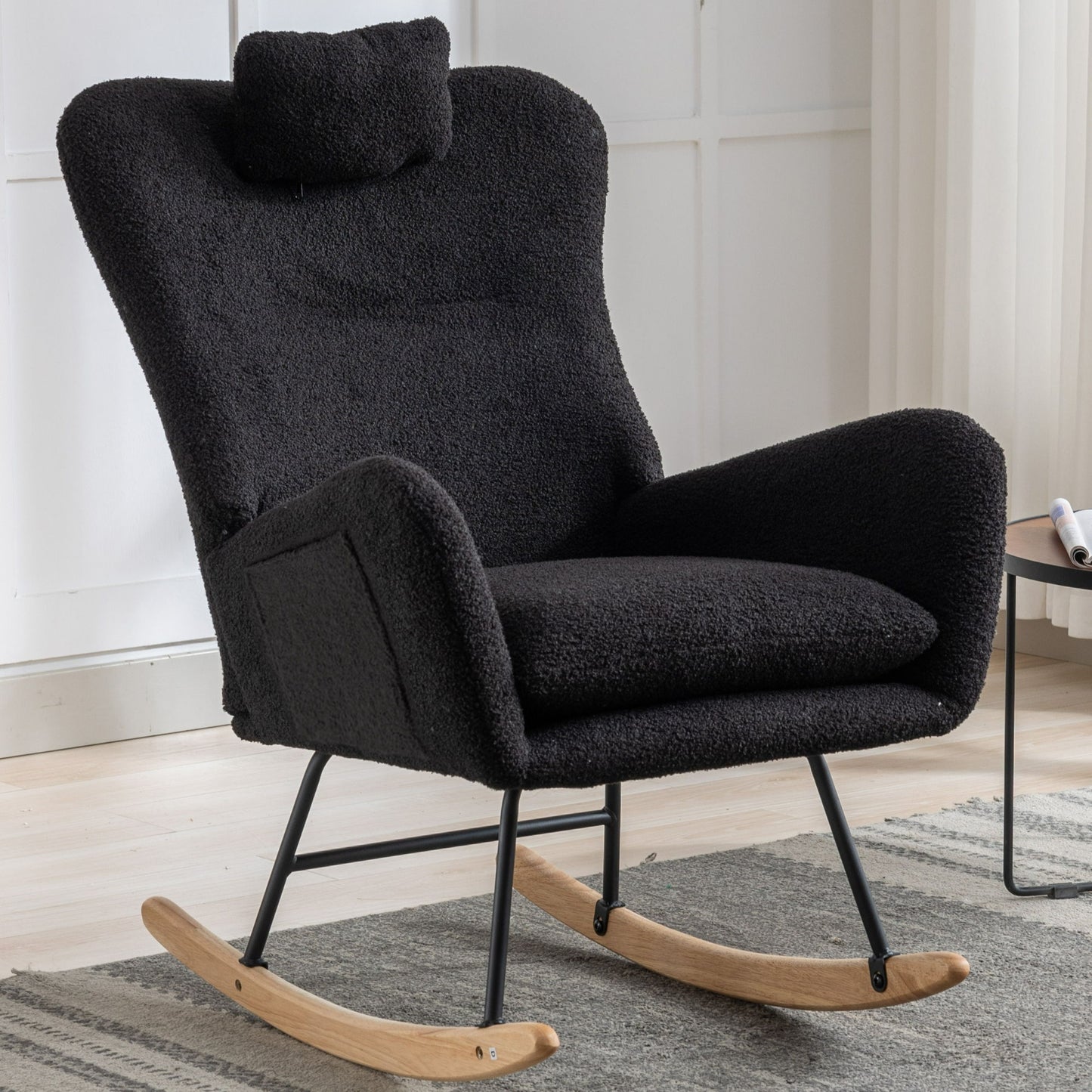 Rocking Chair With Pocket, Soft Teddy Fabric Rocking Chair For Nursery, Comfy Wingback Glider Rocker With Safe Solid Wood Base For Living Room Bedroom Balcony - Black