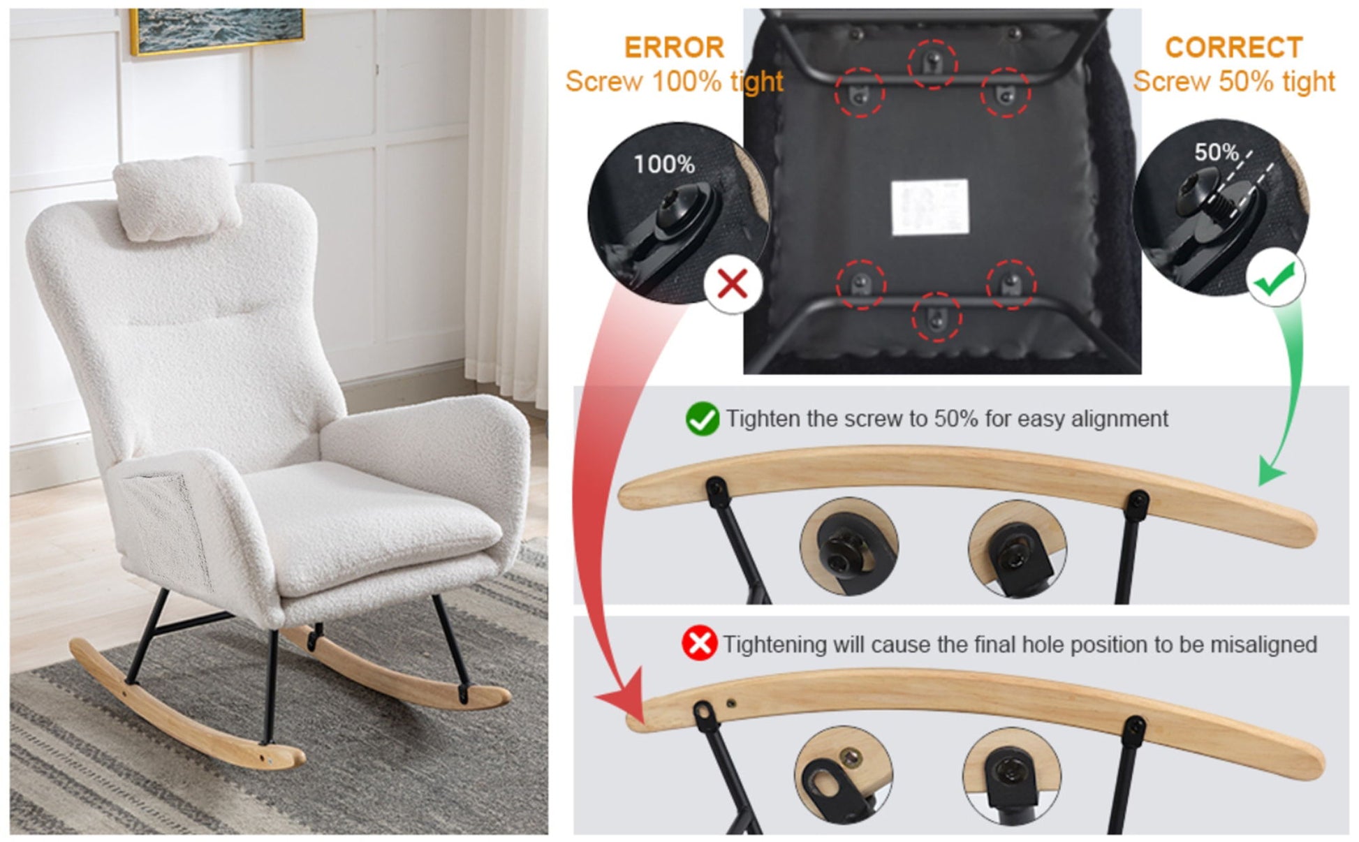 Super Comfort: Covered with soft teddy fabric and filled with high-density soft sponge for ultimate seating comfort. Ergonomics Design: Features ergonomically curved wing back and armrests to support the body and provide soft sitting for long periods. Gentle Rocking: Safe metal frame with curved legs for gentle rocking motion; includes a large pocket on the right armrest. Sturdy & Durable Construction: Made of steel and solid wood for stability and a high load capacity of 250 lbs. Compact Structure & Easy Assemble: Compact design suitable for various places; easy assembly within 20 minutes. Overall dimension: 35.5''H 25.2''W 30.3''D.
