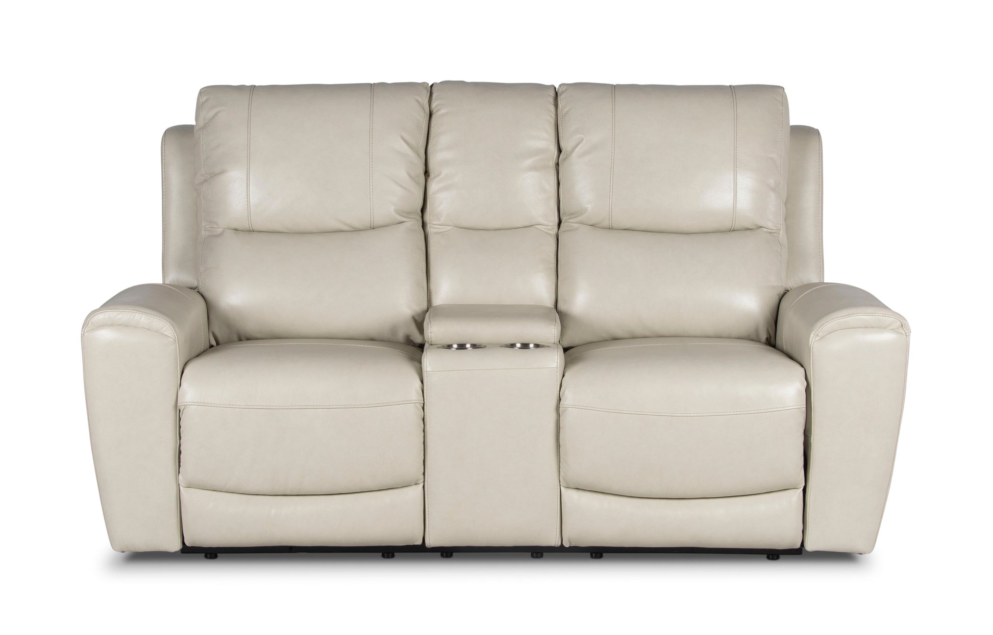 Contemporary styled collection constructed in leather with power leg rest and power articulating headrest. Laurel features both styling and convenience with USB charging port on the control panel along with a home button to return the piece to its original position. The loveseat feature dual reclining seats and a console with cup holders and hidden storage.