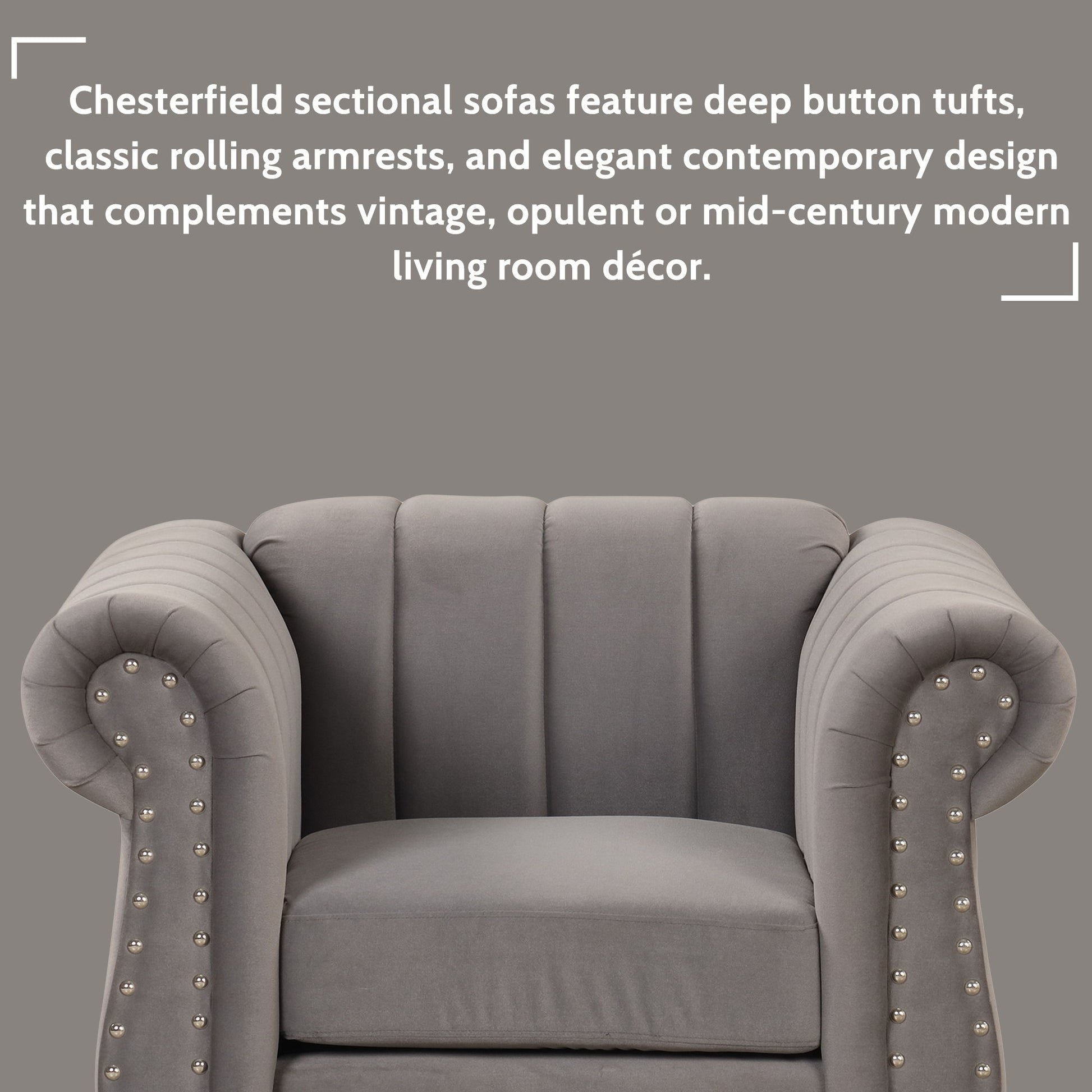 Sturdy and Durable: Built with a robust wooden frame and high-quality springs, this sofa set can support up to 500 lbs. The solid wood legs have padding to protect floors from scuffs and scratches, ensuring longevity. Versatile Placement: Ideal for bedrooms, living rooms, and apartments, this sofa set fits comfortably in small spaces and is perfect for relaxing, enjoying coffee, or engaging in conversations. Modern Design: Featuring deep button tufts, classic rolling armrests, and an elegant contemporary look, this Chesterfield sectional complements various interior décors, including vintage and mid-century modern styles. Easy Maintenance: Upholstered with high-quality fabric, this sofa is easy to clean, offering a humanized design that minimizes unnecessary troubles in daily life.