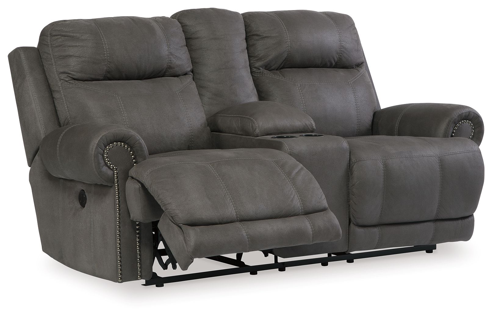 Sparing that "puffy" look you might expect from a recliner, this reclining loveseat with console doesn't hold back when it comes to contemporary style. Subtle touches such as sporty jumbo stitching, nailhead trim and a "weather worn" effect on the upholstery give this handsome piece a buttoned-up appeal and fresh feel. Center console with dual cup holders brings a handy element to this handsome piece.