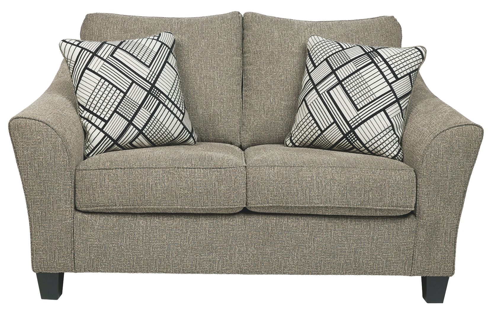 This loveseat sets the scene for a modern space full of casual flair. Enticing with a textured taupe upholstery with a rich chenille feel, this chic loveseat masters the art of neutrality. Gently flared arms, plush seat cushions and decorative designer pillows perfect the feel-good experience.