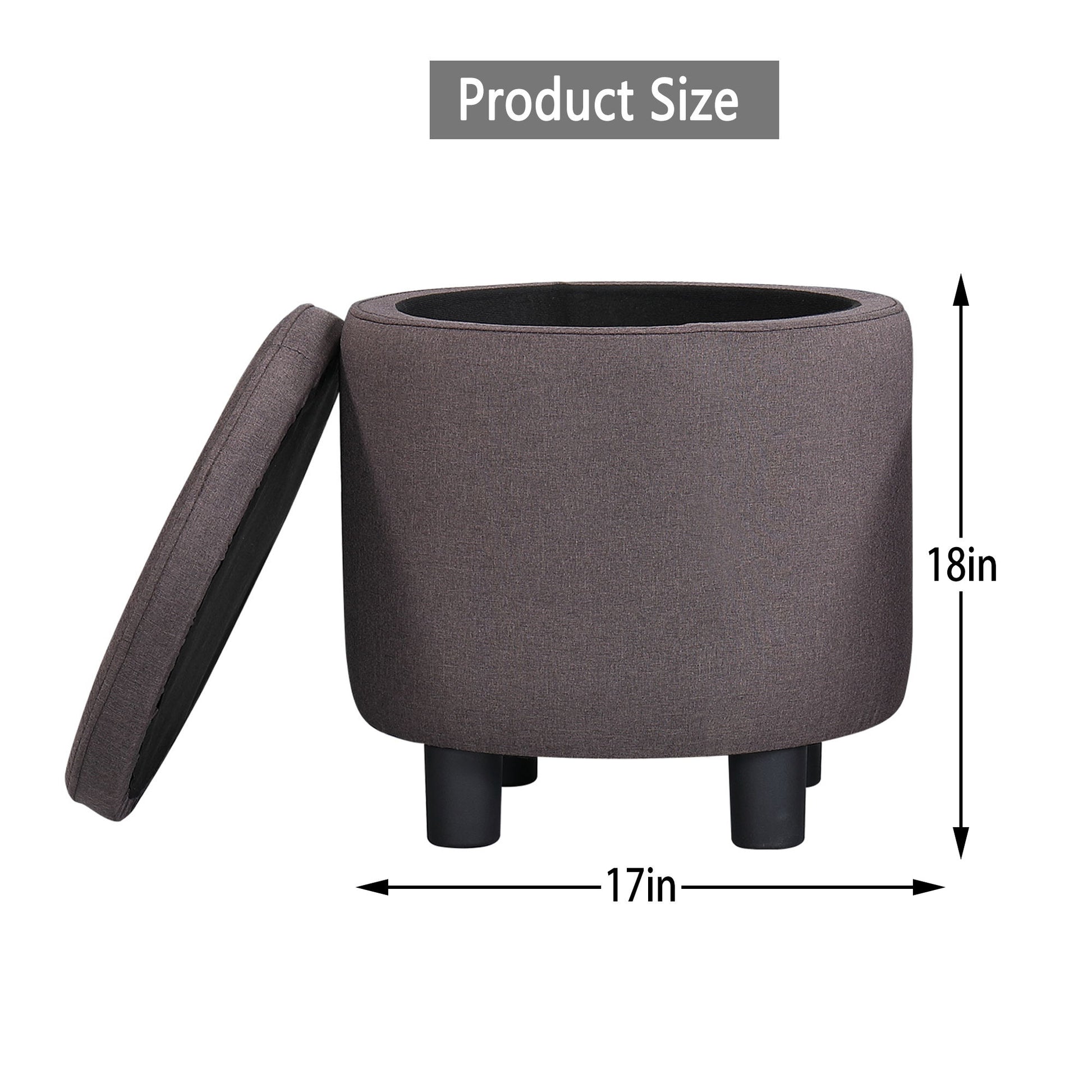 Versatile Functionality: This storage ottoman functions both as a footrest and a side accent piece, offering concealed storage for accessories. Stylish Design: Crafted with premium, soft, and durable linen, it features a timeless style with button tufting on top and tapered wood legs in a dark walnut finish. Compact Storage Solution: Ideal for integrating into living rooms or bedrooms, this ottoman provides a stylish solution for lingering accessories. Durable and Sturdy: The ottoman weighs 10.58 lbs and supports up to 250 lbs, ensuring both durability and practicality. Dimensions: Measuring 18 inches high, 17 inches wide, and 17 inches deep, this round ottoman is compact yet functional.