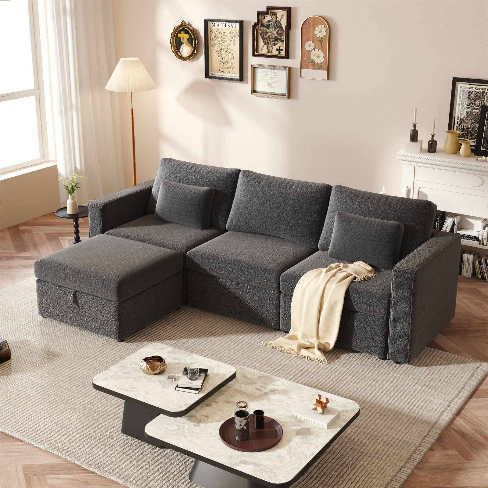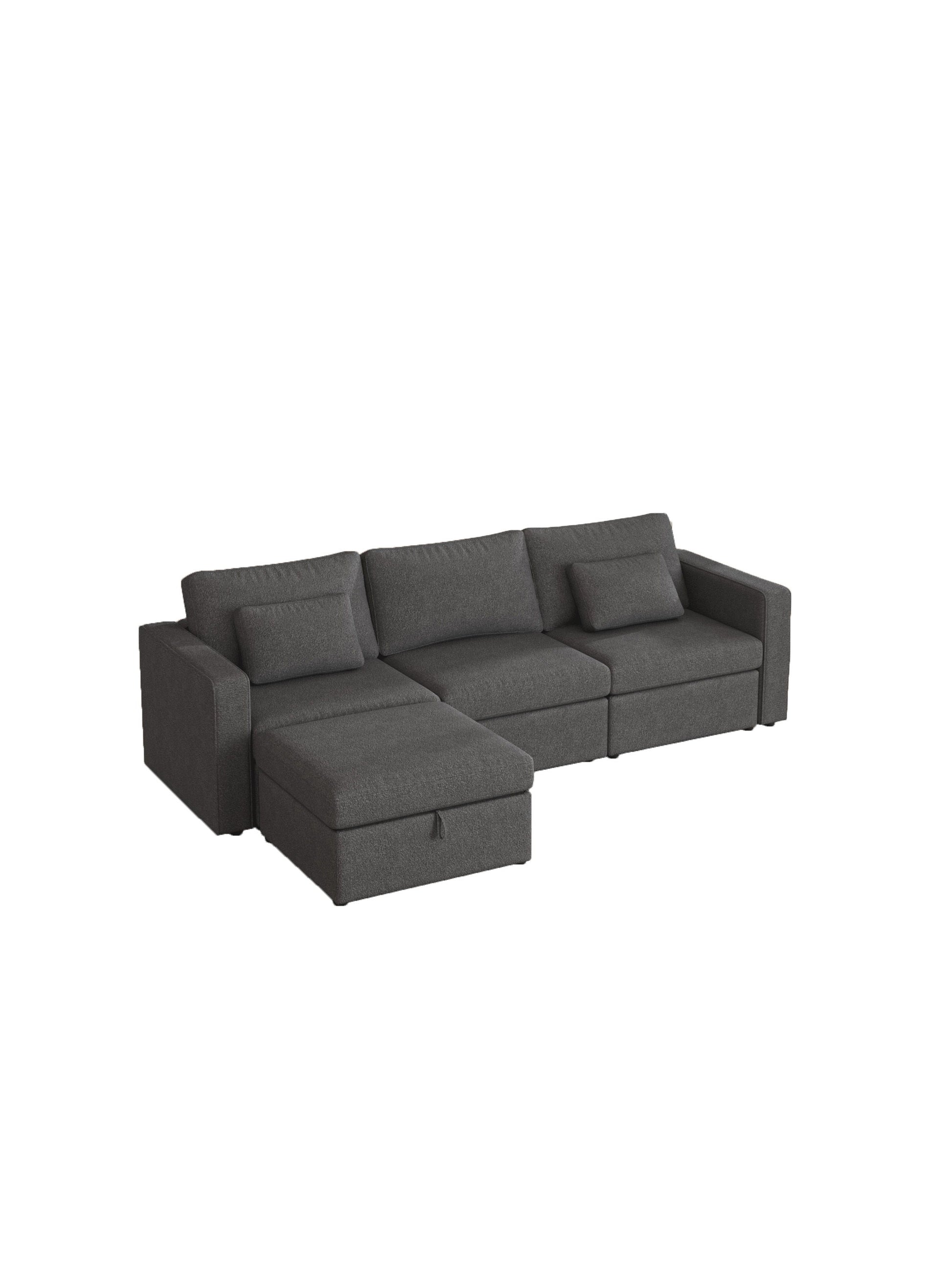 Sumptuous Comfort: Experience luxurious coziness with generously cushioned oversized sectional couch crafted with top-quality materials for unmatched comfort. Versatile Arrangement: Effortlessly configure the modular sectional sofa into a U-shape or an L-shape to create the perfect seating setup for various occasions and adapt to your space and lifestyle. Sophisticated Design: Enhance your living room with the sleek and contemporary aesthetic of the modular sectional sofa, featuring sleek lines, tufted accents, and a modern silhouette for added refinement. Integrated Storage Ottoman: Stay organized with the oversized modular couch ottoman that includes built-in storage compartments to keep blankets, pillows, and magazines neatly organized while maximizing space. Exceptional Durability & Pet-Friendly: Built to endure daily use, this sectional couch is engineered for exceptional durability, featuring high-quality upholstery and pet-friendly features for long-lasting performance.