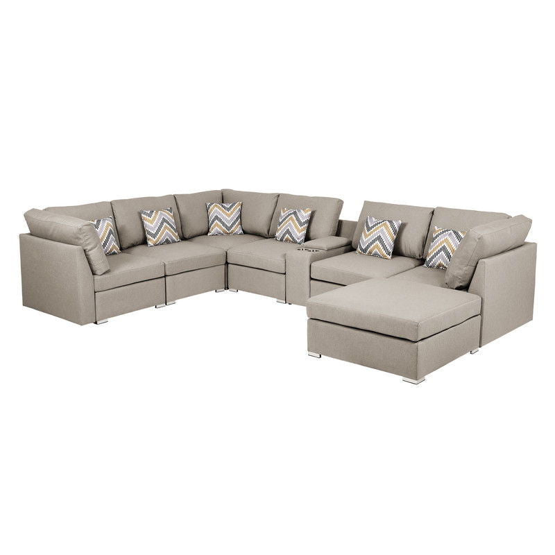 • Comfort, Style, and Quality! These are the important features for the Amira Collection. This beautiful modular sofa sectional with USB console with cupholders, ottoman, and six matching accent pillows will fit into any living room and impress your guests! The comfortable beige linen fabric with matching accent pillows will light up your living room with the most trendiest of looks. Perfect for apartments, condo, loft, and single family home, you will be able to welcome multiple guests comfortably where everyone is able to enjoy entertainment together.