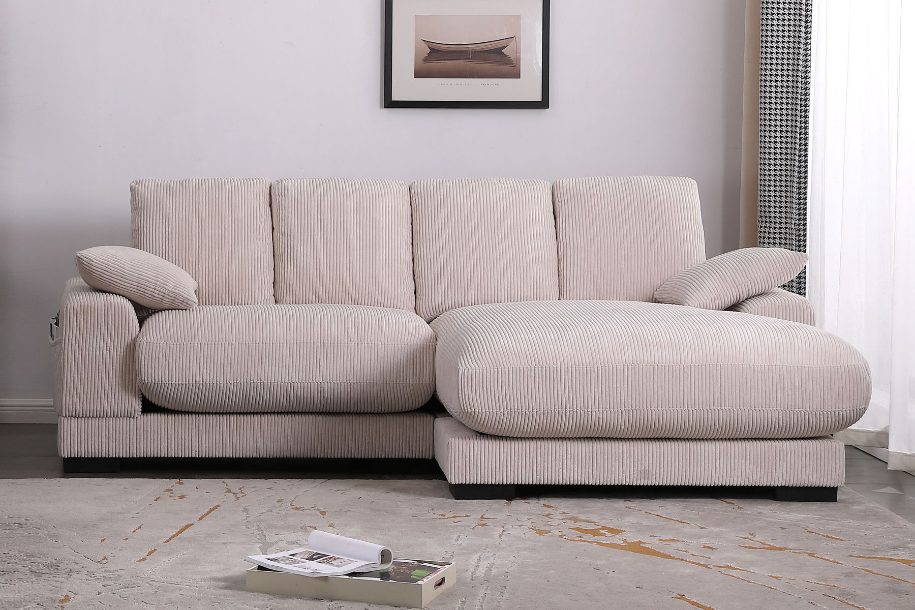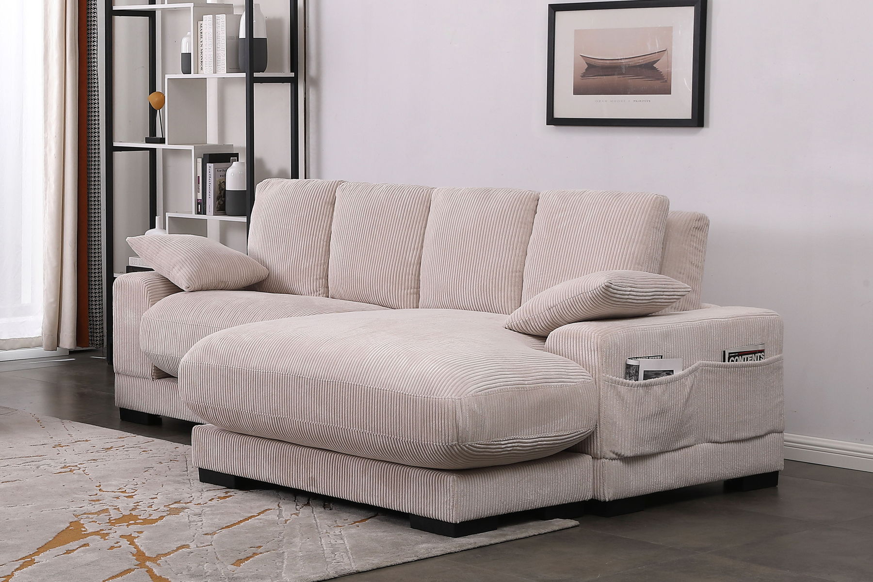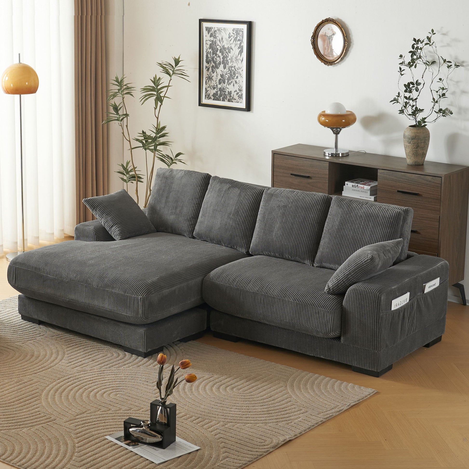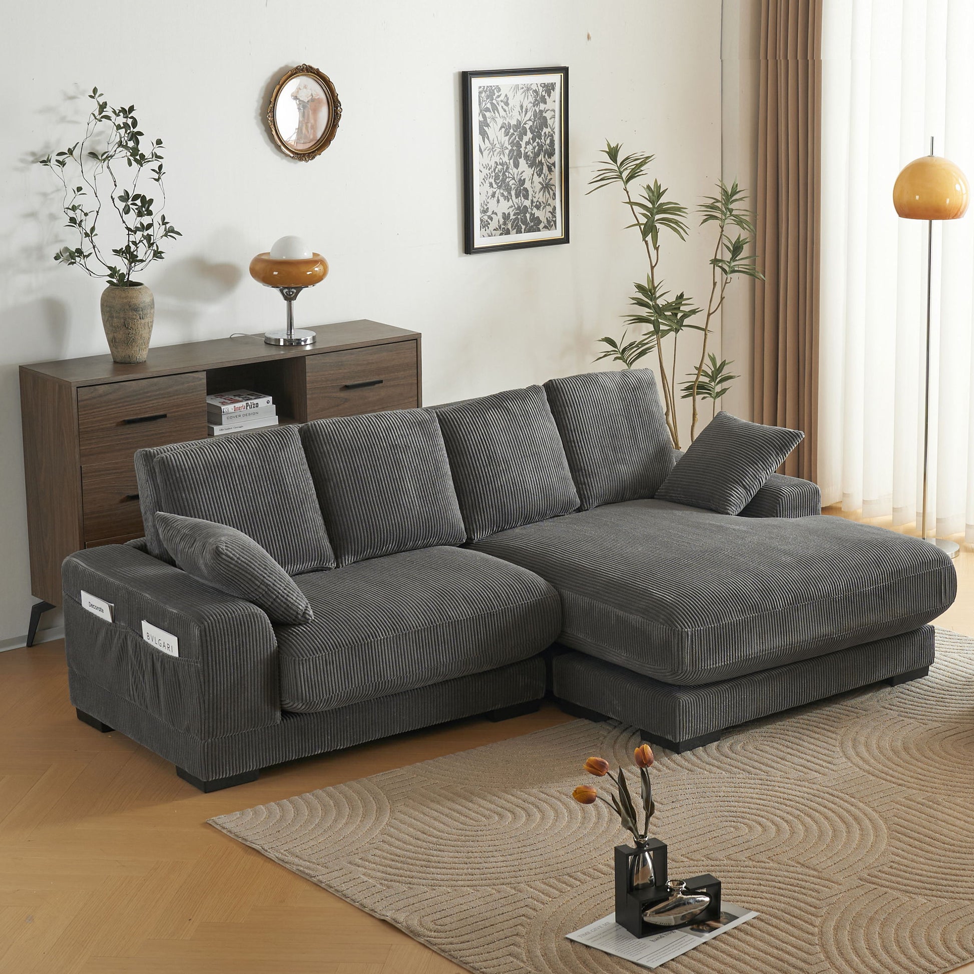 Discover the epitome of luxury with our sectional sofa featuring a chaise—an impeccable combination of comfort, style, and functionality. The exquisite design ensures unmatched relaxation, complemented by a convenient side pocket for practicality. Embrace cozy evenings indoors with the inviting corduroy material, and customize your space effortlessly with the standout feature of a reversible chaise. Its contemporary design seamlessly integrates with diverse interior styles, making this sectional set a versatile and timeless addition to your home decor.