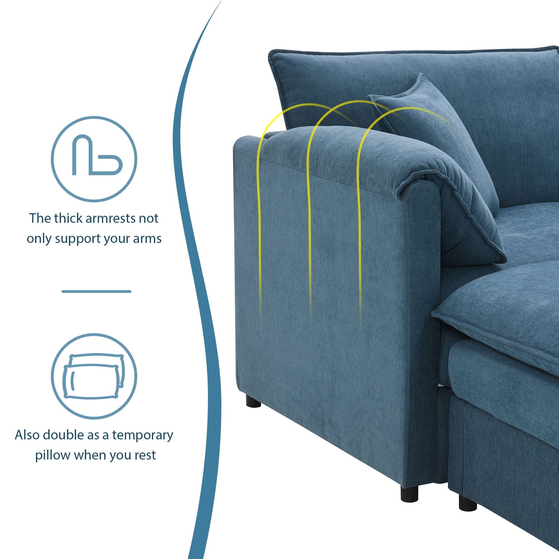 Enhanced Comfort: Double layer cushions provide extra padding and support for a more comfortable seating experience, distributing weight evenly and reducing pressure points. Ample Seating Space: Super-sized width offers plenty of room for multiple people to sit comfortably, perfect for accommodating guests or lounging and stretching out. Versatile Ottomans: Two removable Ottomans add flexibility to the sofa, serving as extra seating or footrests for relaxation. They can also be moved around the room to suit your preferences. Convenient Armrests: Armrest pillows on both sides provide extra support and comfort for arms and shoulders, offering a place to rest your arms while maintaining a relaxed posture. Sturdy Construction: High-quality material with a sturdy wooden frame and thick fabric ensures stability, prolonging the sofa's life and enhancing comfort while sitting.
