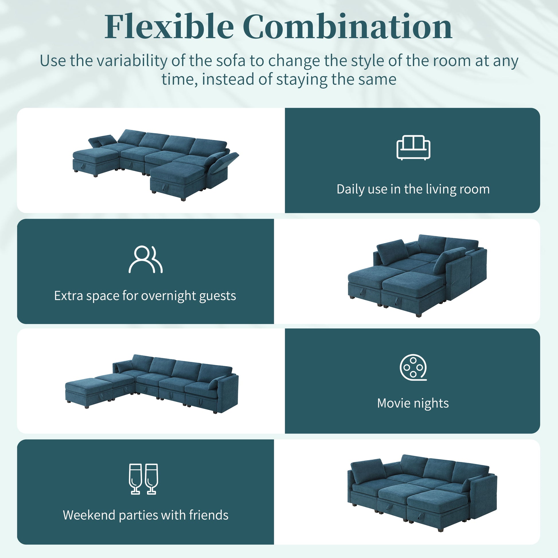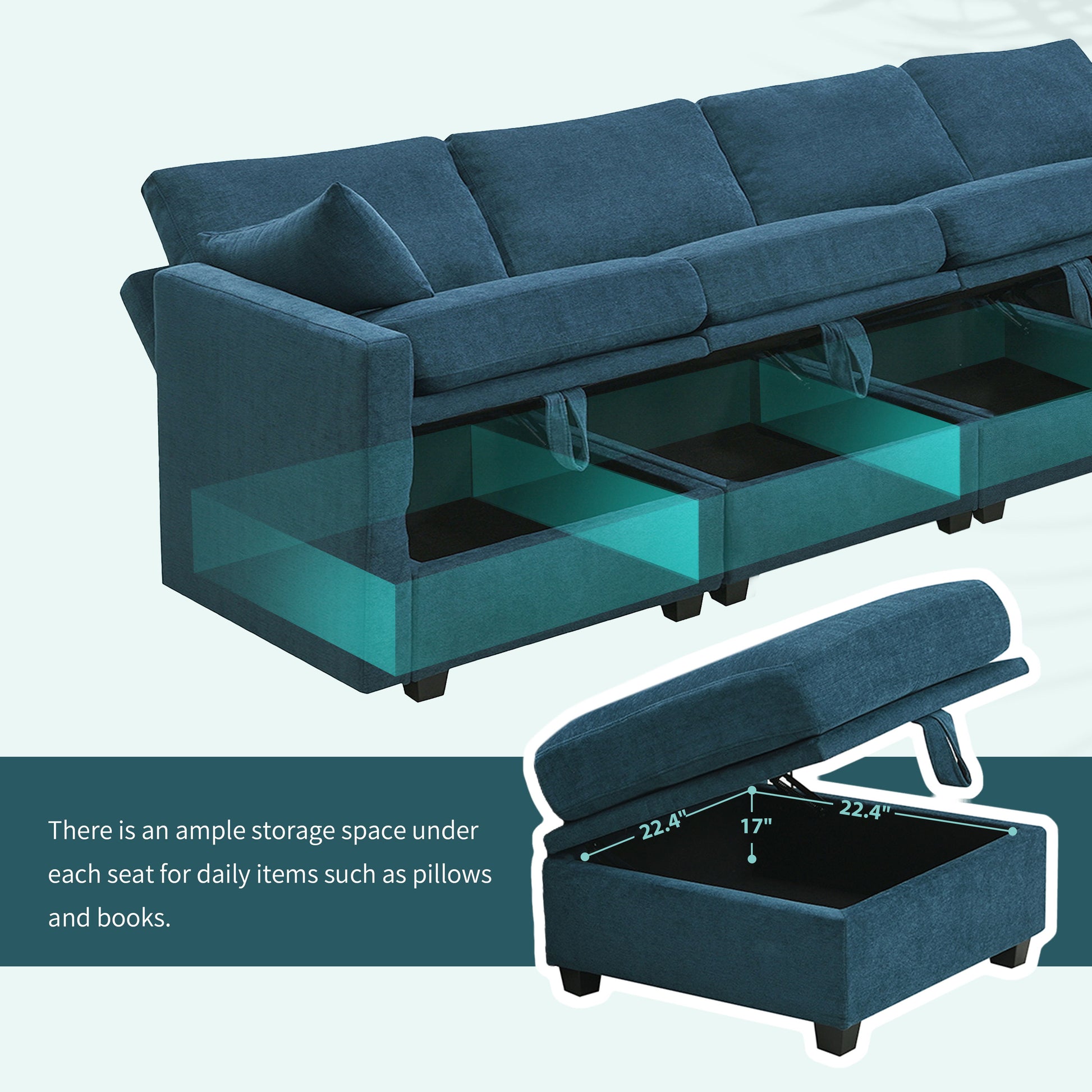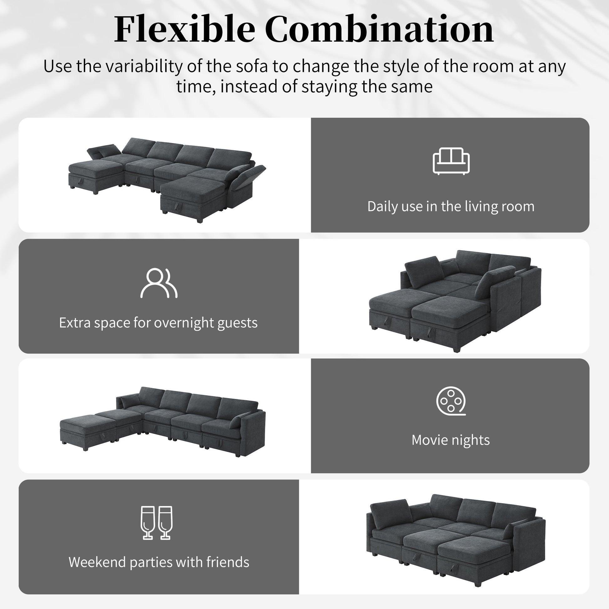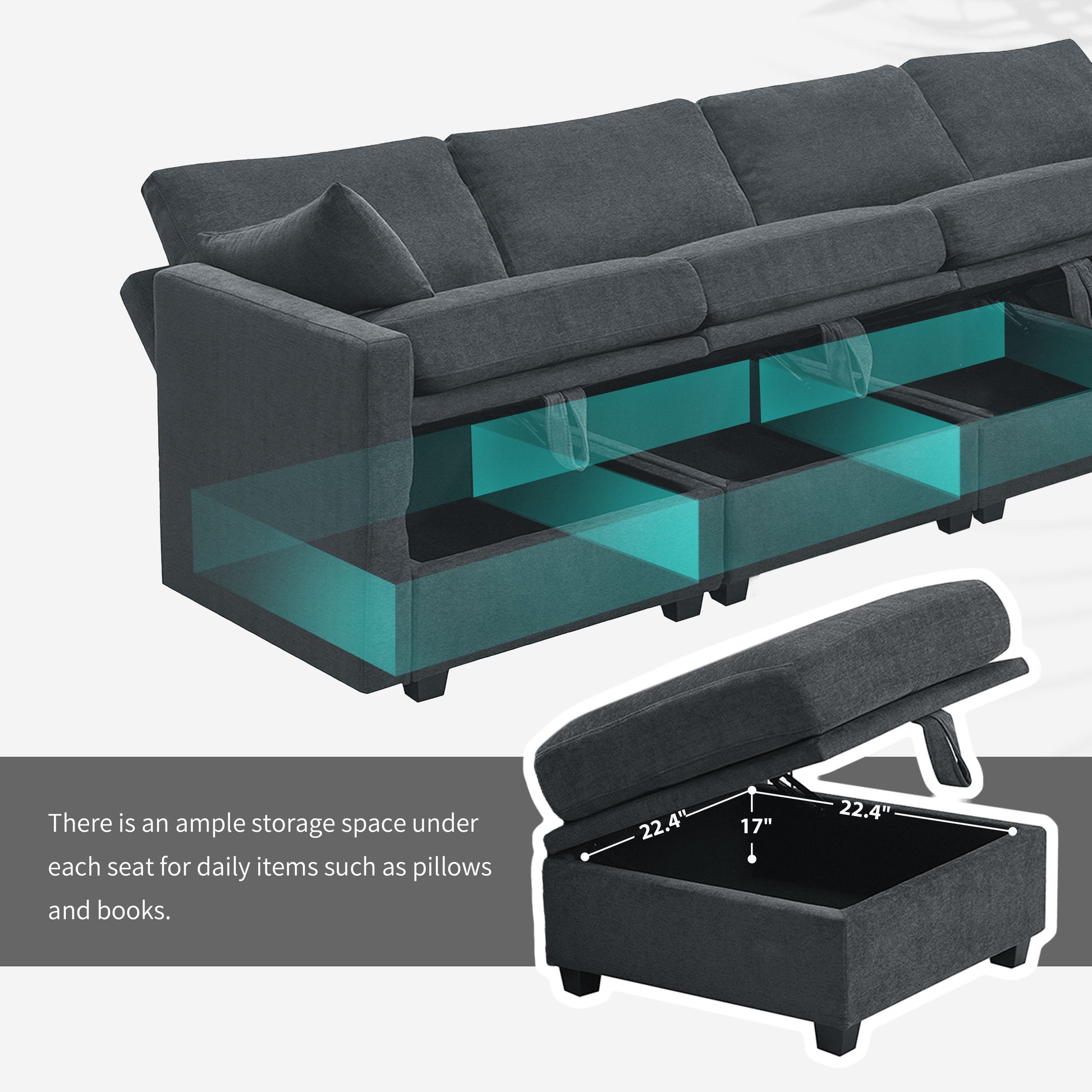Storage Function: Each seat of the 6-piece couch features storage space for toys, blankets, and remote controls, keeping the room organized. Flexible Combination: The u-shaped modular sofa allows for easy movement and re-matching of seats, providing convenience and versatility. Adjustable Comfort: Armrests and backrests can be adjusted to 3 positions, offering ergonomic support for neck, shoulders, and arms to relieve pressure. High Quality Materials: High density foam and pocket springs cushions ensure superior comfort whether sitting or lying down. Sturdy Construction: Solid wood frame and legs provide stability and durability, enhancing the overall comfort and longevity of the sofa.