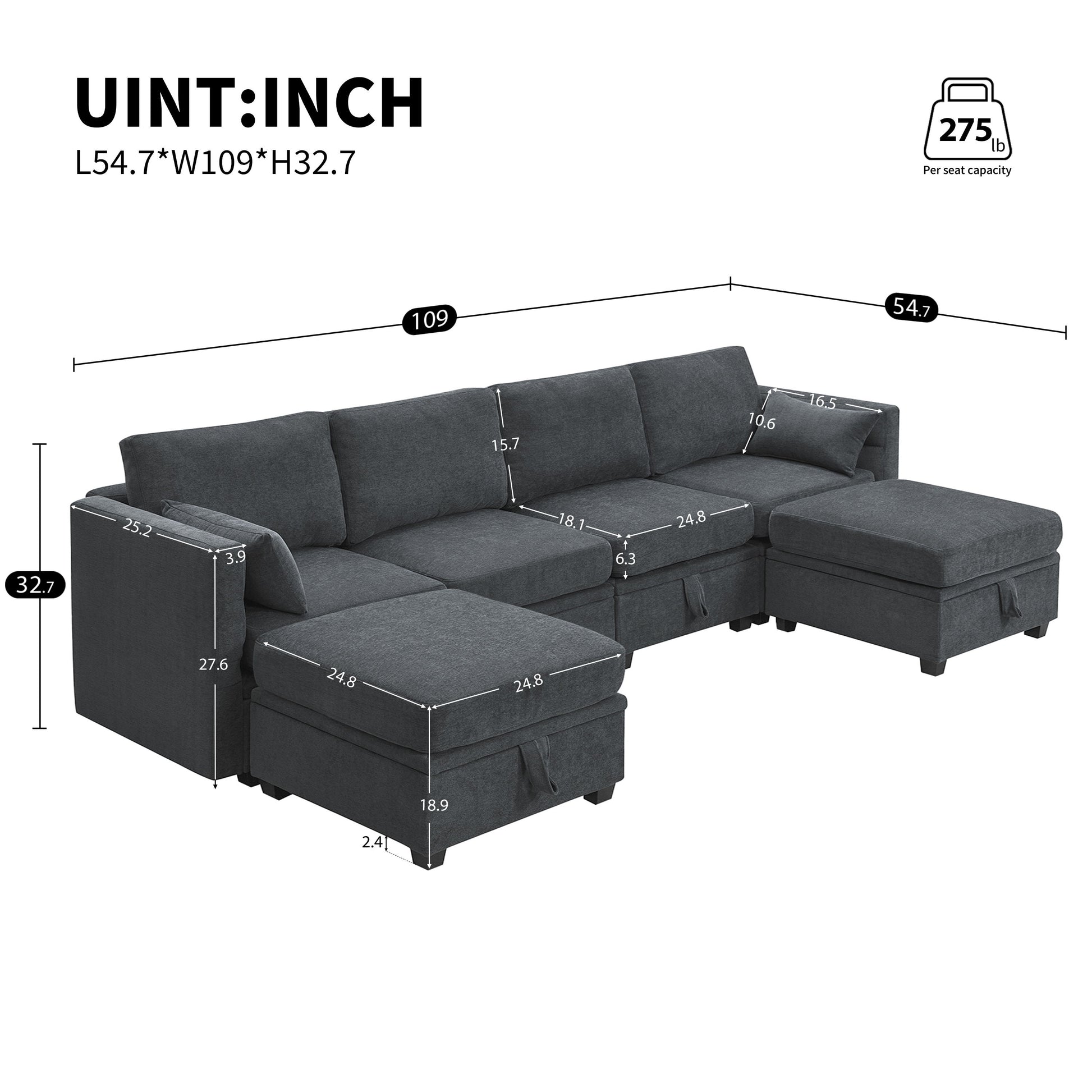 109.0"W x 54.7"D x 32.7"H - 282.19 lb