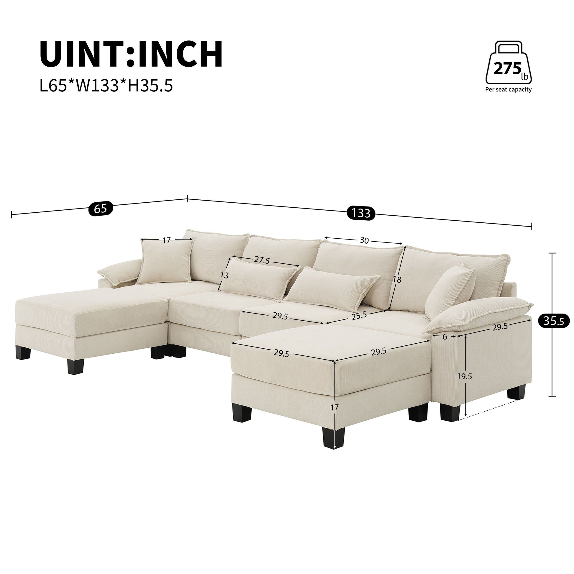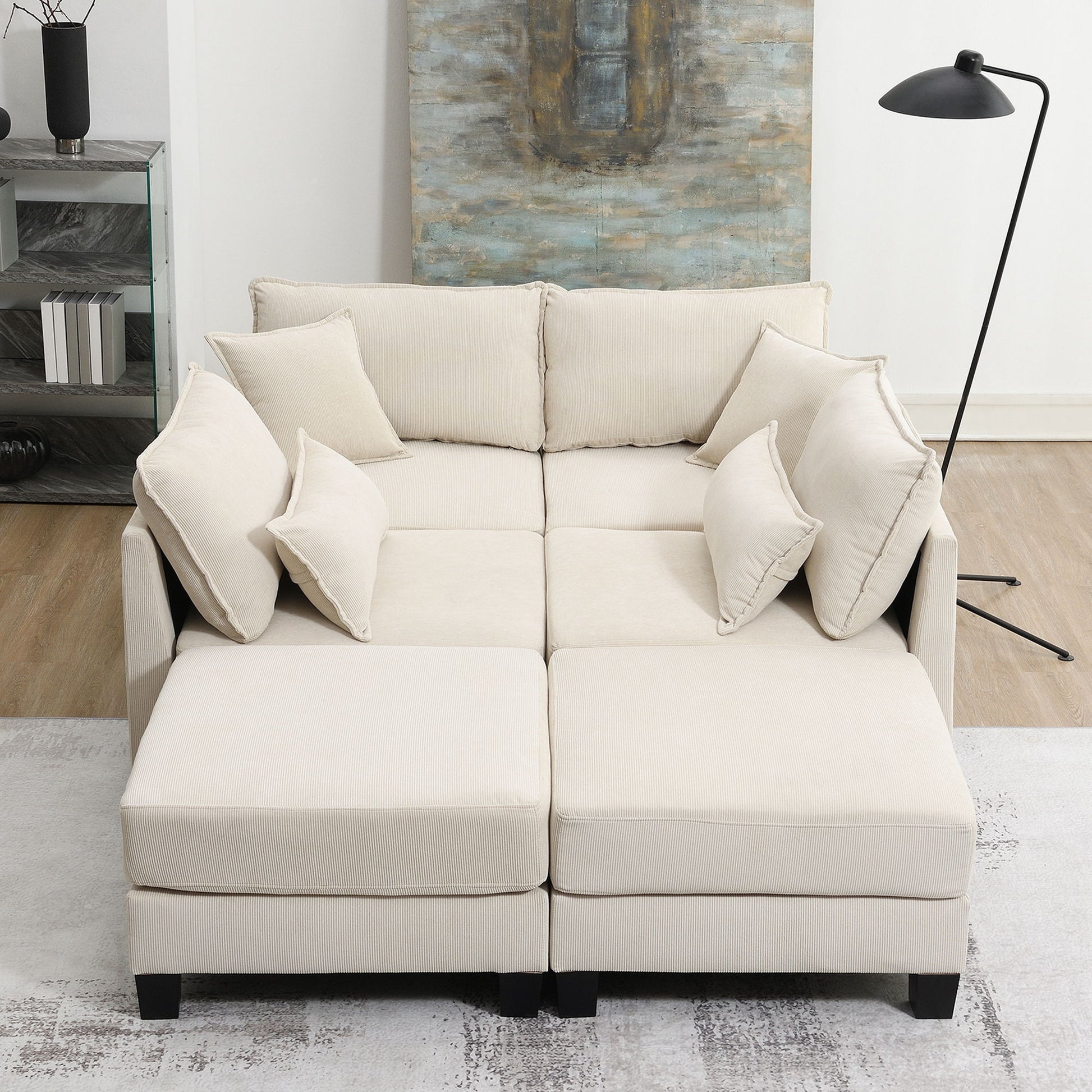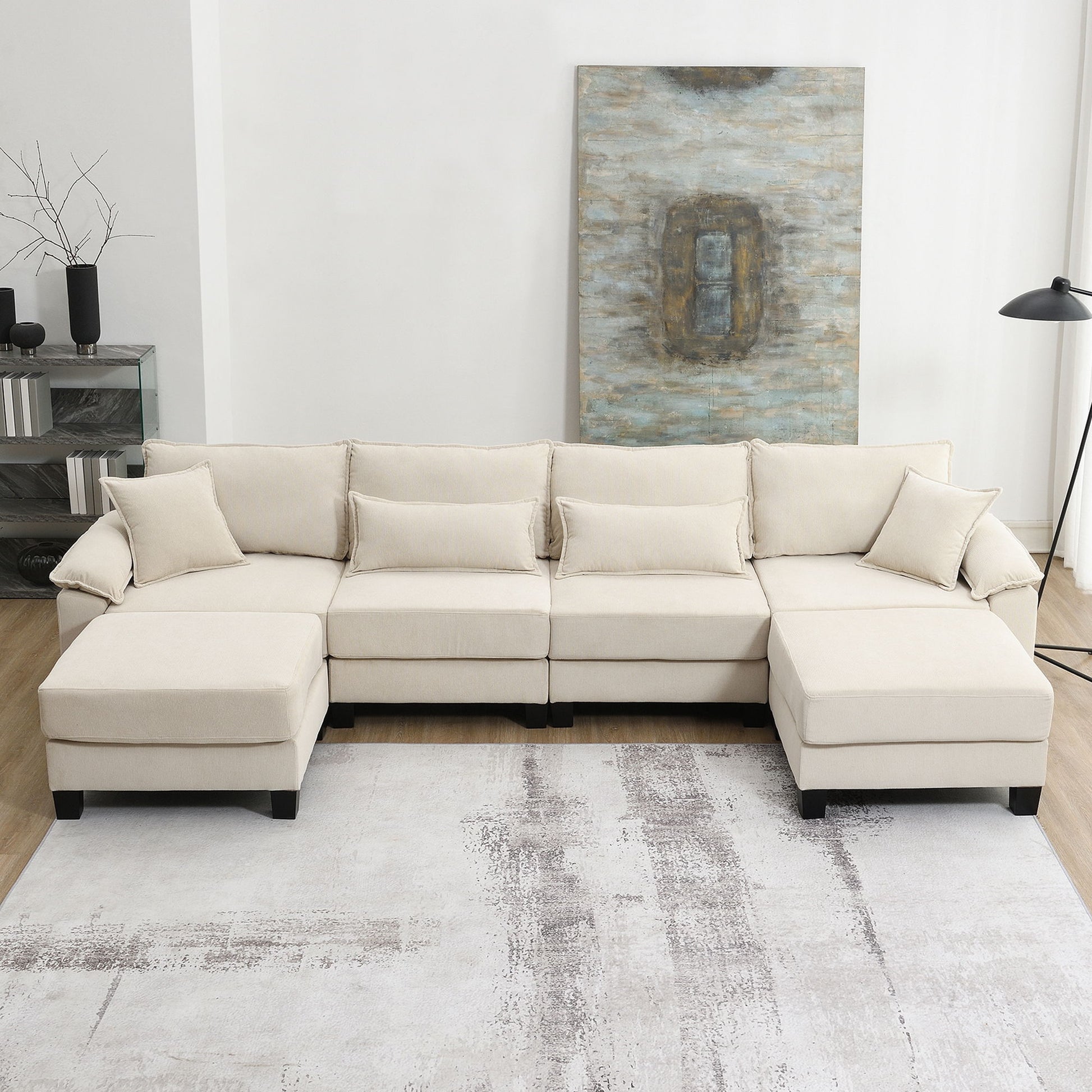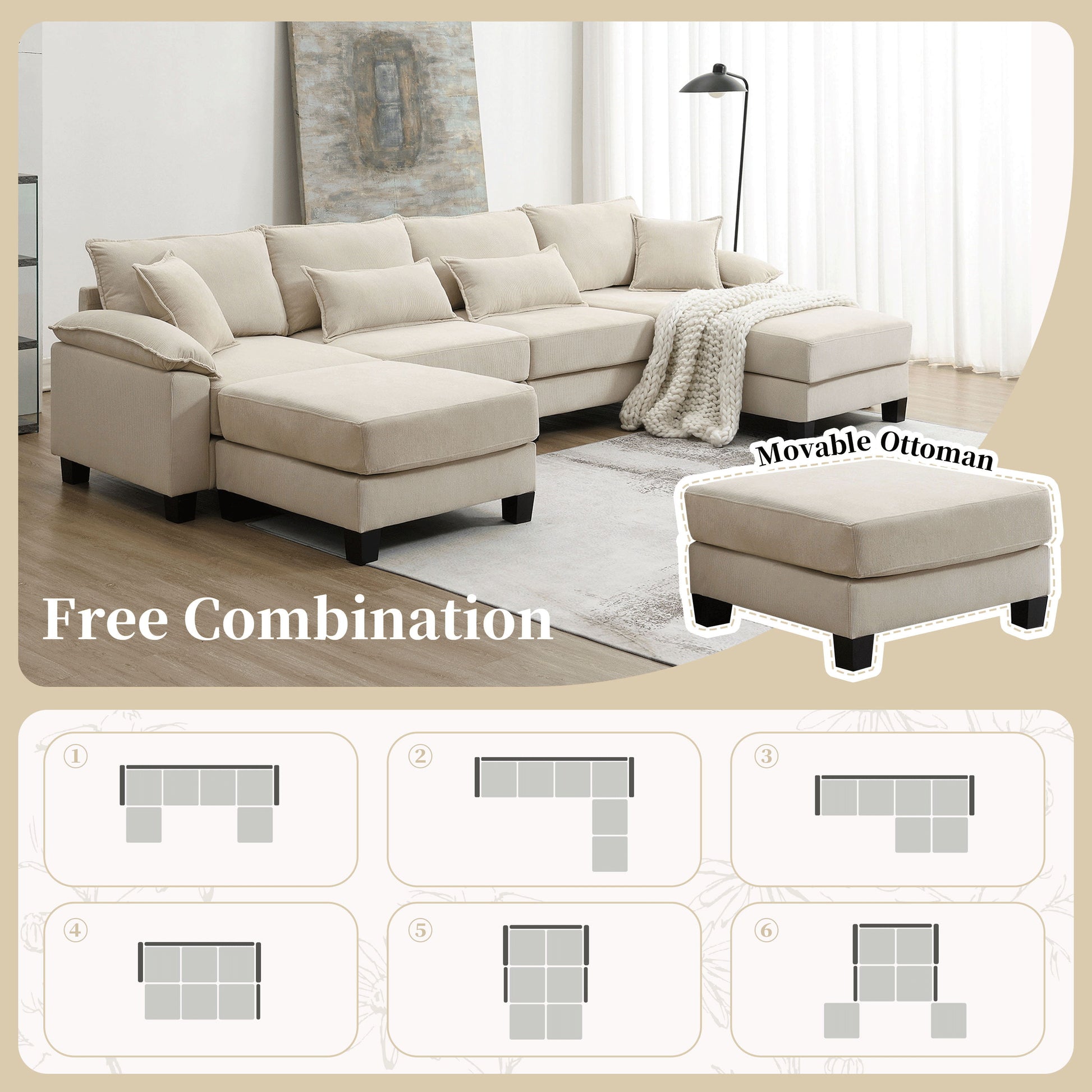 Corduroy Modular Sectional Sofa, U Shaped Couch With Armrest Bags, 6 Seat Freely Combinable Sofa Bed, Comfortable And Spacious Indoor Furniture For Living Room - Beige