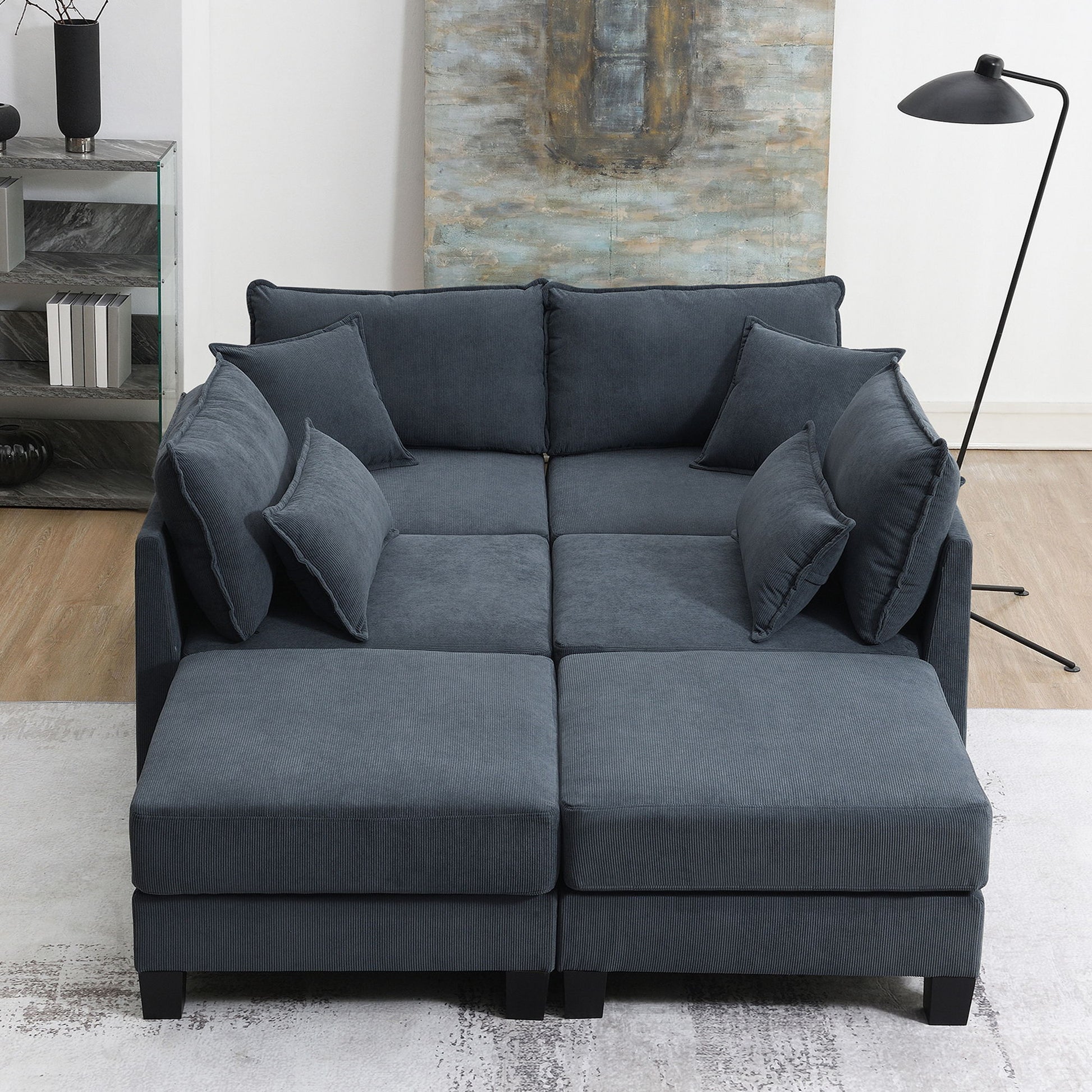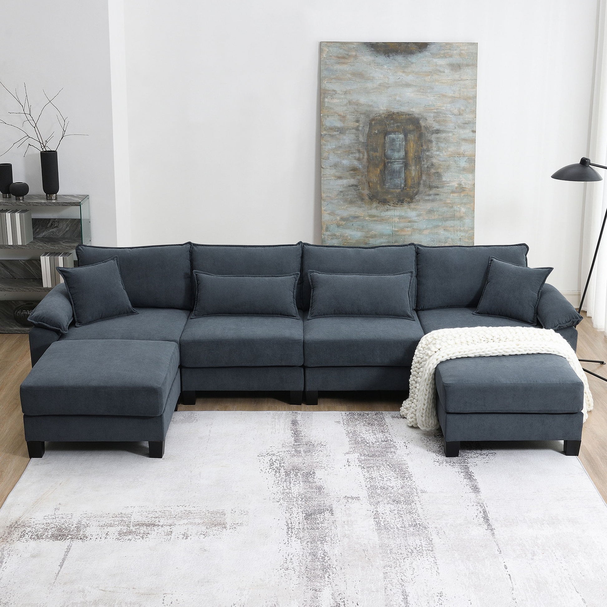 Corduroy Modular Sectional Sofa, U Shaped Couch With Armrest Bags, 6 Seat Freely Combinable Sofa Bed, Comfortable And Spacious Indoor Furniture For Living Room - Gray