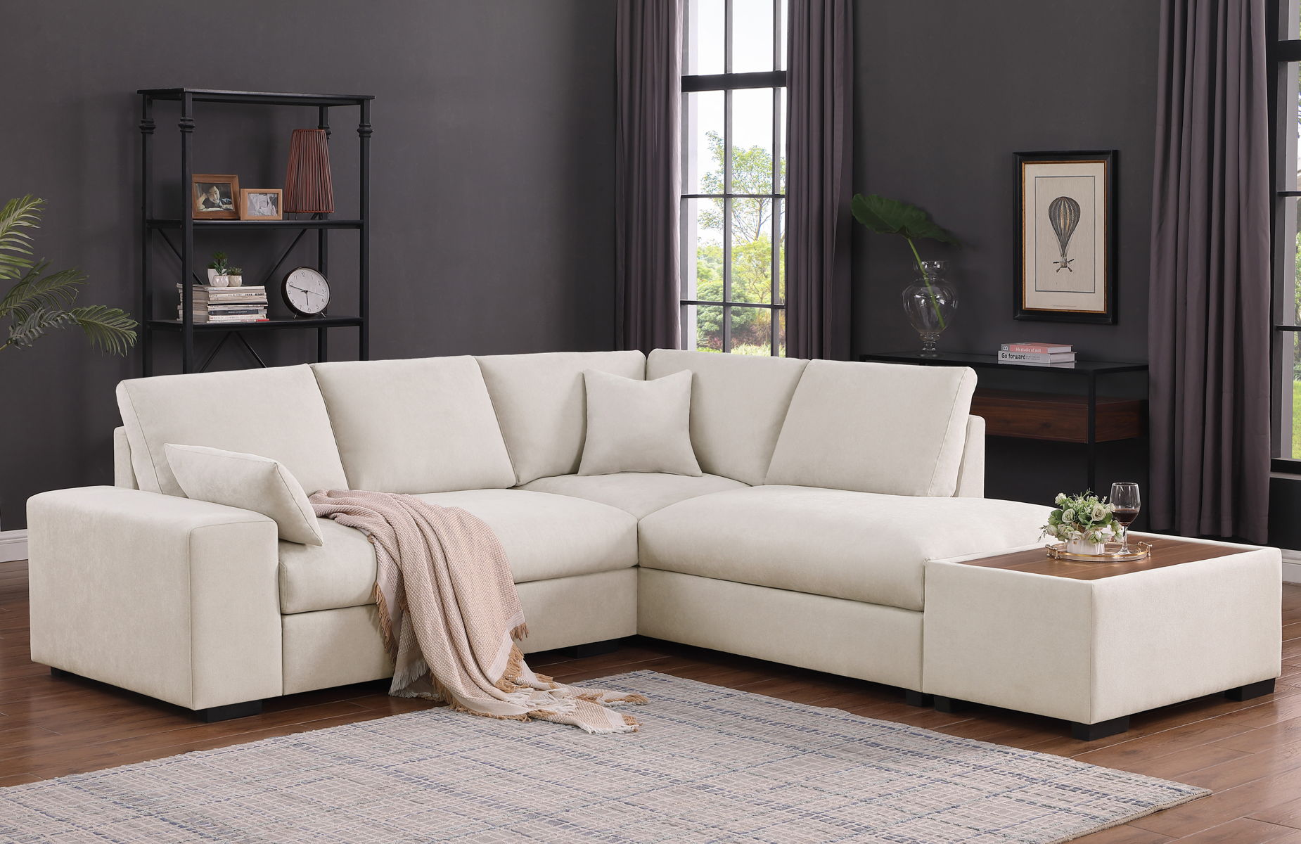 Joshua - 100"W Beige Woven Fabric Sectional Sofa With Right Facing Chaise and Console Ottoman
